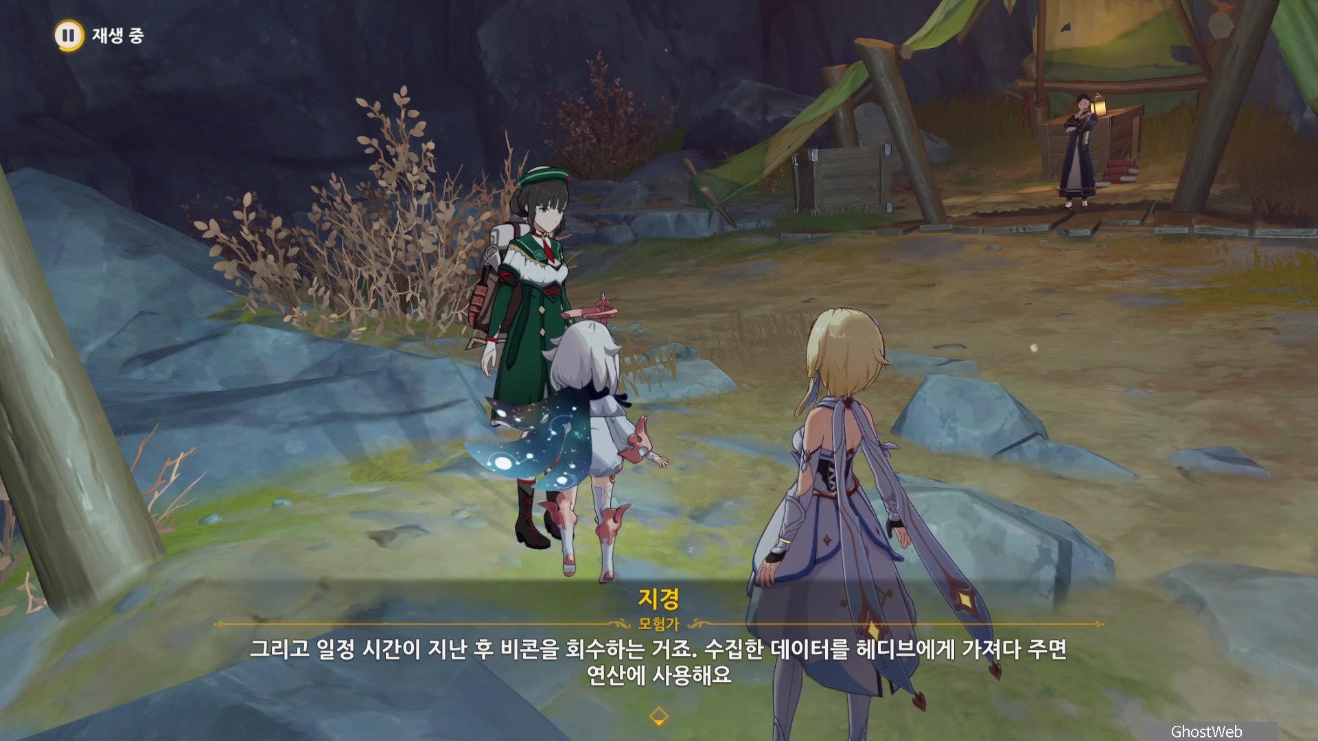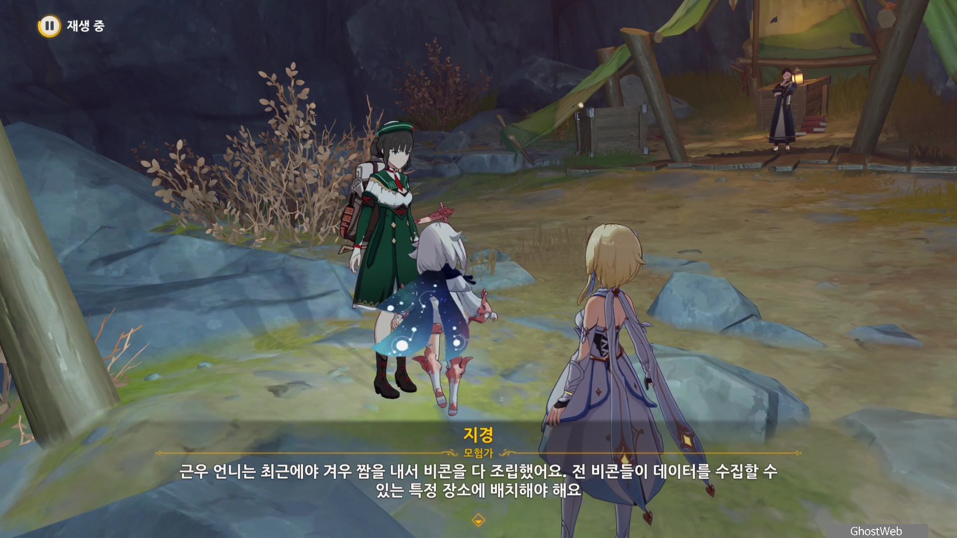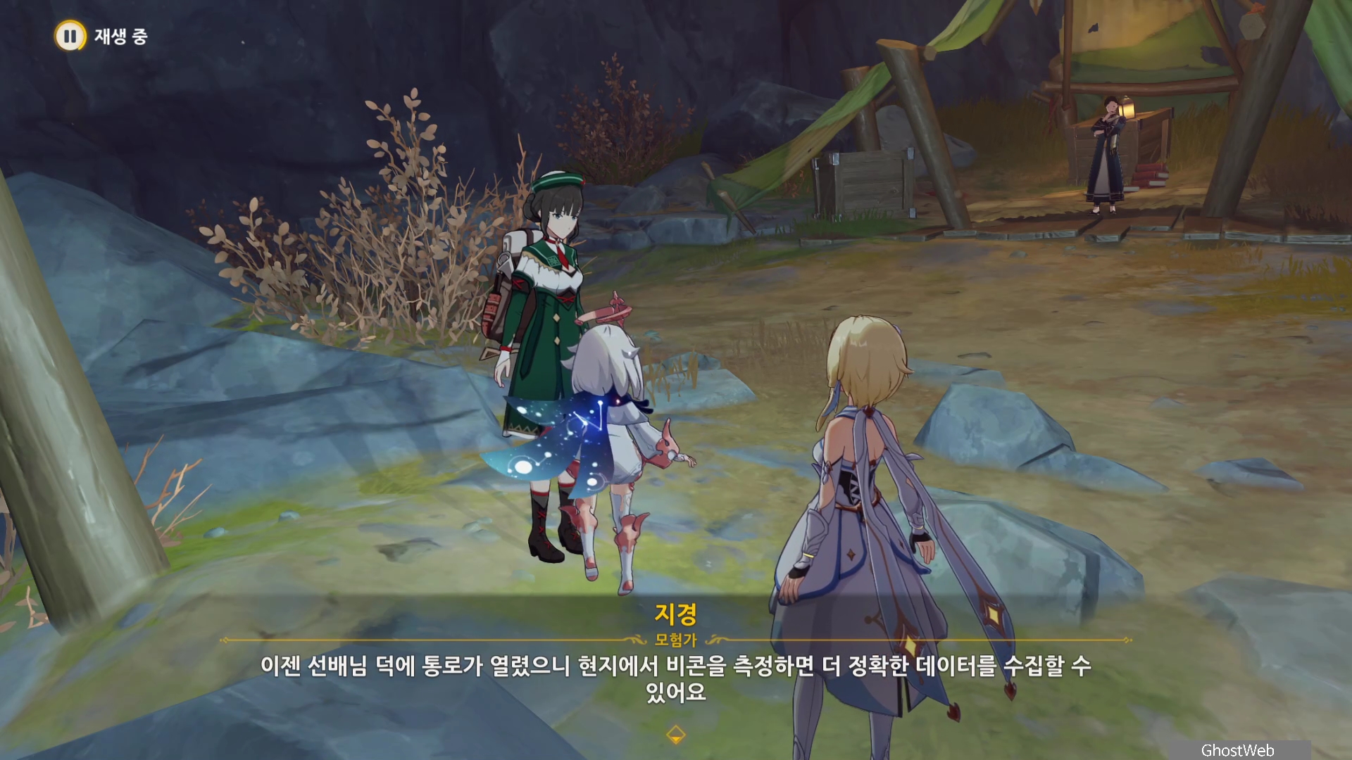 야영지에 있는 지경과 대화를 통해 데이터를 수집하기 위해 측정용 비콘을 설치하기 위해 여행자랑 함께 떠나요.