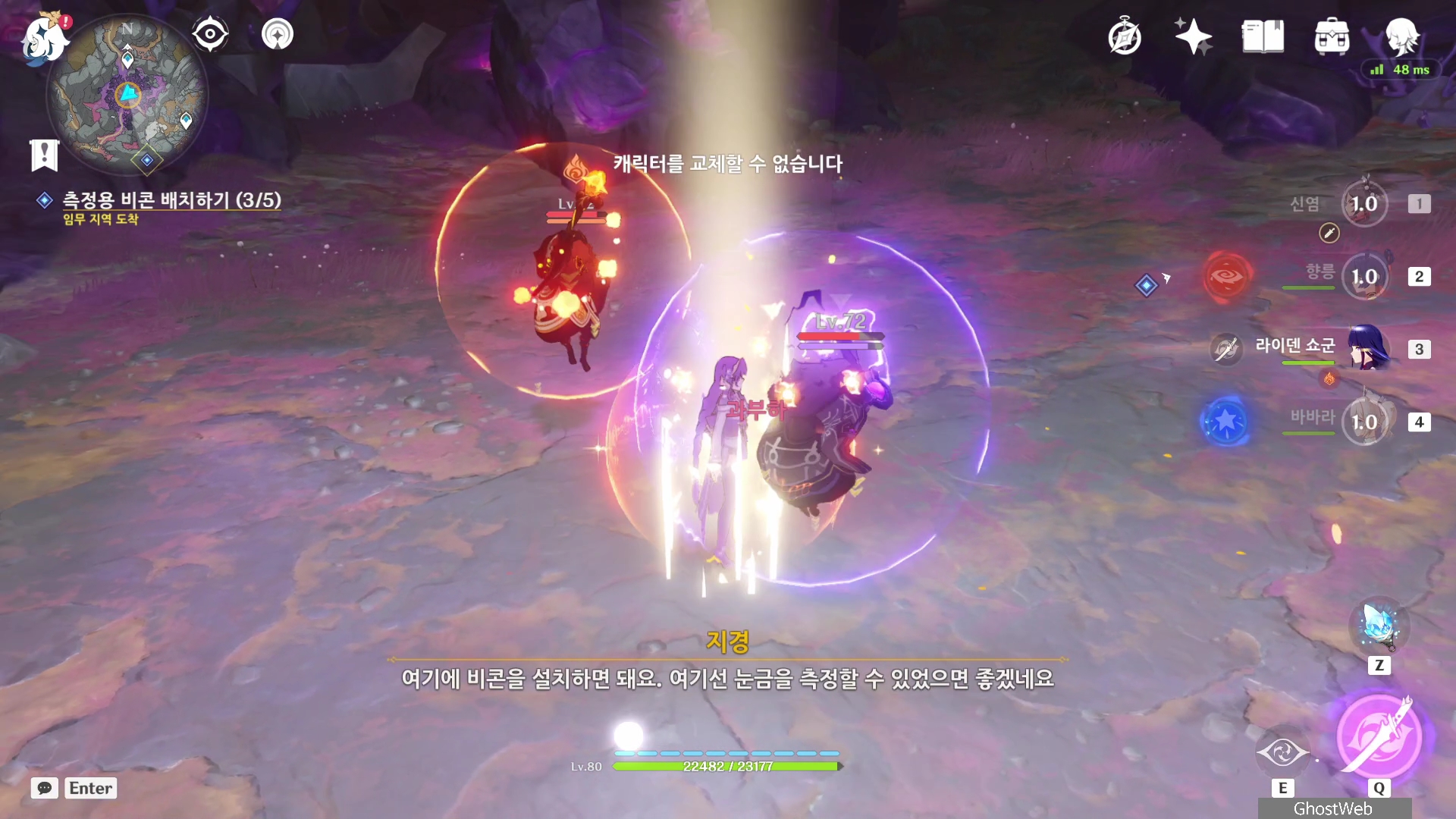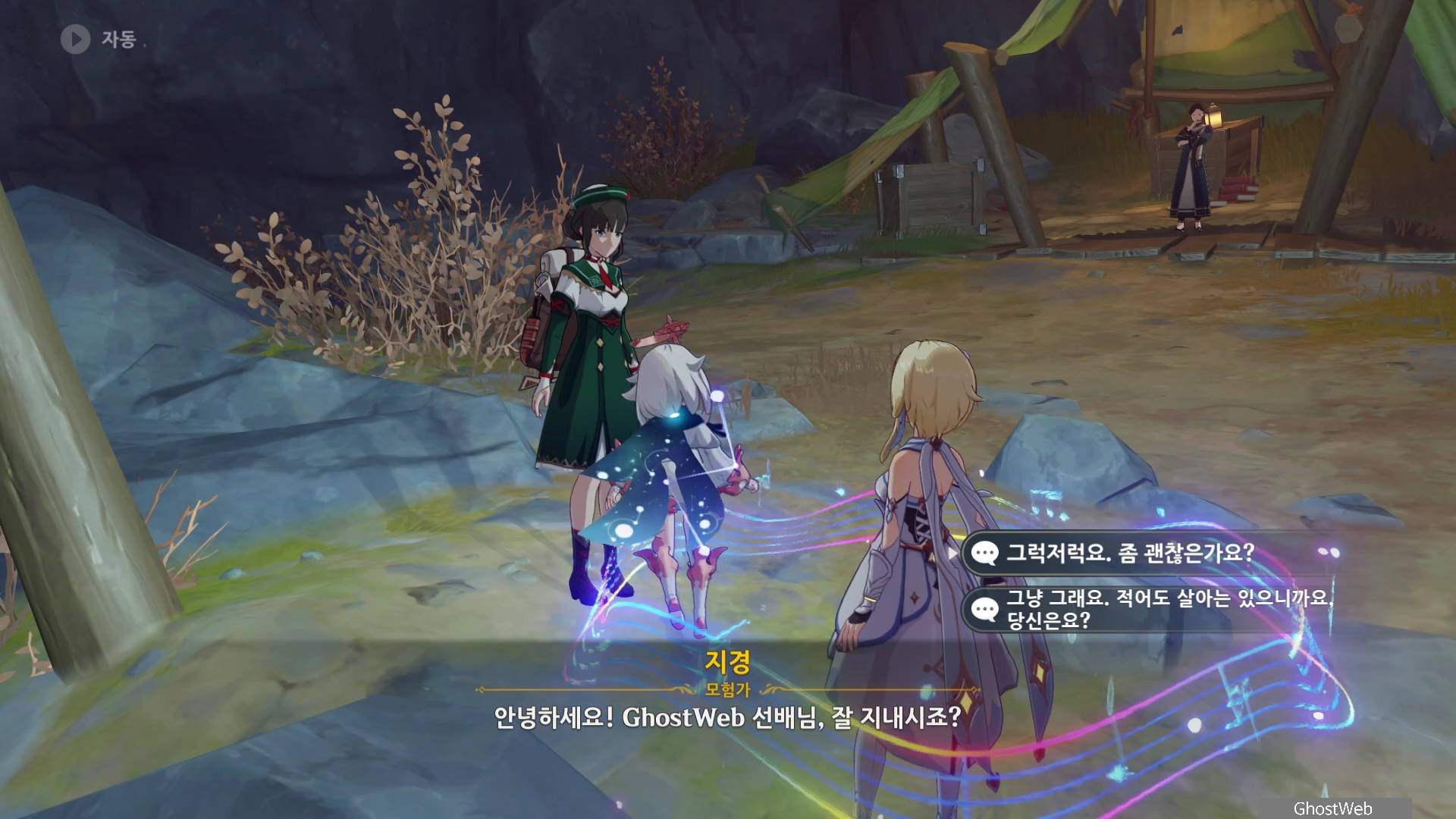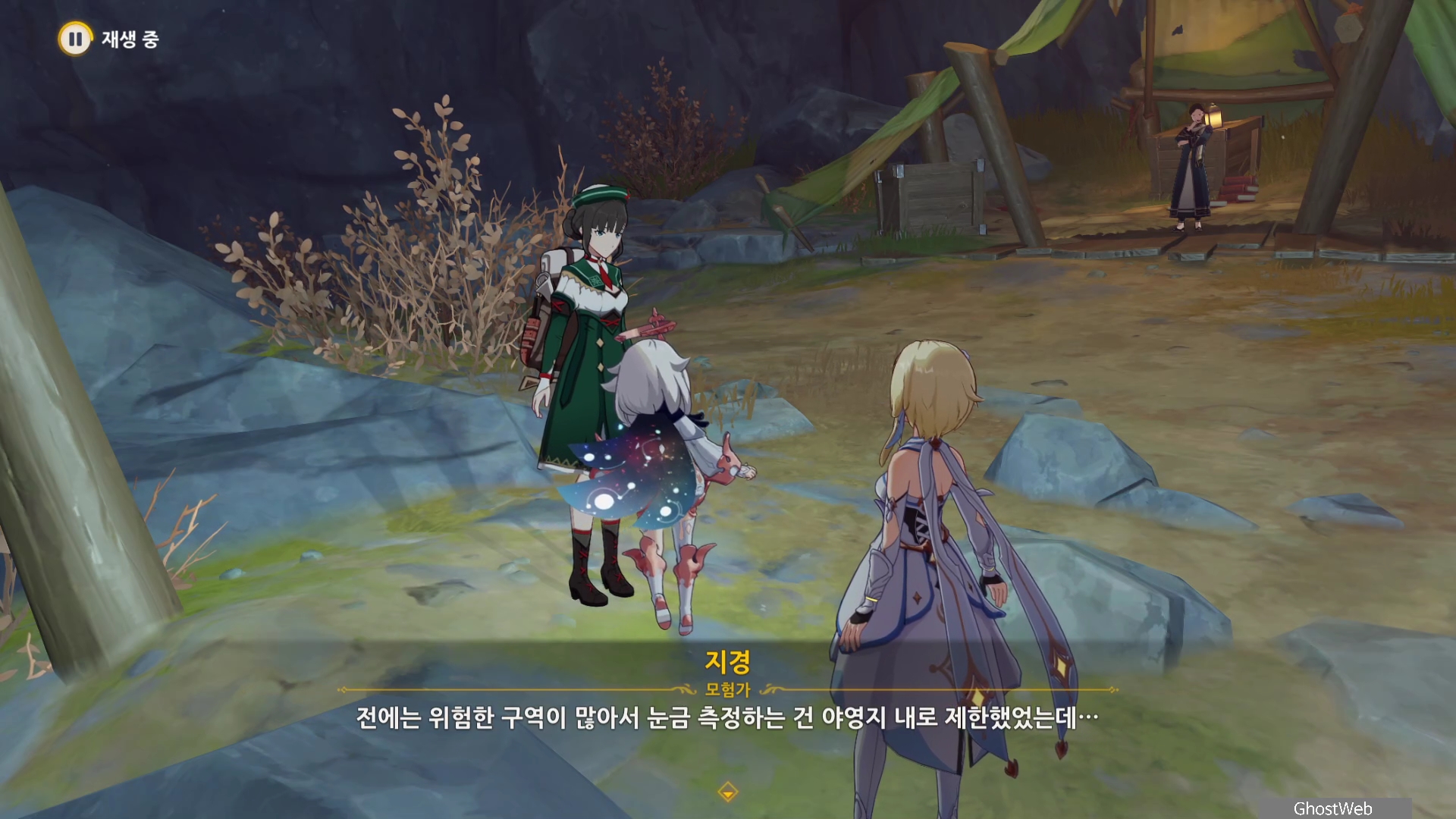 야영지에 있는 지경과 대화를 통해 데이터를 수집하기 위해 측정용 비콘을 설치하기 위해 여행자랑 함께 떠나요.