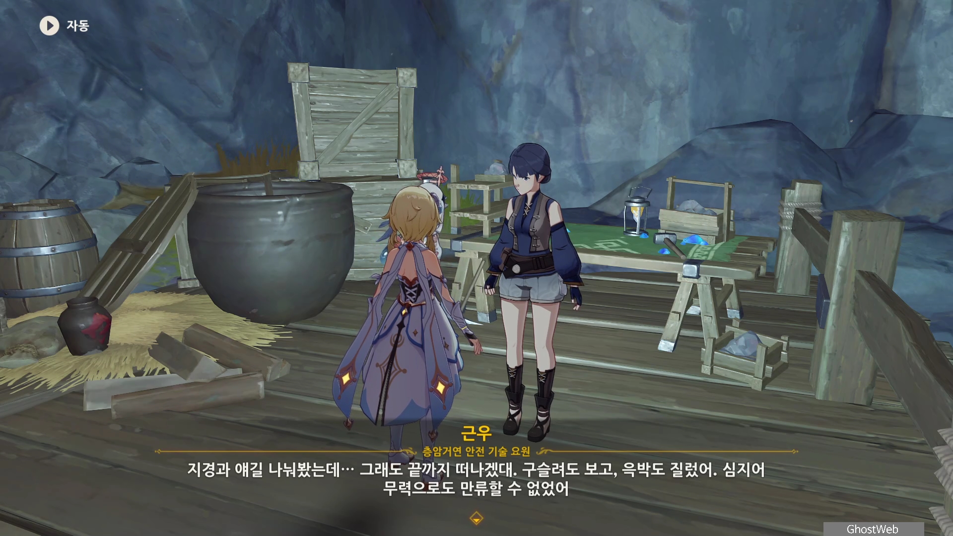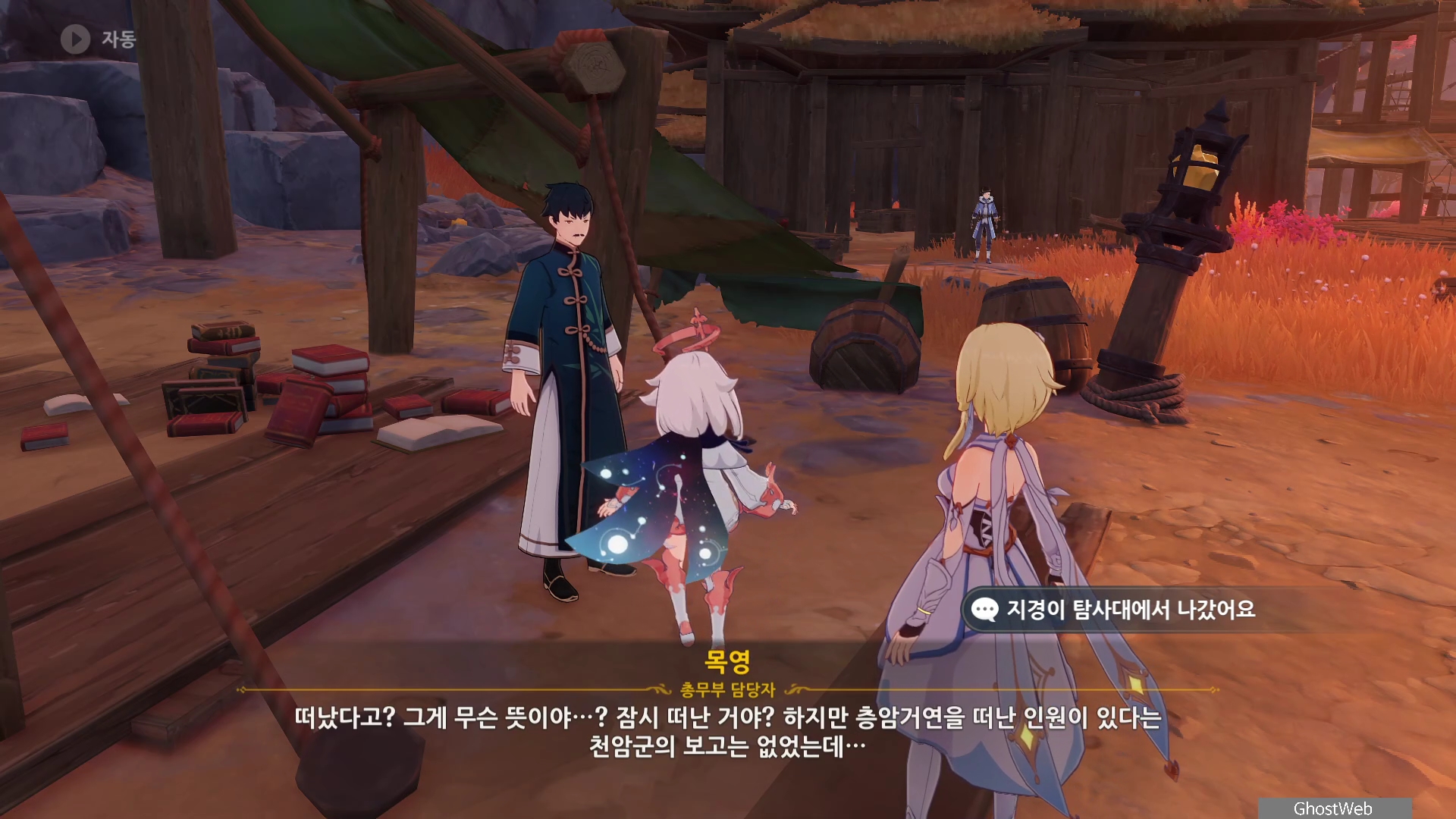 다음 날 야영지 한 편에 있는 근우와 대화를 통해 지경이 팀을 떠났다며, 층암거연 입구에 있는 목영에게 이 사실을 전달해달라고 부탁해요.
