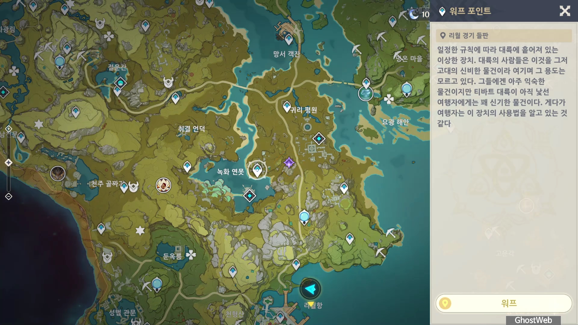 이번에는 식자재인 연꽃받침을 채집할 수 있는 위치와 요리에 대해서 알아보도록 할게요. ○ 위치 연꽃받침은 강가와 호수 등과 리월항의 옥경대 연못에서도 얻을 수 있어요. 지도의 각 번호는