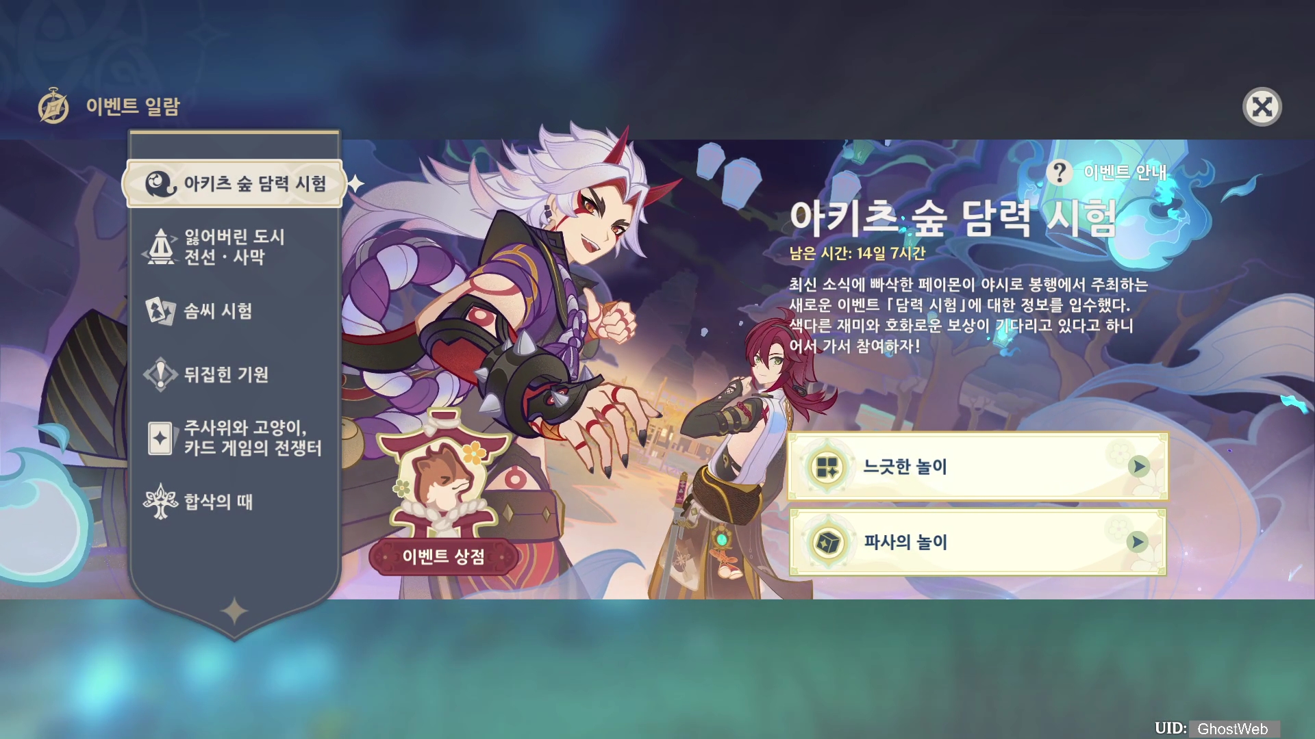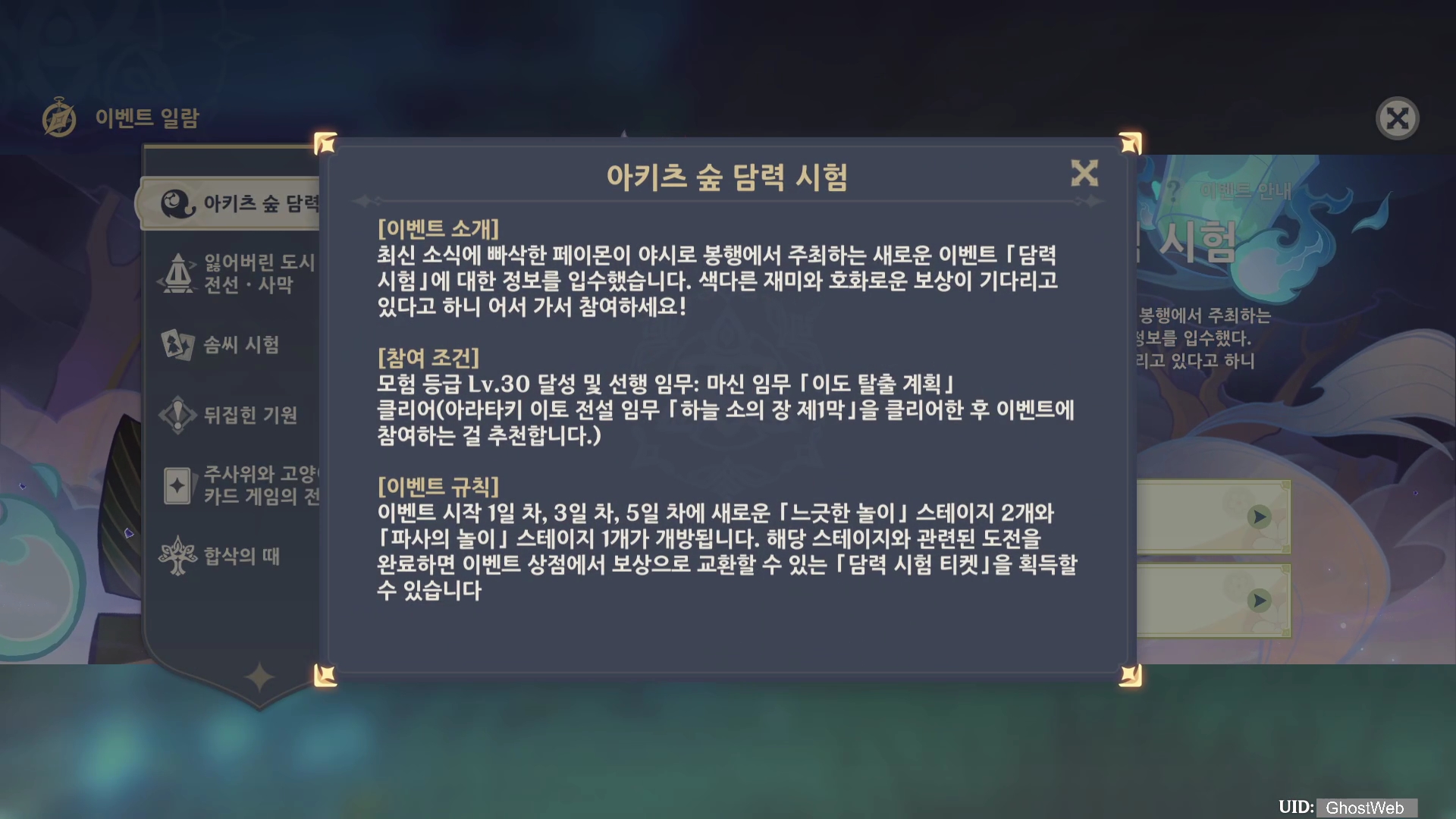 2022년 12월에 진행된 <담력시험> 이벤트는 이나즈마에서 카미사토 아야토가 제안한 이벤트로 스토리와 게임 내의 미니 게임을 통해 포인트를 획득하여 포상을 획득할 수 있어요.
