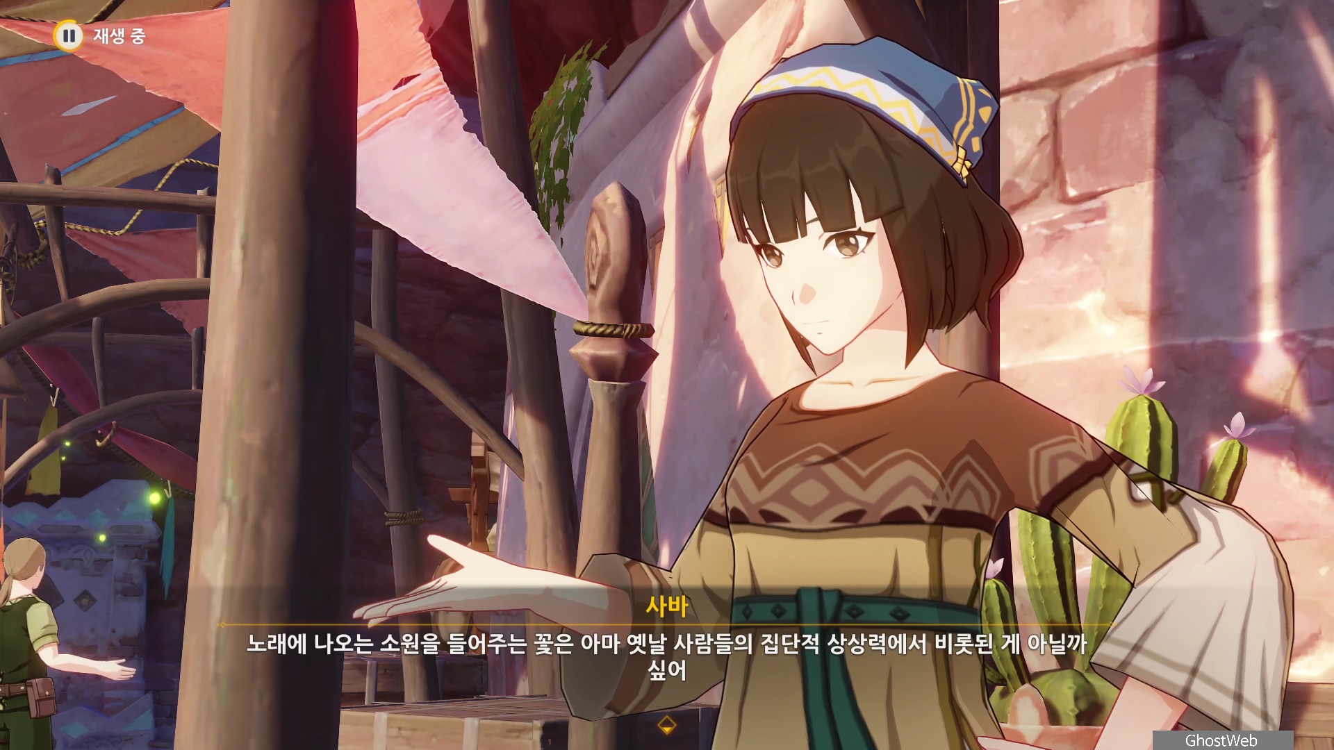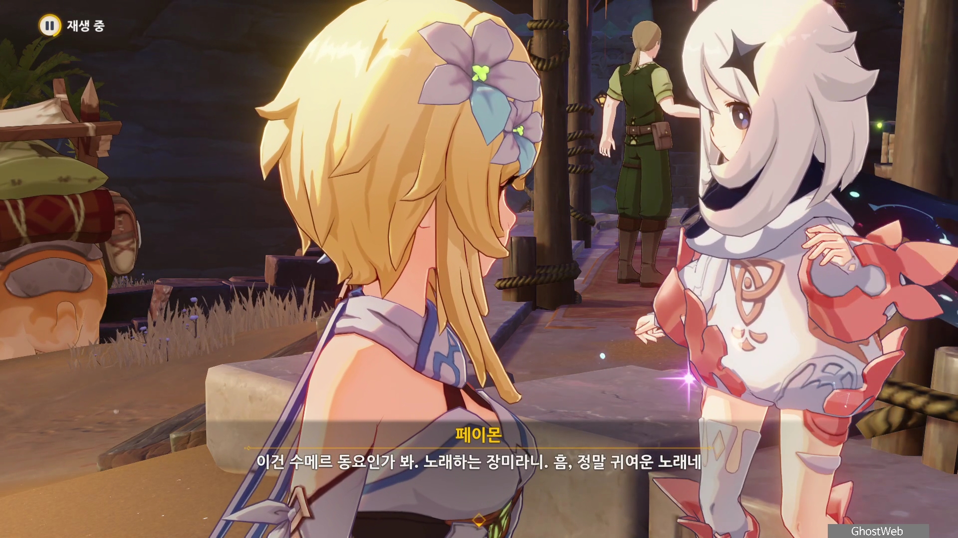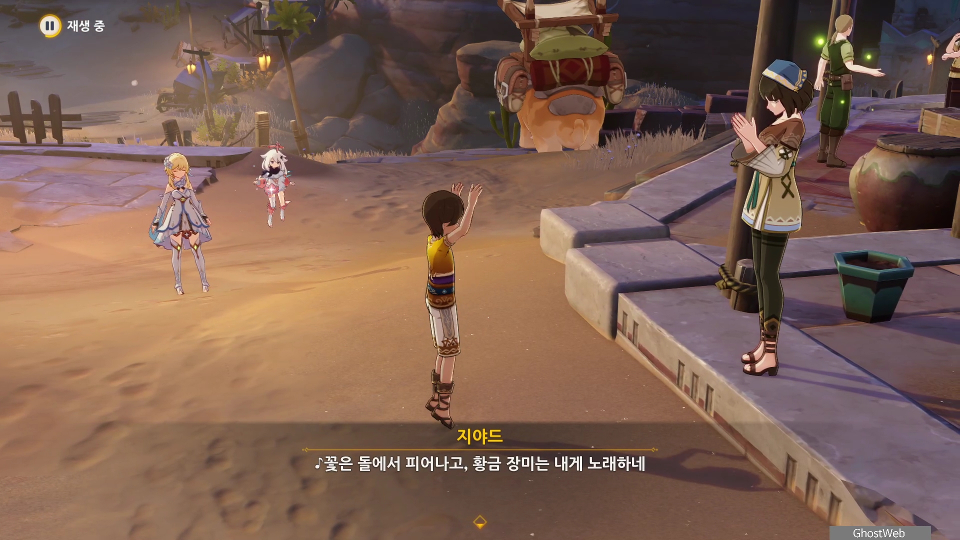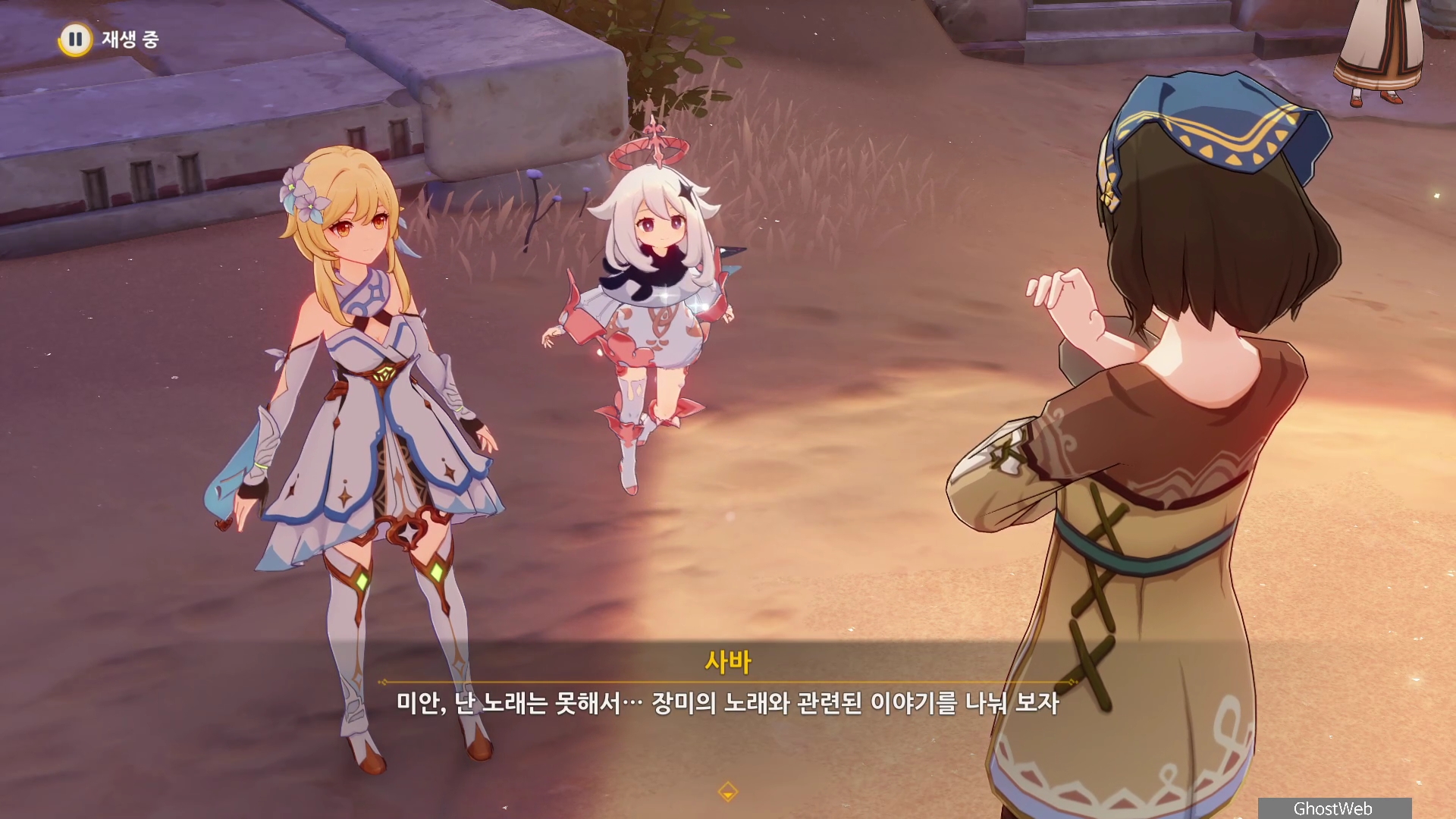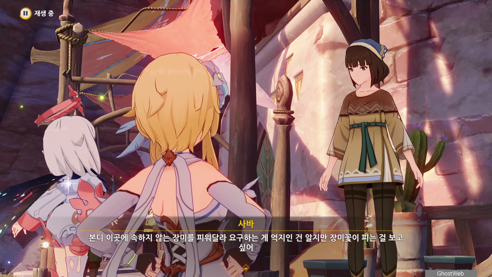 장미의 노래를 듣고 싶다는 페이몬의 말에 노래를 못해서 못 들려준다며 장미의 노래에 관련한 이야기를 나누는데, 아카데이마처럼 큰 도서관이 없어 노래는 다 구전으로 전해진다면서, 노래에 나오는 소원을 들어주는 꽃은 사막 같이 극한의 환경에서 옛날 사람들의 상상력에서 비록되어 삶에 대한 바람이 담겨져 있다고 하네요.