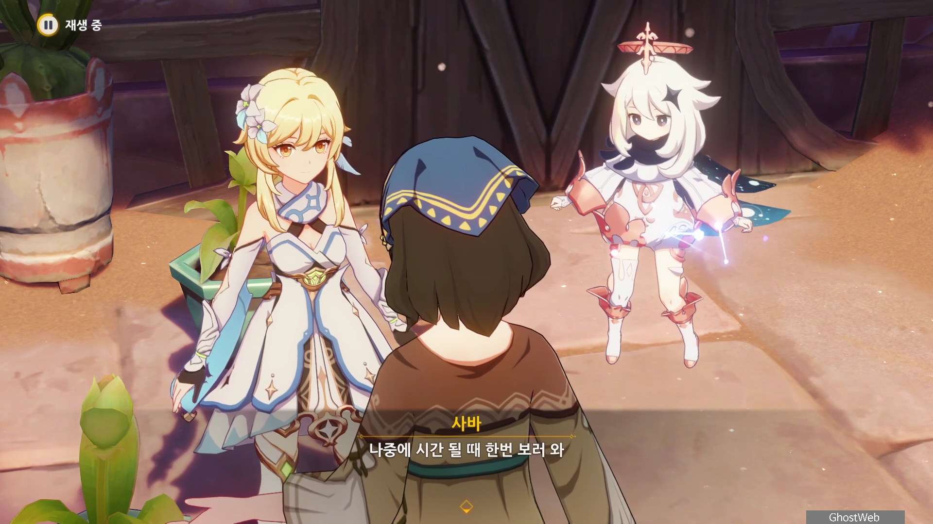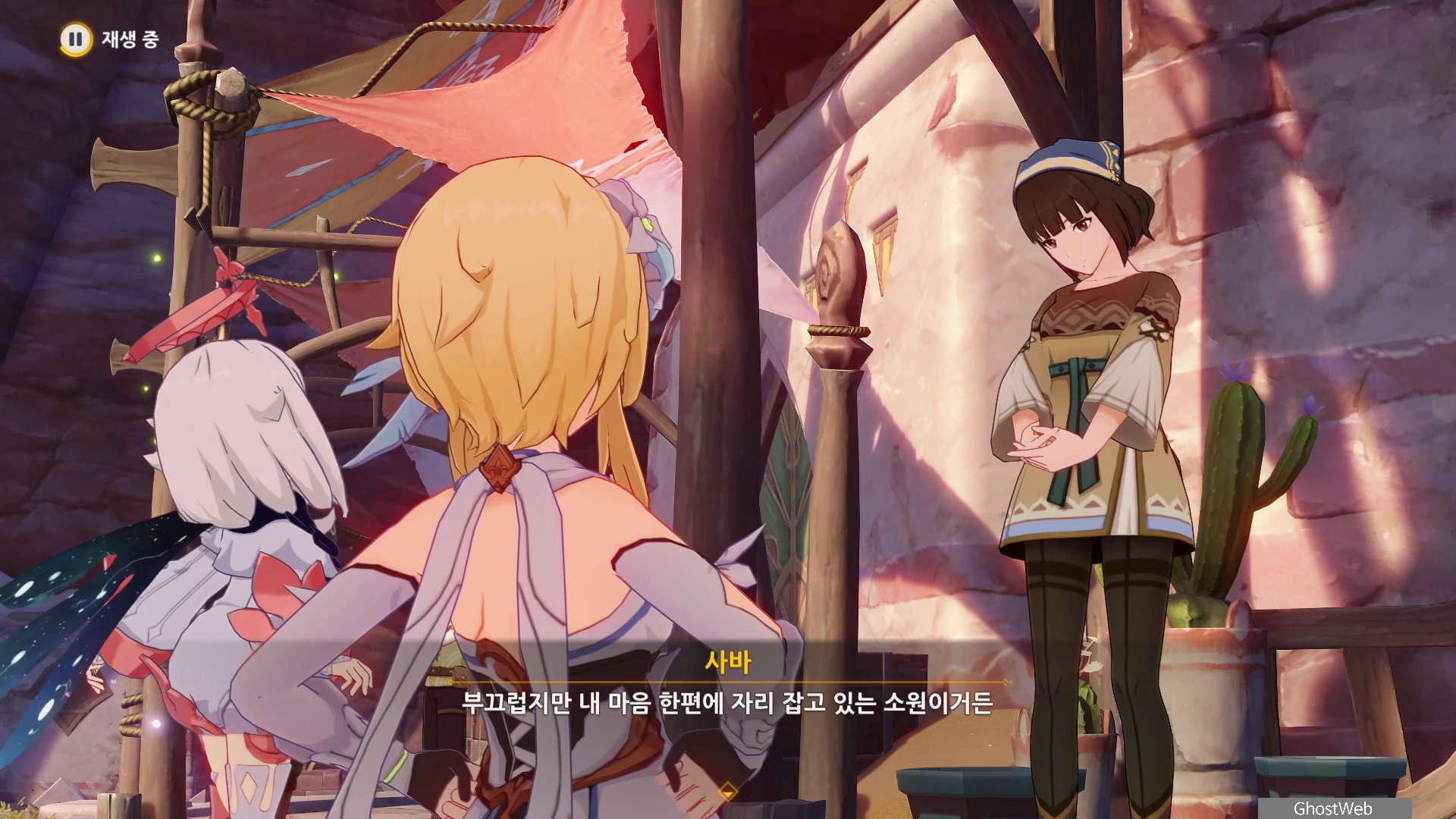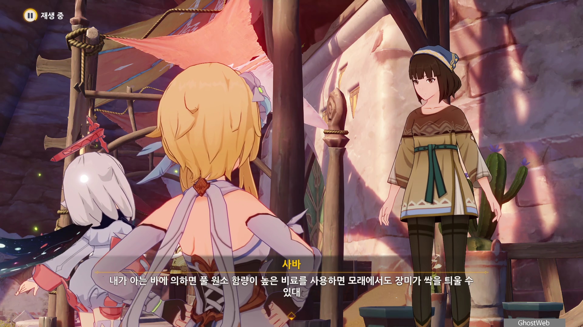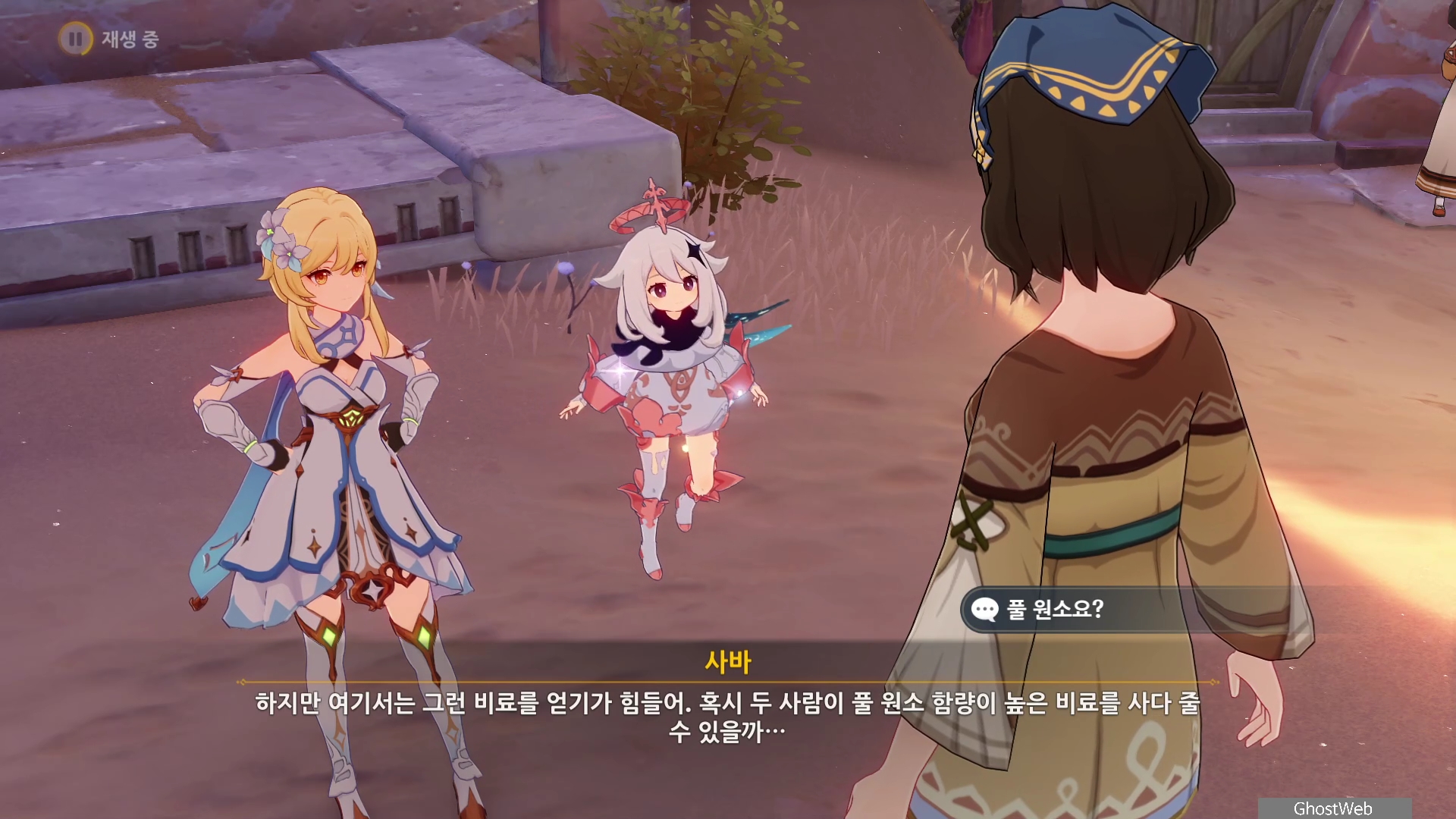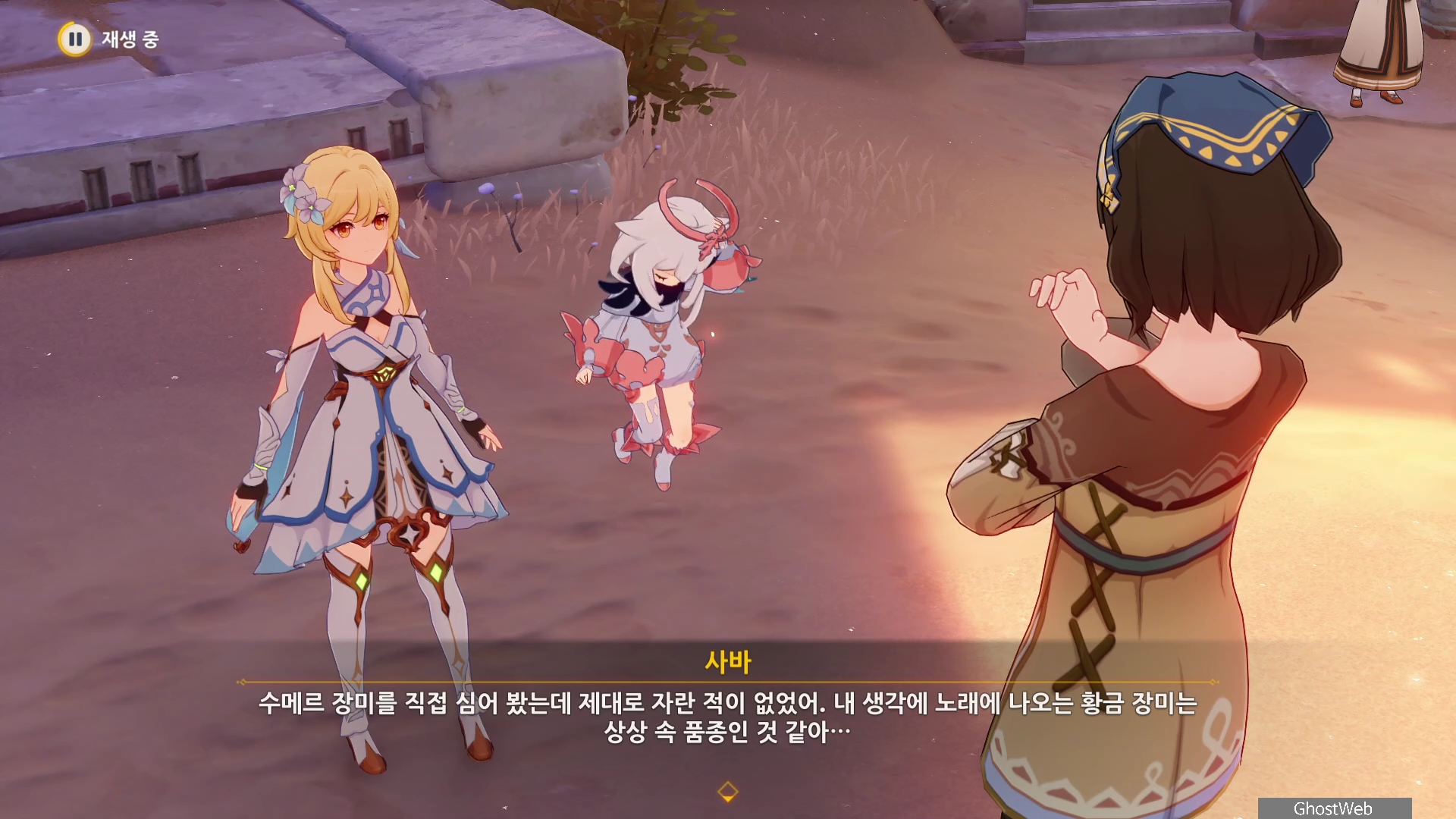장미의 노래를 듣고 싶다는 페이몬의 말에 노래를 못해서 못 들려준다며 장미의 노래에 관련한 이야기를 나누는데, 아카데이마처럼 큰 도서관이 없어 노래는 다 구전으로 전해진다면서, 노래에 나오는 소원을 들어주는 꽃은 사막 같이 극한의 환경에서 옛날 사람들의 상상력에서 비록되어 삶에 대한 바람이 담겨져 있다고 하네요.