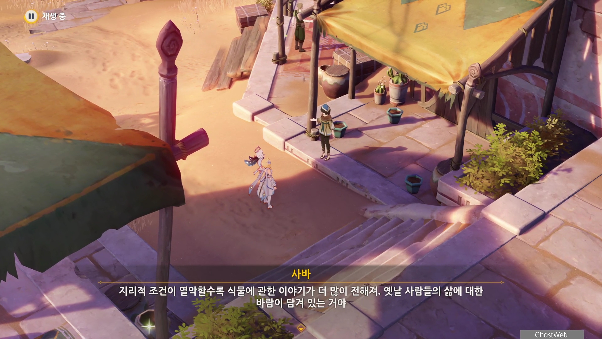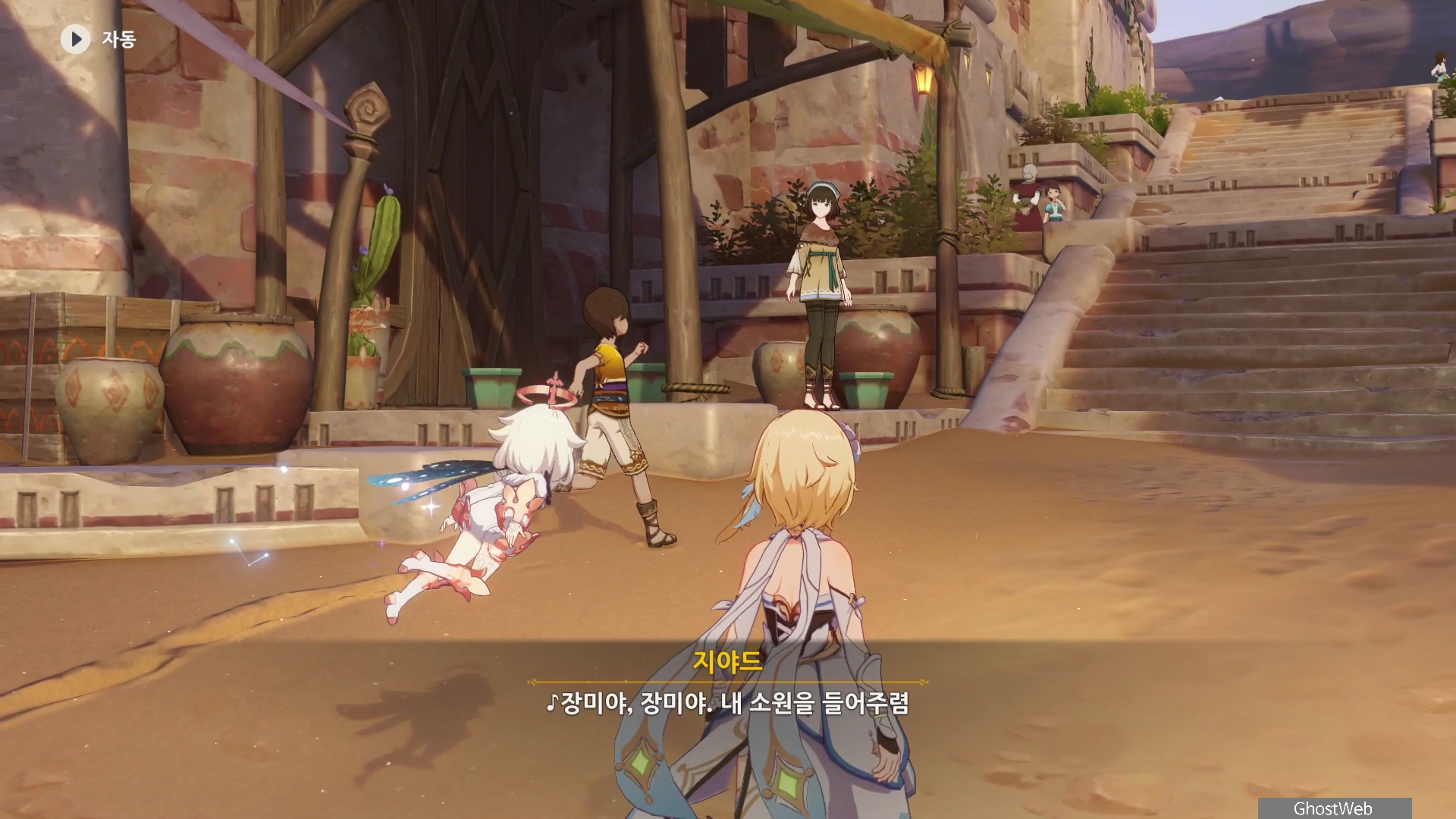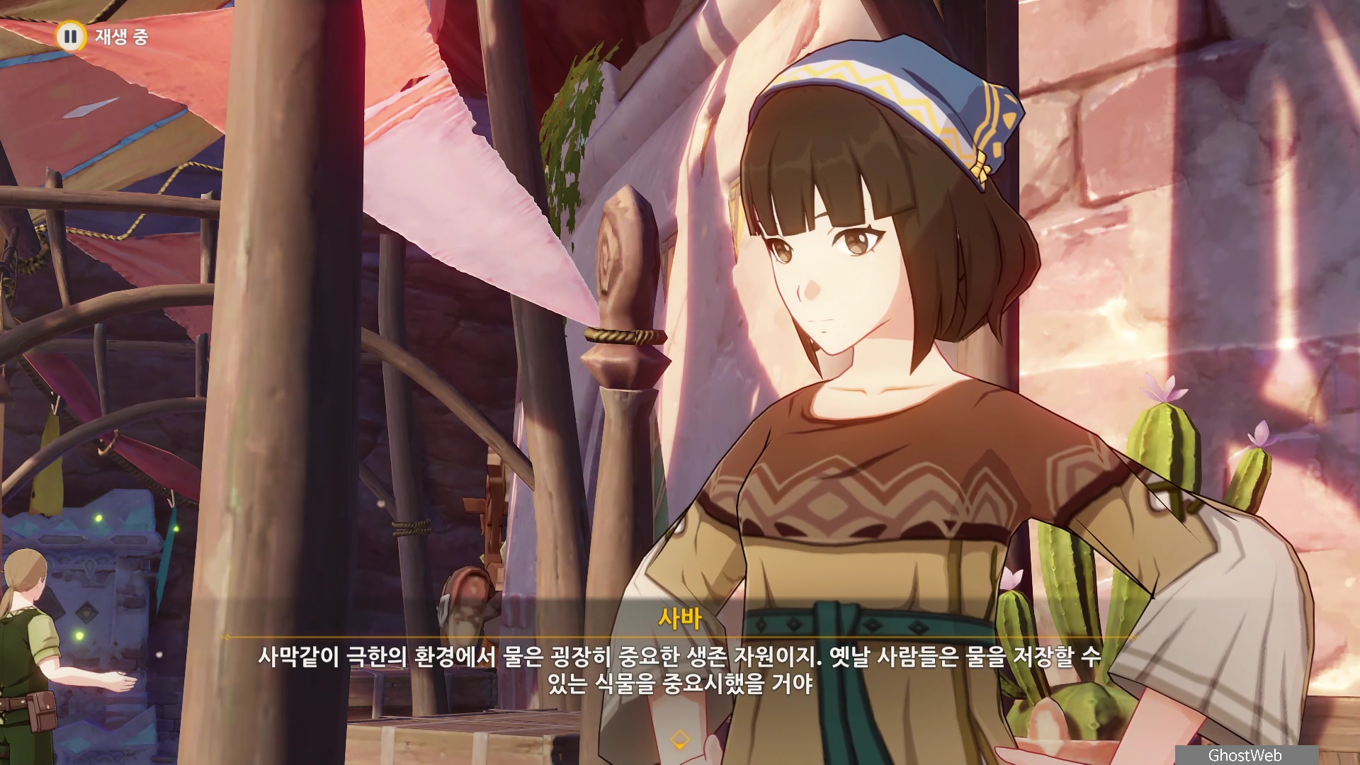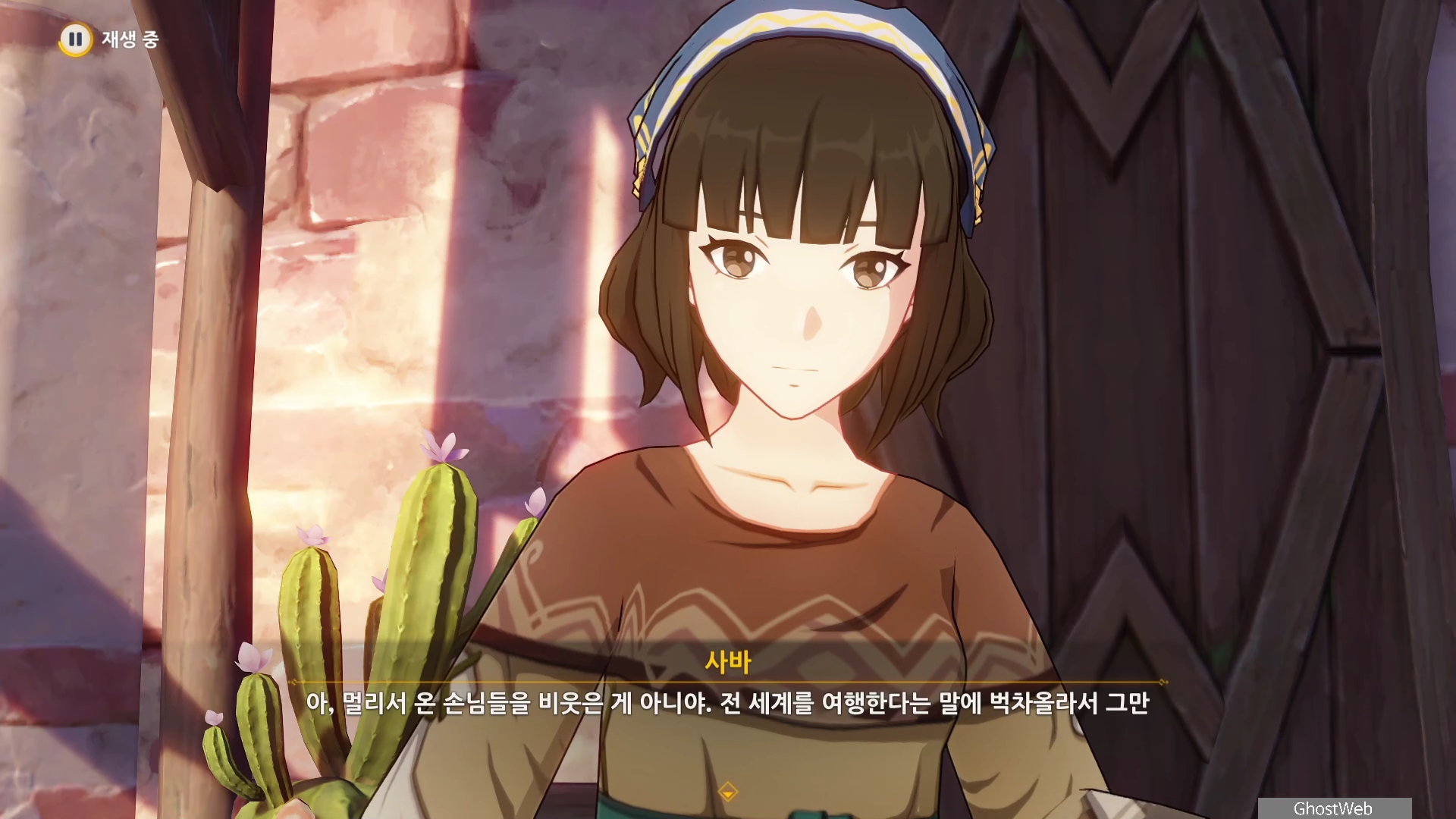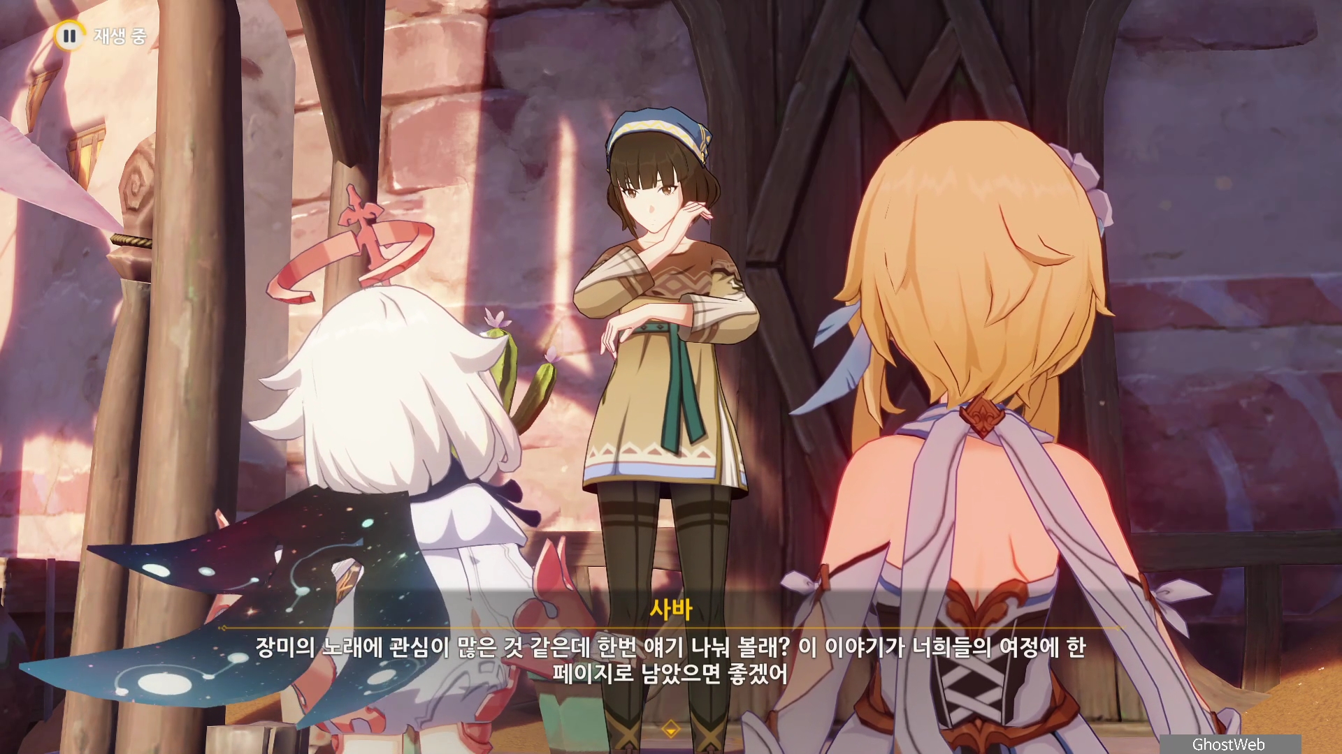 장미의 노래를 듣고 싶다는 페이몬의 말에 노래를 못해서 못 들려준다며 장미의 노래에 관련한 이야기를 나누는데, 아카데이마처럼 큰 도서관이 없어 노래는 다 구전으로 전해진다면서, 노래에 나오는 소원을 들어주는 꽃은 사막 같이 극한의 환경에서 옛날 사람들의 상상력에서 비록되어 삶에 대한 바람이 담겨져 있다고 하네요.