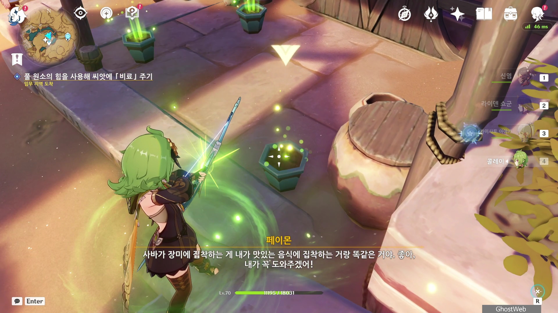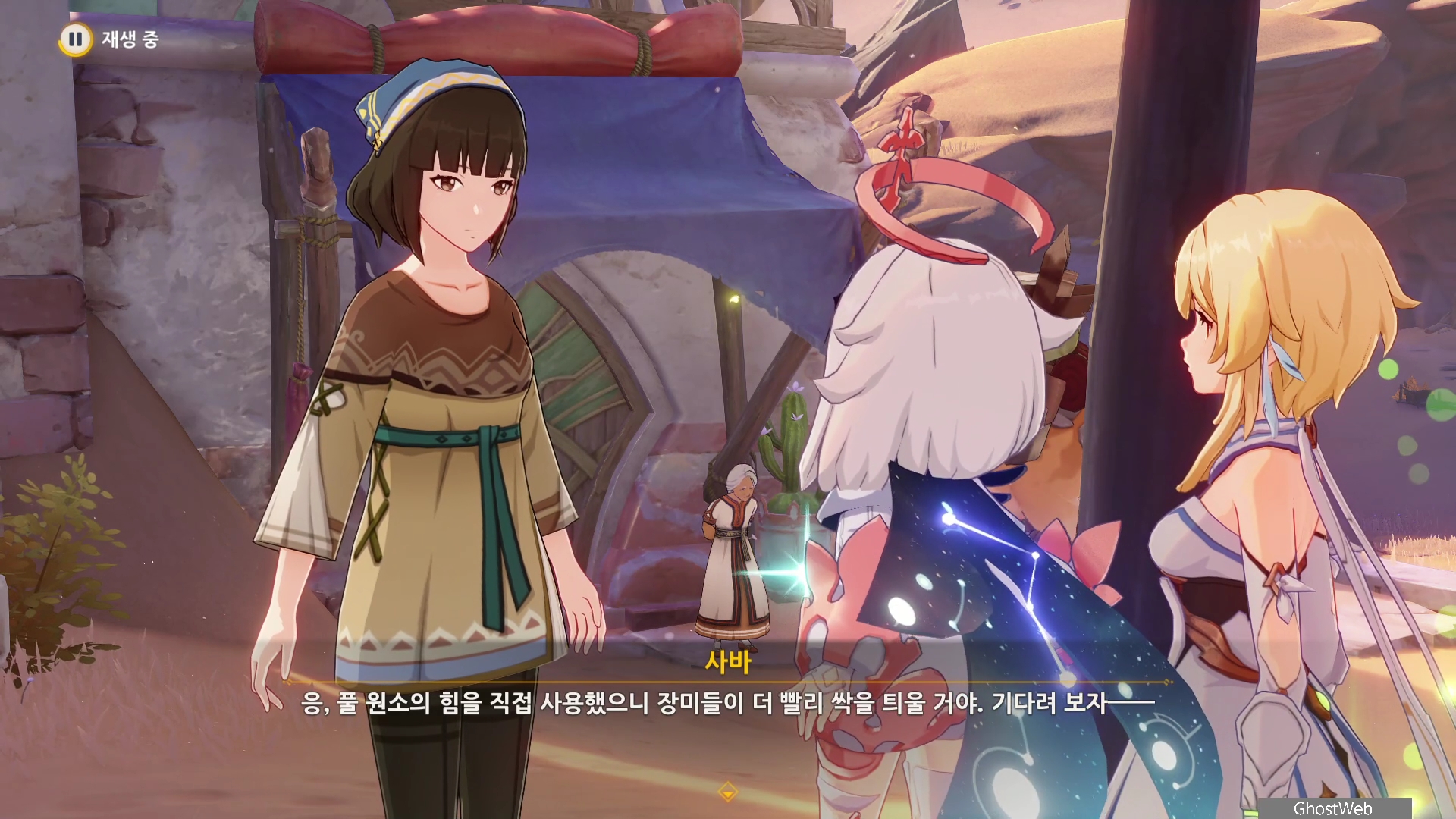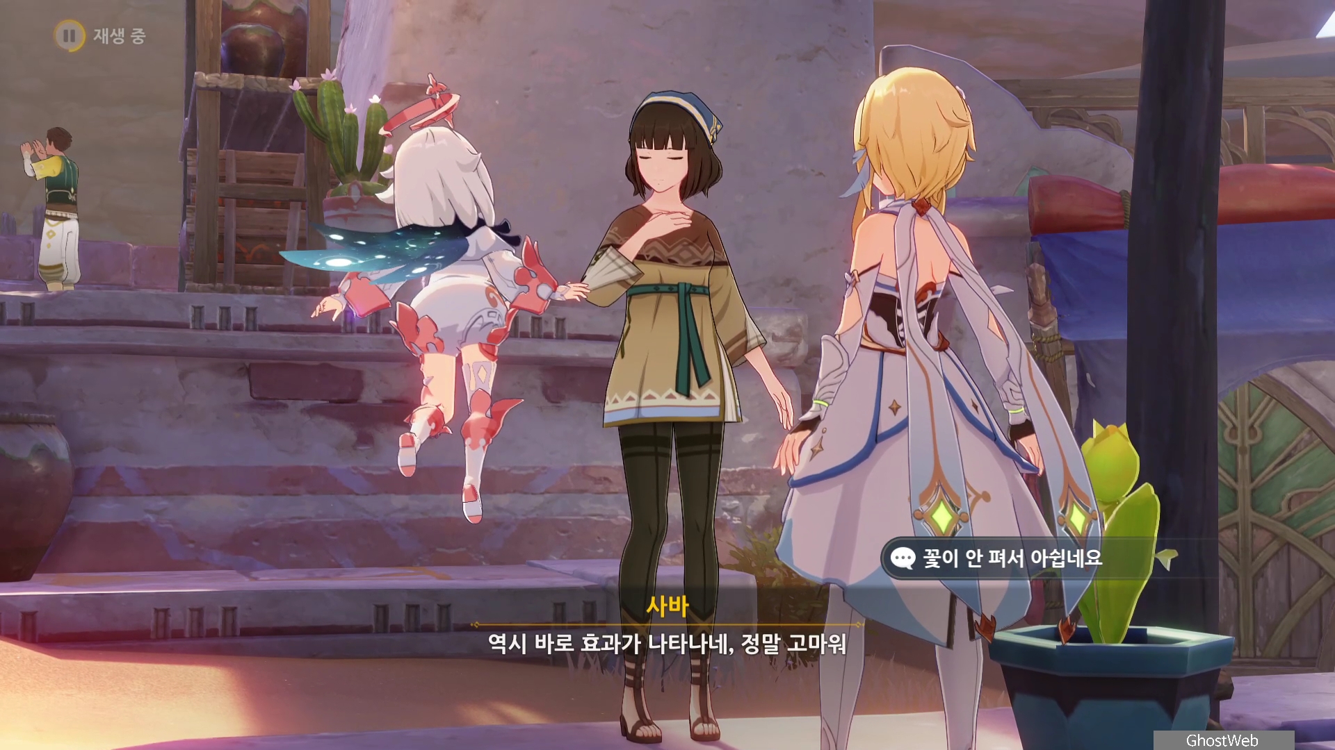풀 원소 캐릭터(콜레이, 여행자)로 사바 옆에 있는 화분 3개에 원소 스킬 공격을 가해 씨앗에 비료를 준 후, 사바와 다시 대화를 이어가면 싹이 튼 화분을 볼 수 있어요.