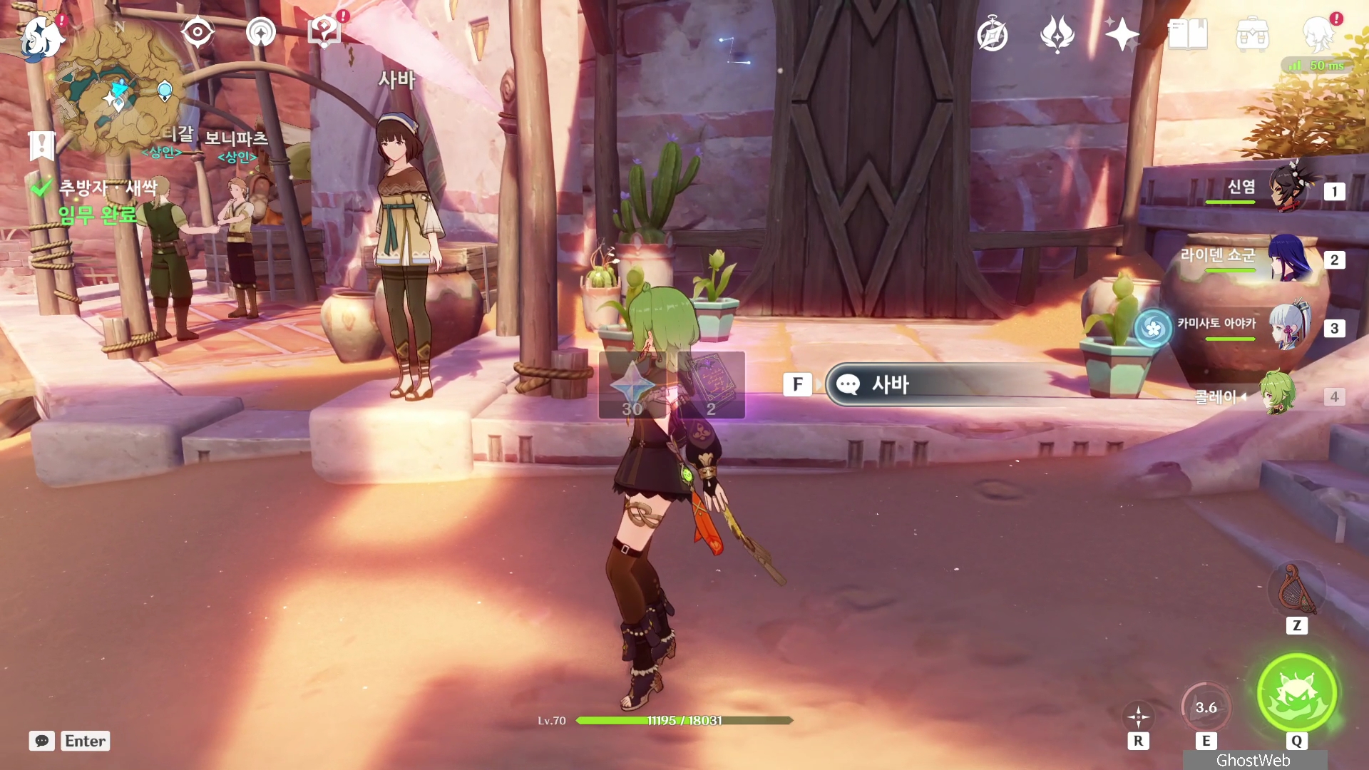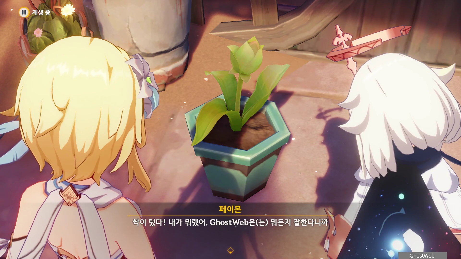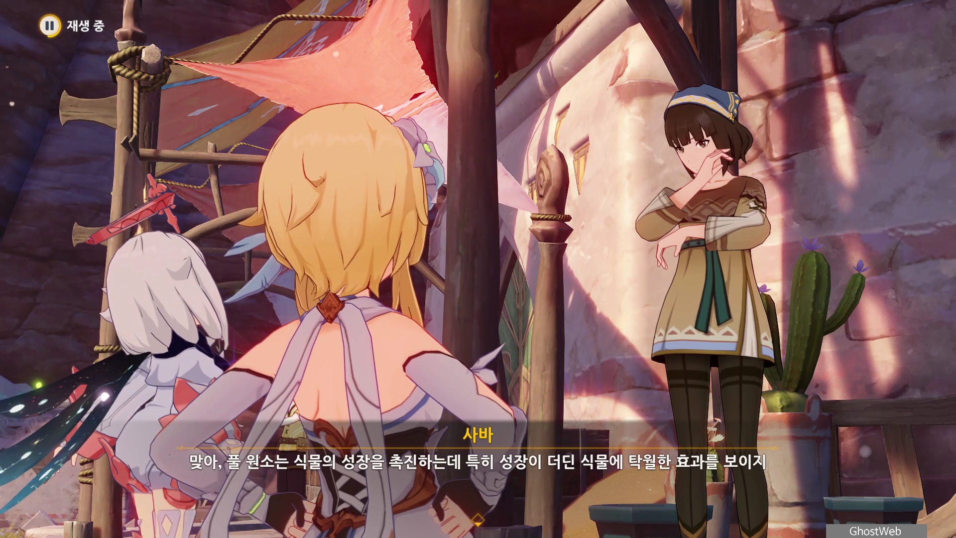 풀 원소 캐릭터(콜레이, 여행자)로 사바 옆에 있는 화분 3개에 원소 스킬 공격을 가해 씨앗에 비료를 준 후, 사바와 다시 대화를 이어가면 싹이 튼 화분을 볼 수 있어요.