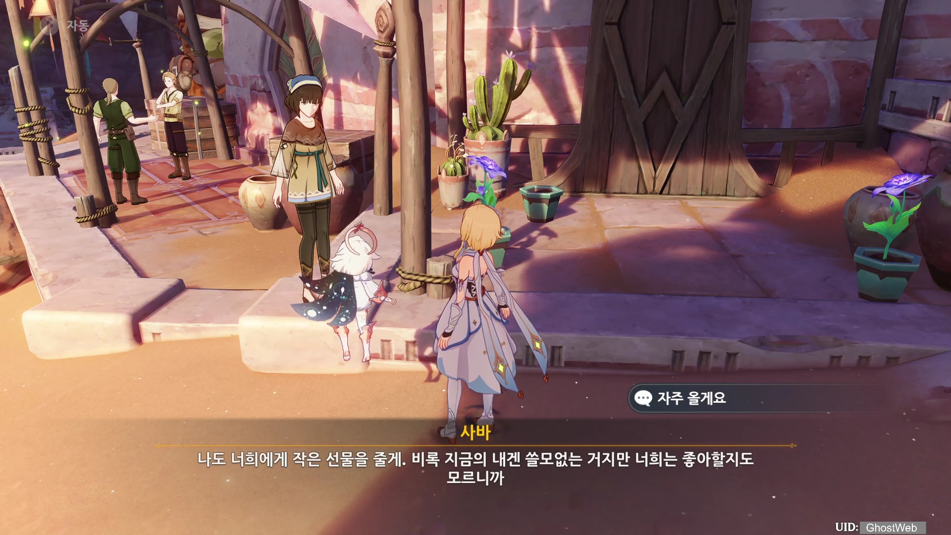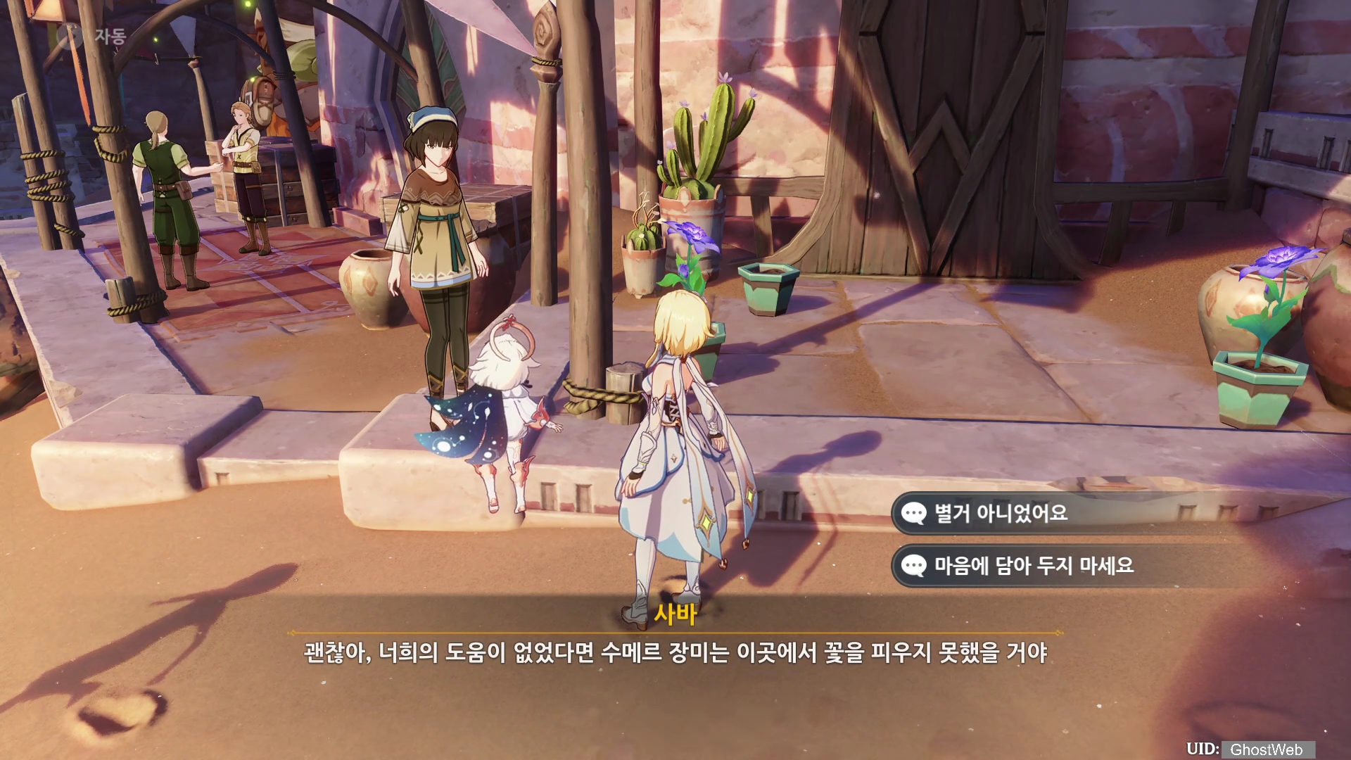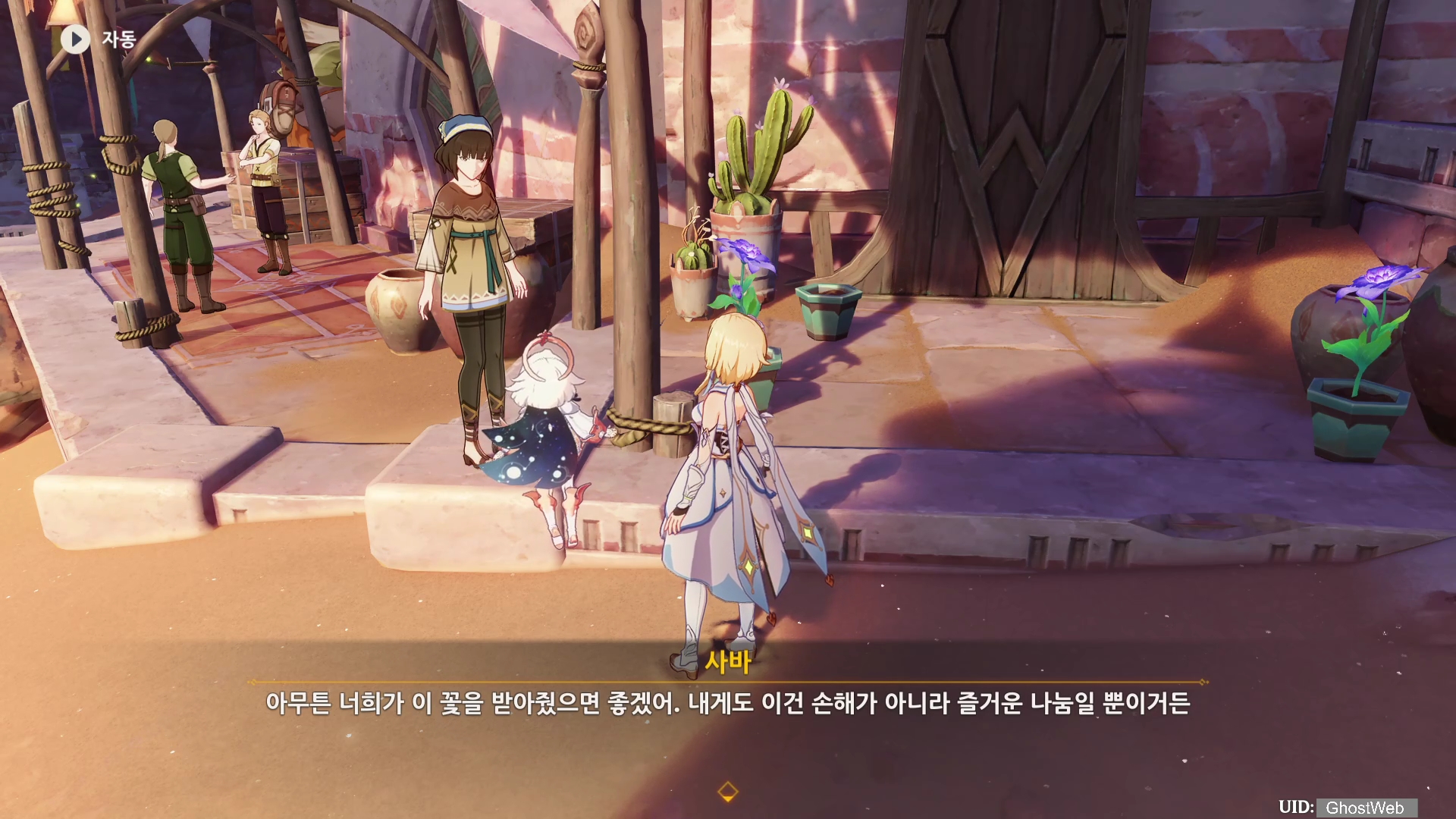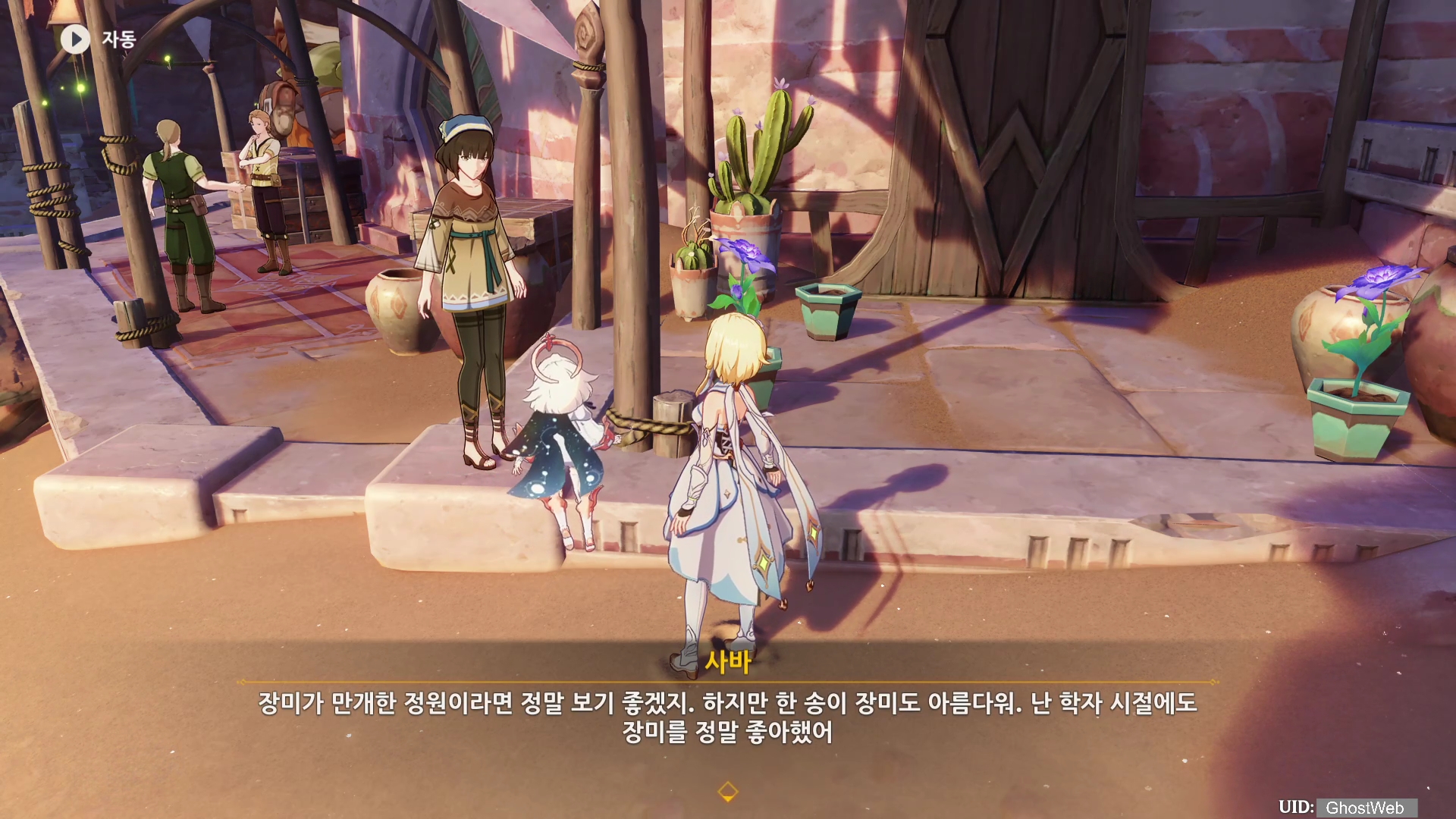 아루 마을 입구 근처에 있는 사바에게 대화를 하면 다시 방문해 약속을 지켰다면서 대화를 이어가는데, 이전에 심었전 꽃이 자라는 속도가 조금 느려서 걱정이라는 말을 해요.