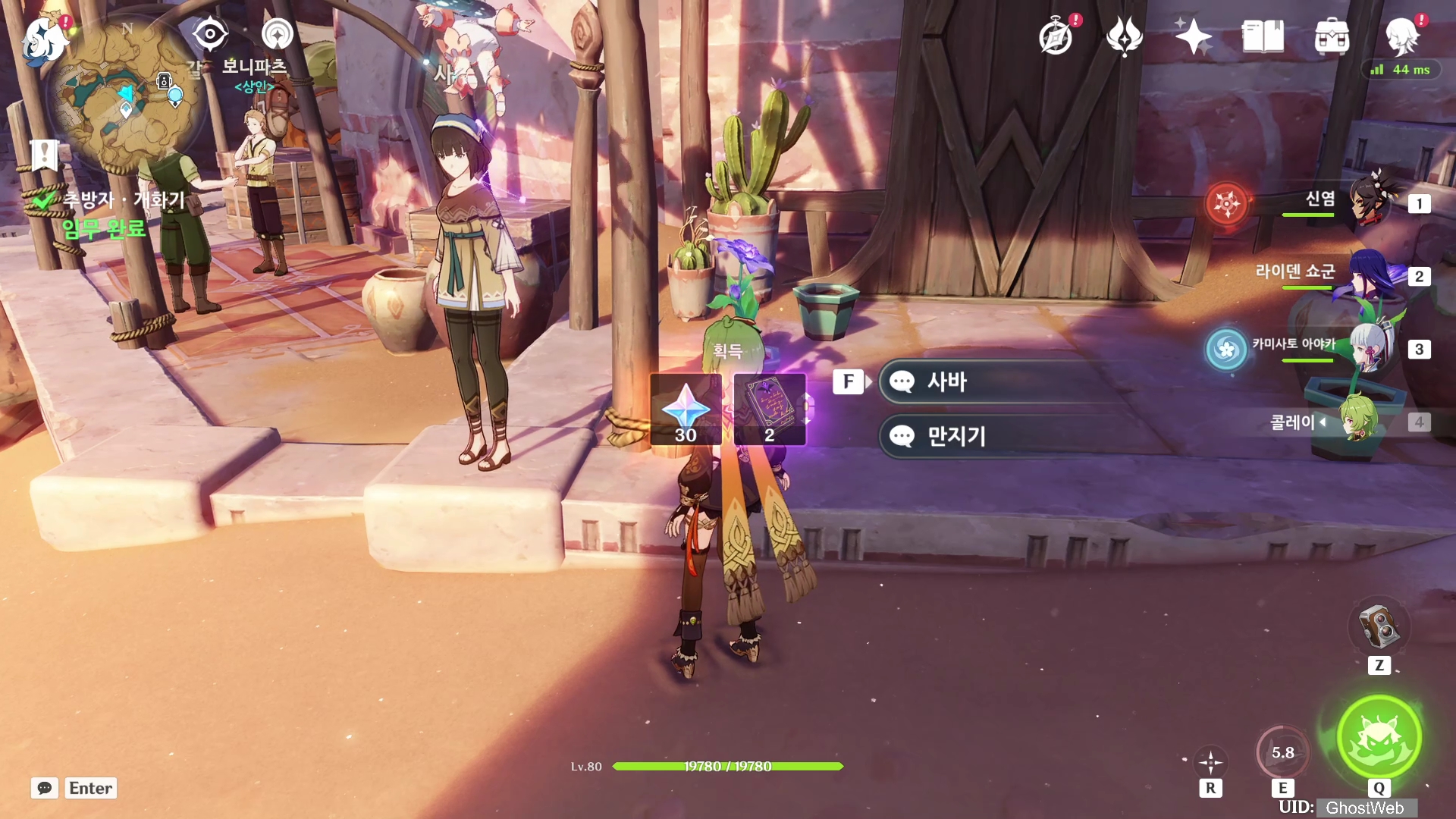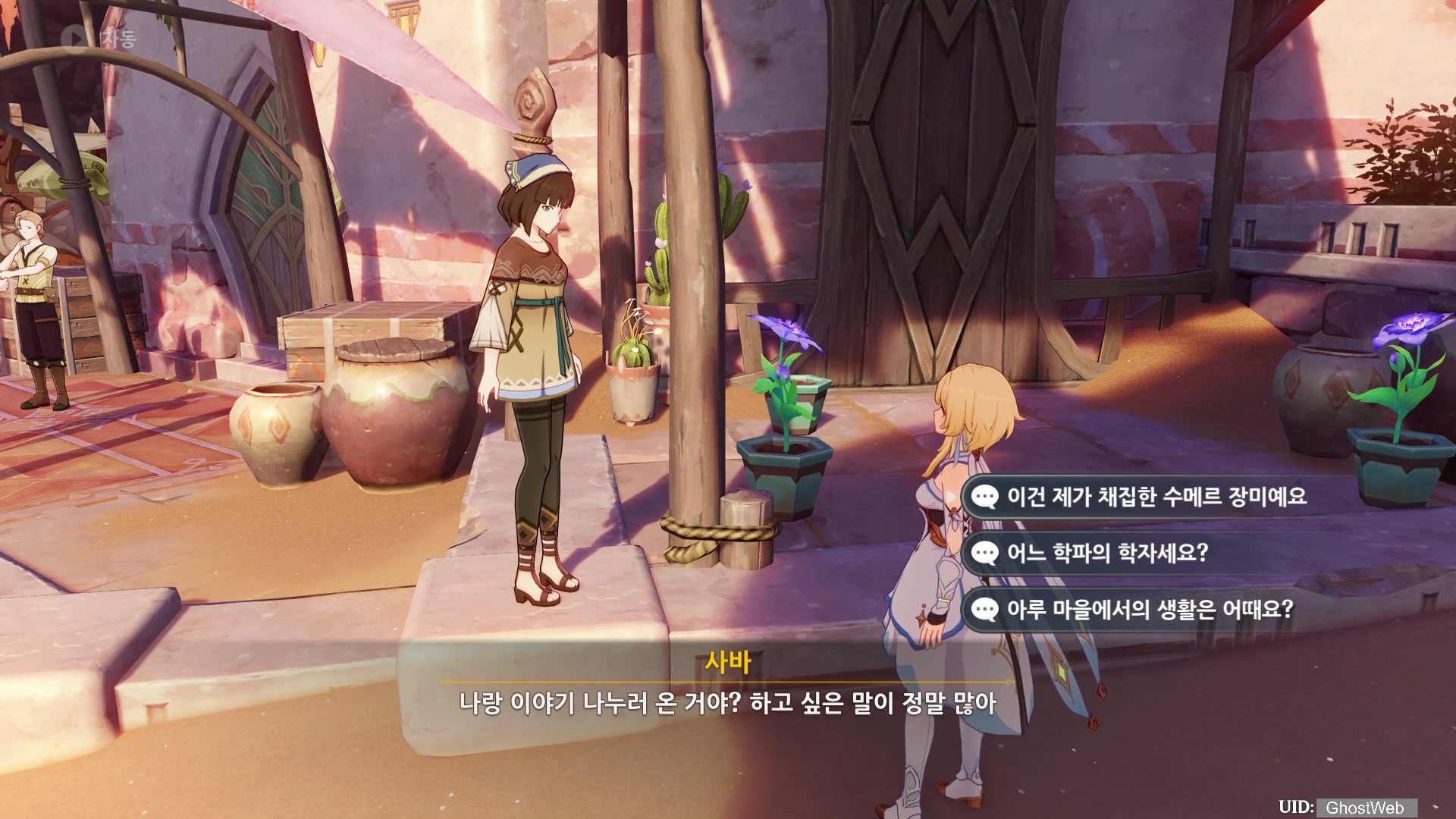 수메르 장미를 받고 사바와 대화를 이어가는데, 사바가 학자였고 아카데미아에서 아루 마을로 추방되었다고 하며, 여행자와 이야기 하면 마음이 편해진다는 말과 자주 오라는 말을 끝으로 임무가 완료되며 보상으로 원석 30개를 획득할 수 있어요.