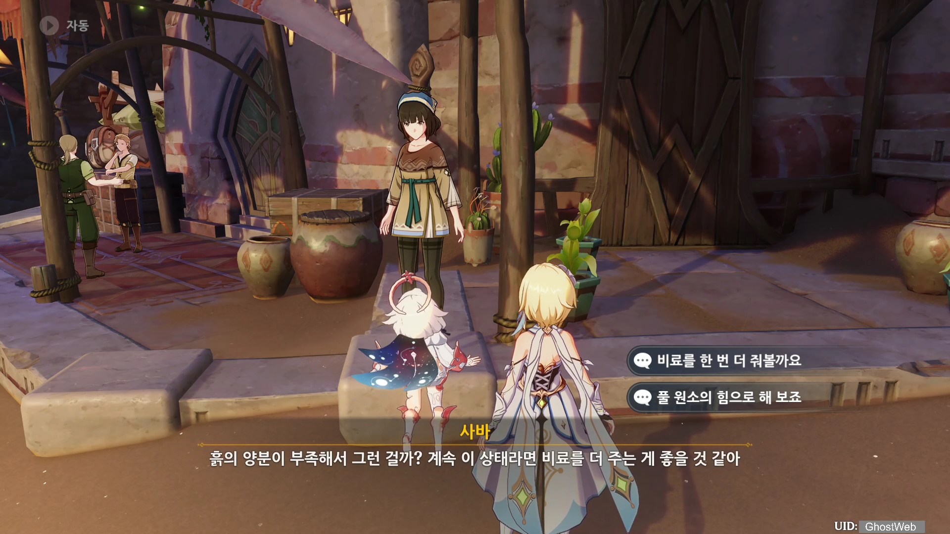 사바는 흙의 양분이 부족해서 그런거 같다며 비료를 더 주는 게 좋을 거 같다는 말에 여행자가 비료를 더 주겠다는 말을 하며, 이전처럼 사바 옆에 놓인 화분 3개에 풀 원소의 힘을 부여해요. (풀 원소 캐릭터로 원소 공격)
