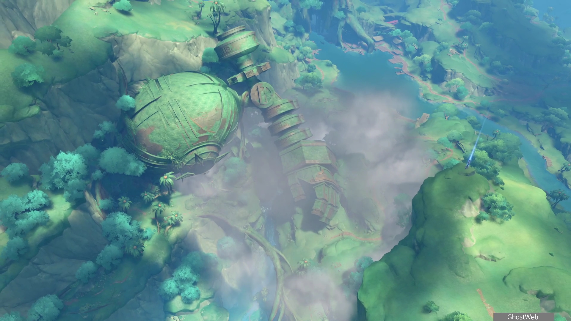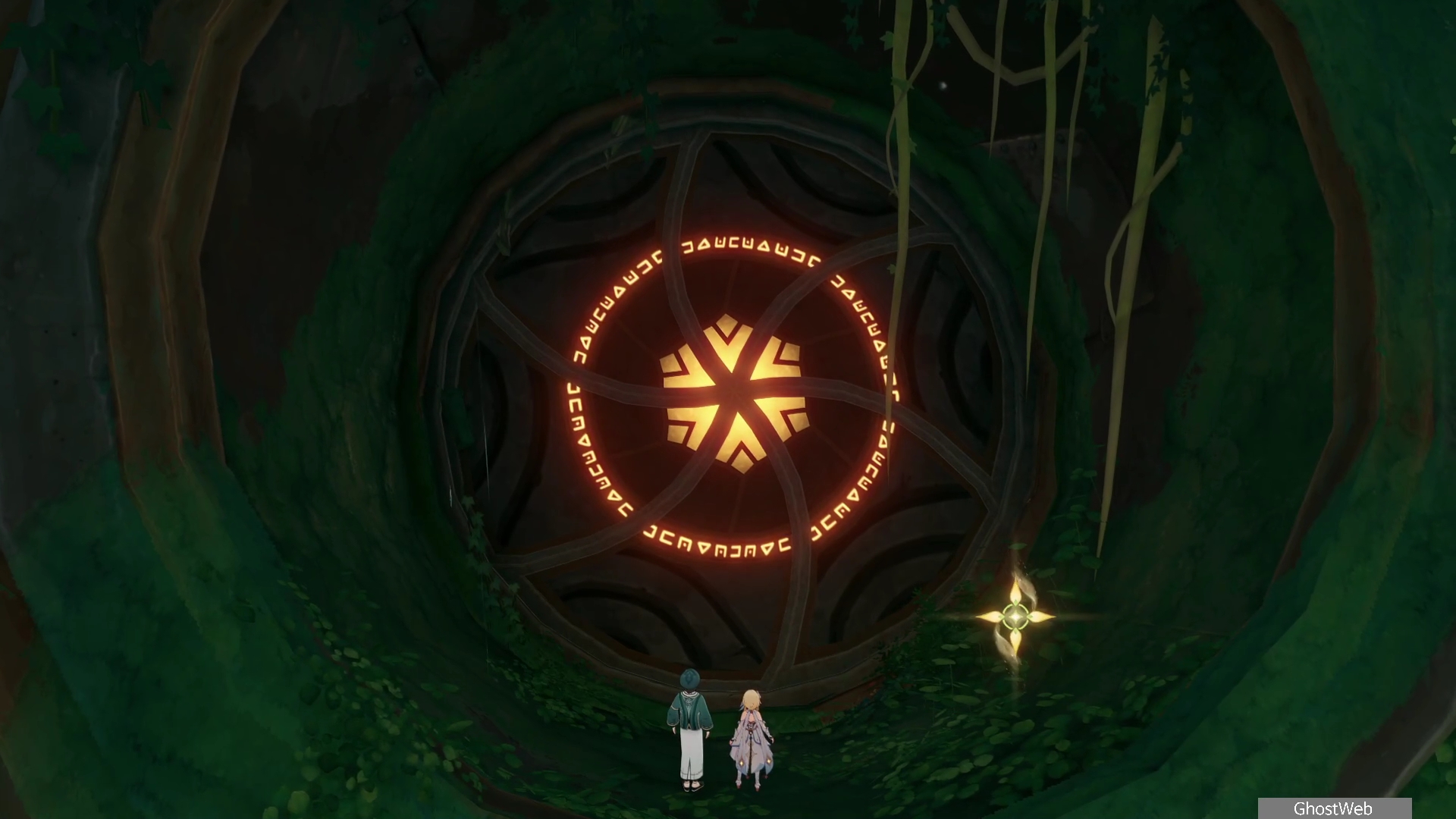 여행자가 유적 거상을 작동하면 유적 거상이 큰 팔을 들어 땅을 찍어, 이를 확인하고 여행자와 페이몬은 거상의 팔 쪽으로 가보기로 해요.