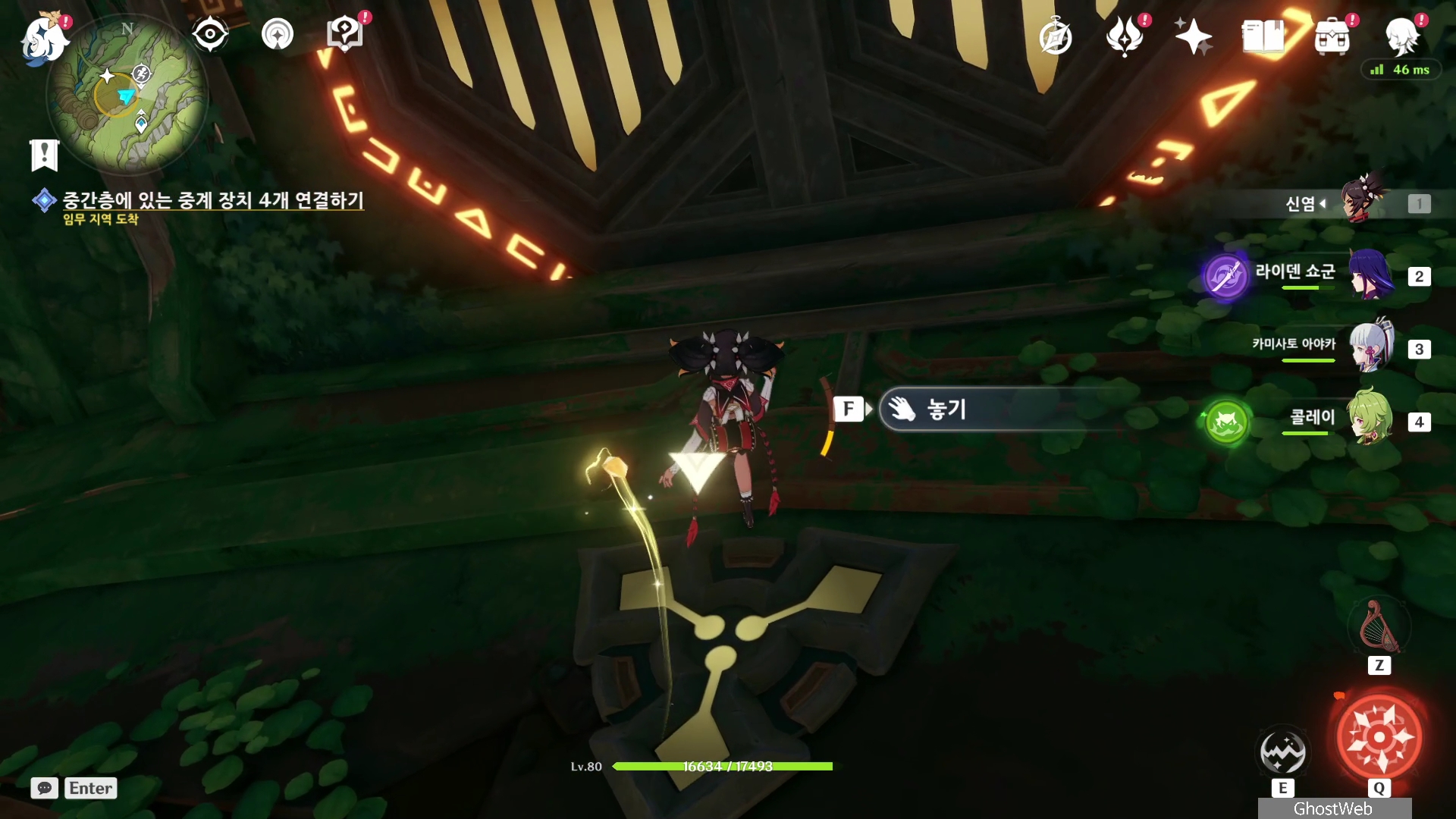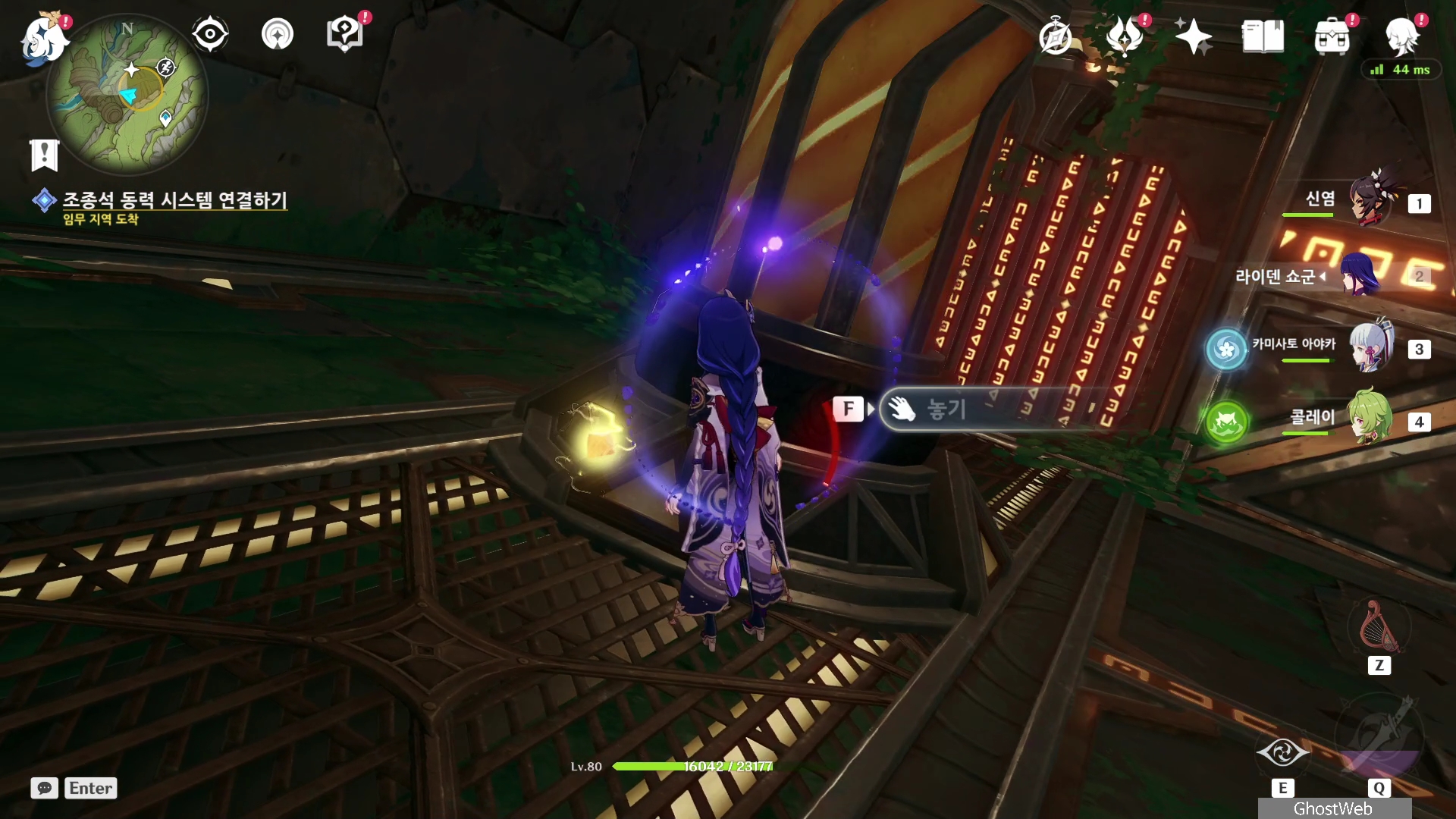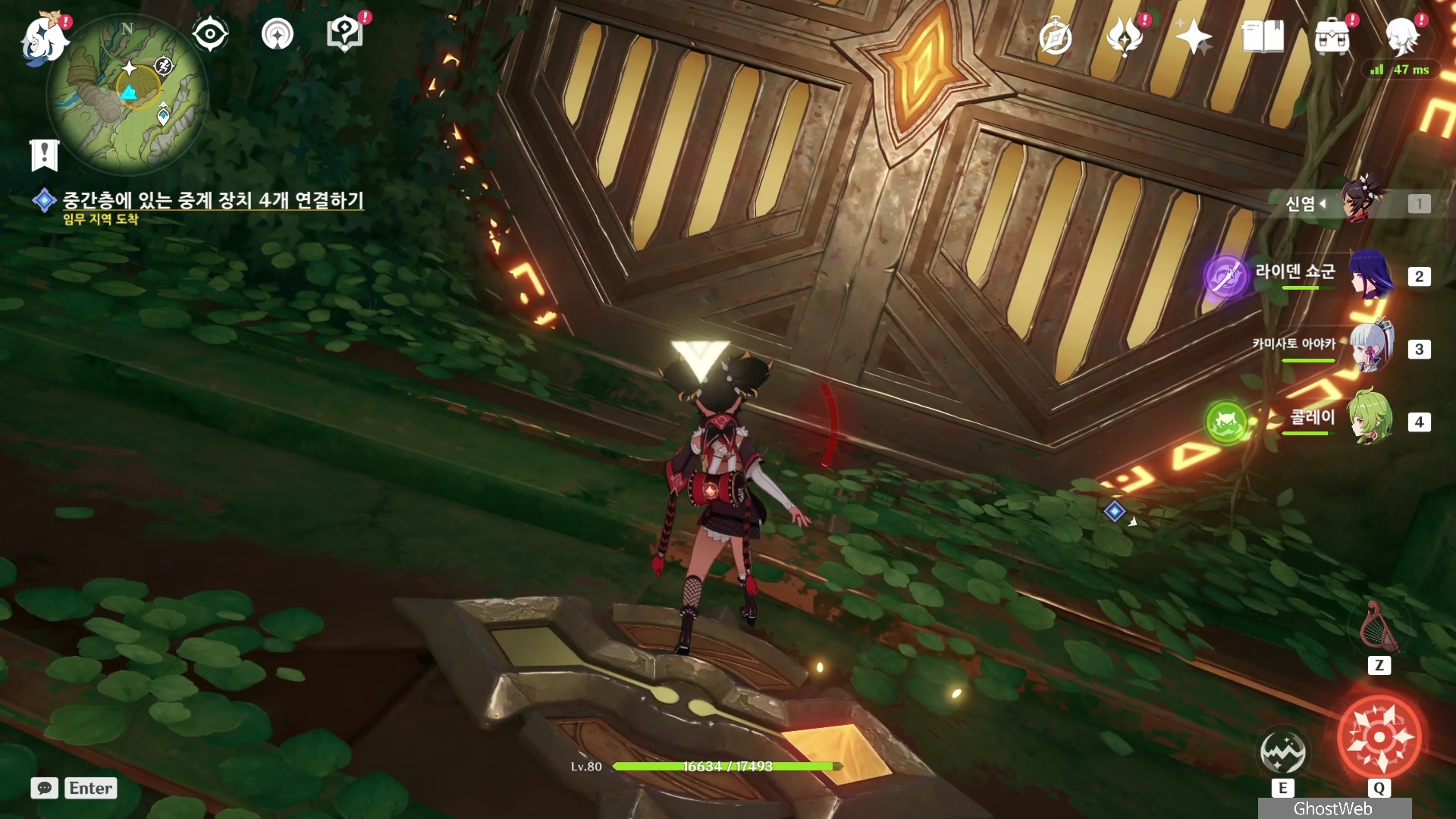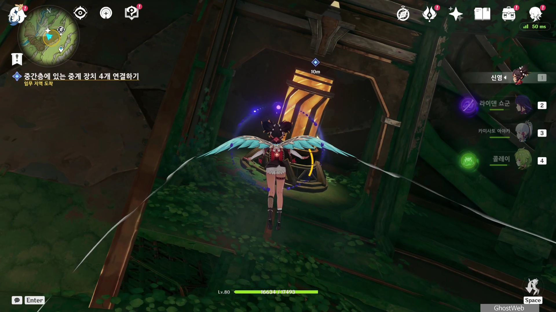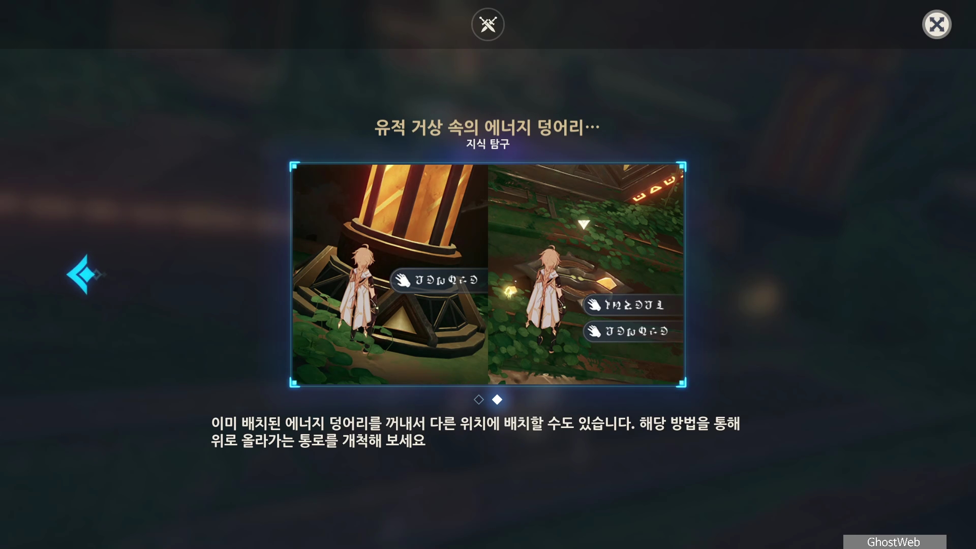 이제 유적 거상의 조종석 동력 시스템을 연결하기 위해 승강기를 이용해 <꼭대기층>으로 이동한 후, 중계 장치 근처에 있는 에너지 덩어리를 주워 주변의 문을 개방하여 다른 에너지 덩어리를 획득하고 각 중계 장치를 활성화하면 중앙에 있던 조종실의 문이 열려요.