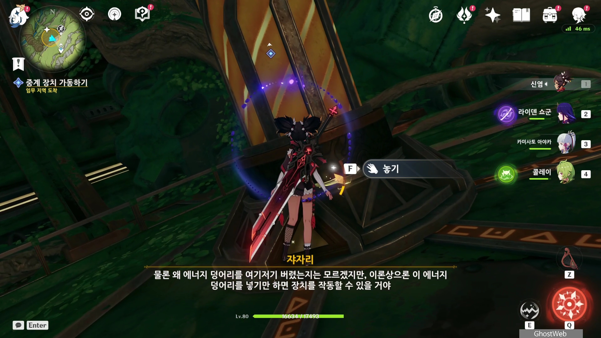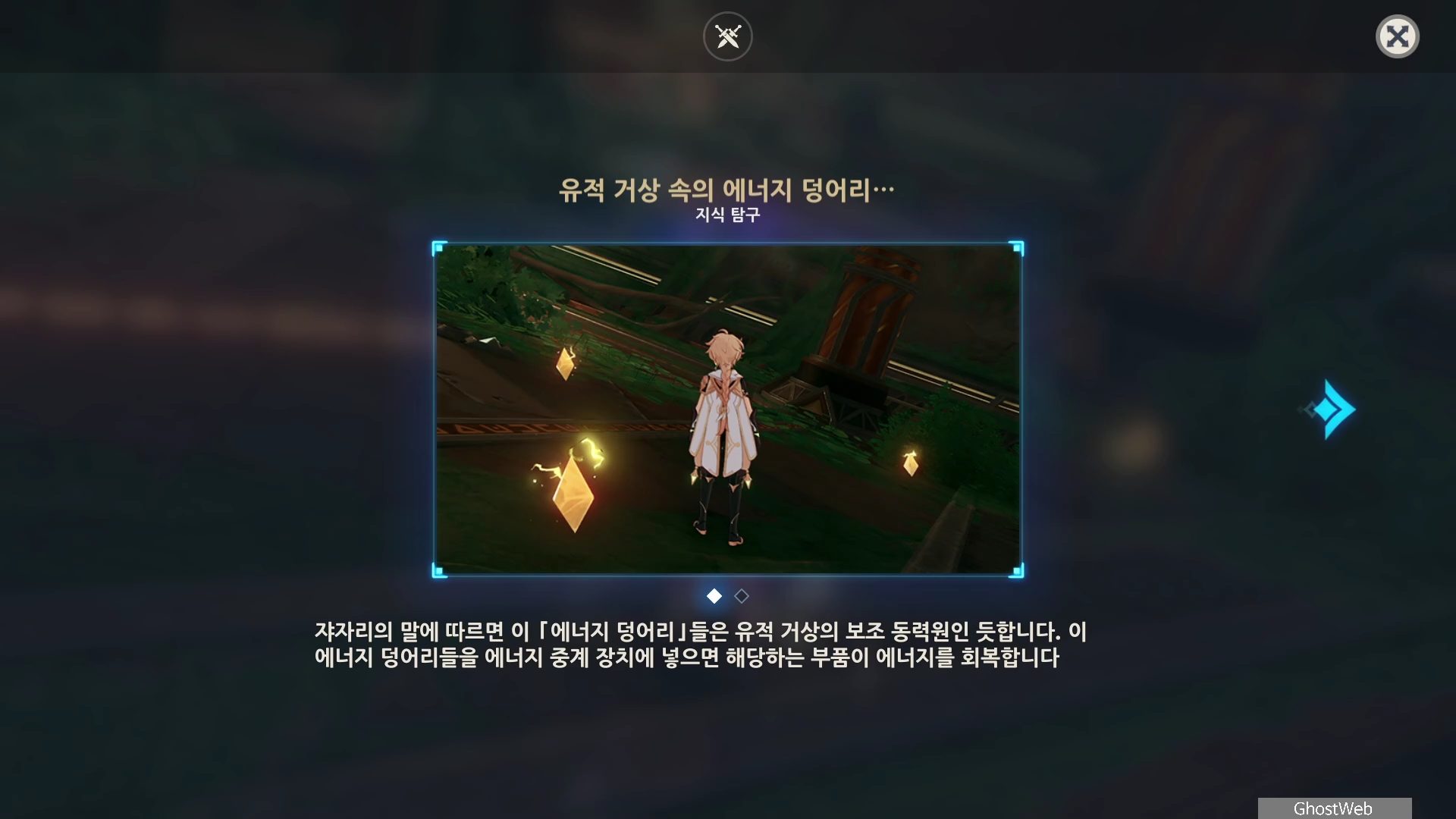 쟈자리가 수리한 아미티 장치로 유적 거상의 입구를 열고 지하로 내려가 바닥에 있는 에너지 덩어리를 주워서 주변에 있는 중계 장치에 넣으면 장치 들을 활성화 할 수 있어요.