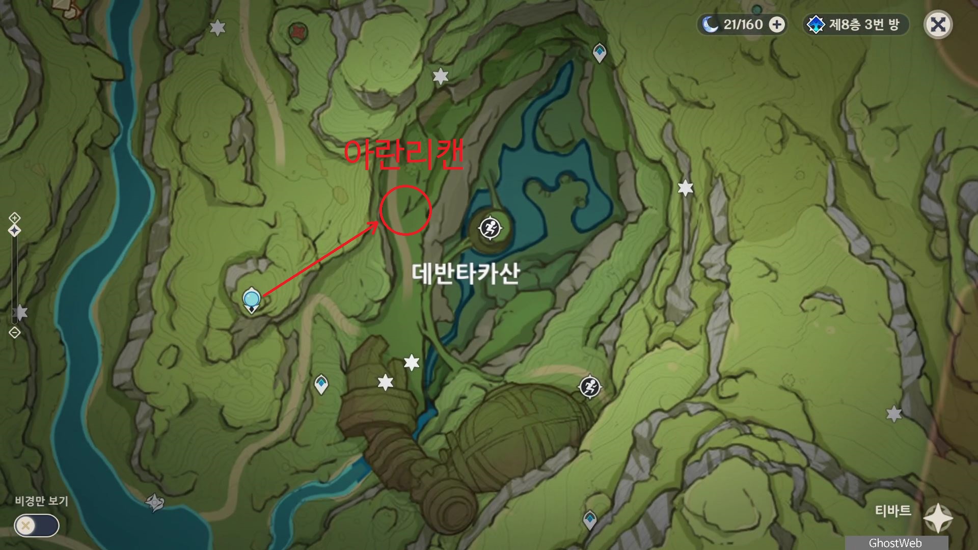 데반타카산 왼쪽에 있는 신의 석상으로 워프 한 다음 1~2시 방향으로 비행하다 보면 기둥 같은 로봇 부품 같은 곳 위에 <잃어버린 에너지 덩어리>가 있고 그 아래 <아란리캔>를 만날 수 있어요.