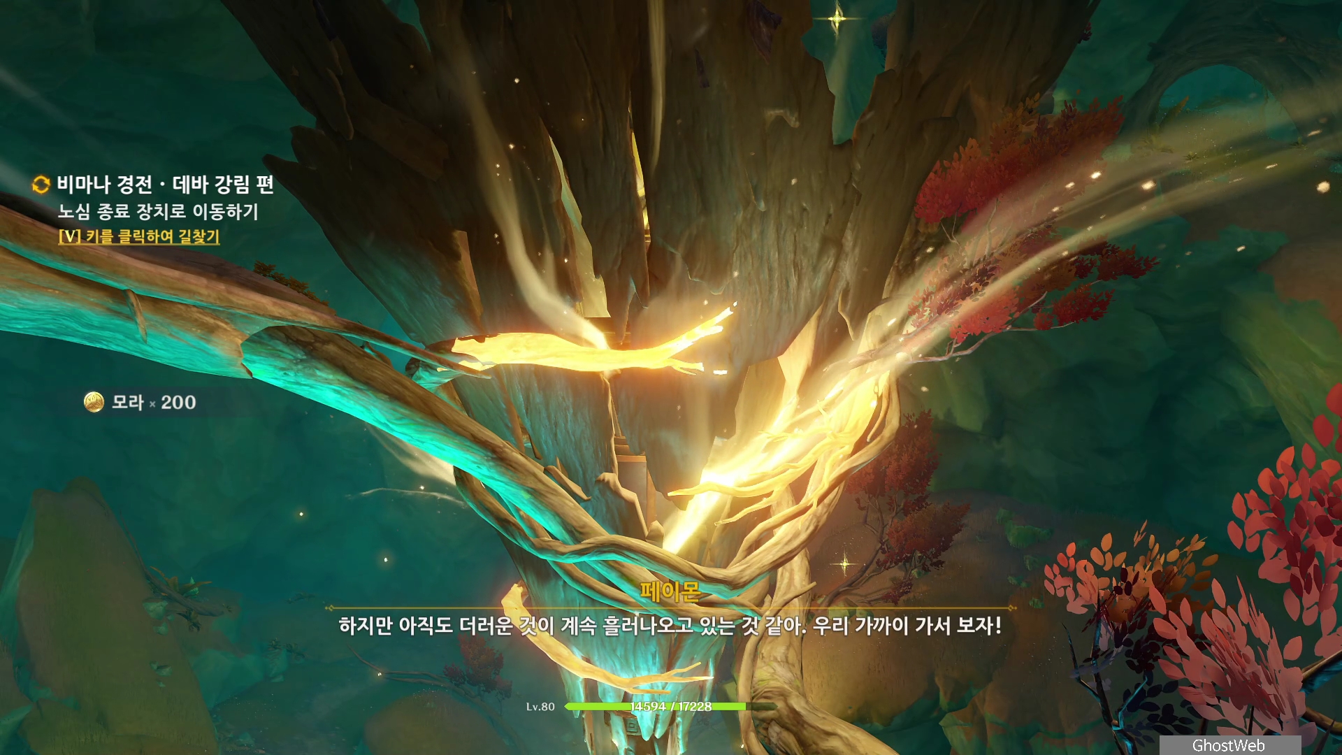 노심에 다가가니 갑자기 튀어나오는 심연 봉독자(자색 뇌전, 지하에서 온 생물, 깊은 어둠 속에서 타오르는 번개)를 처치하고 장치를 끄고 다시 지상으로 올라와 아란리캔은 고맙다는 인사와 숲을 보호해야 한다며 우트사바 축제가 끝나면 다시 돌아올거라는 말을 끝으로 <비미나 경전 - 데바 강림 편> 임무는 완료돼요.