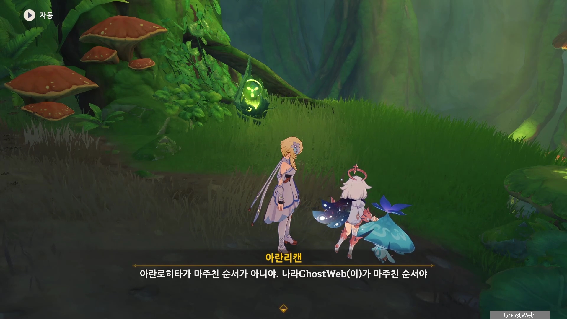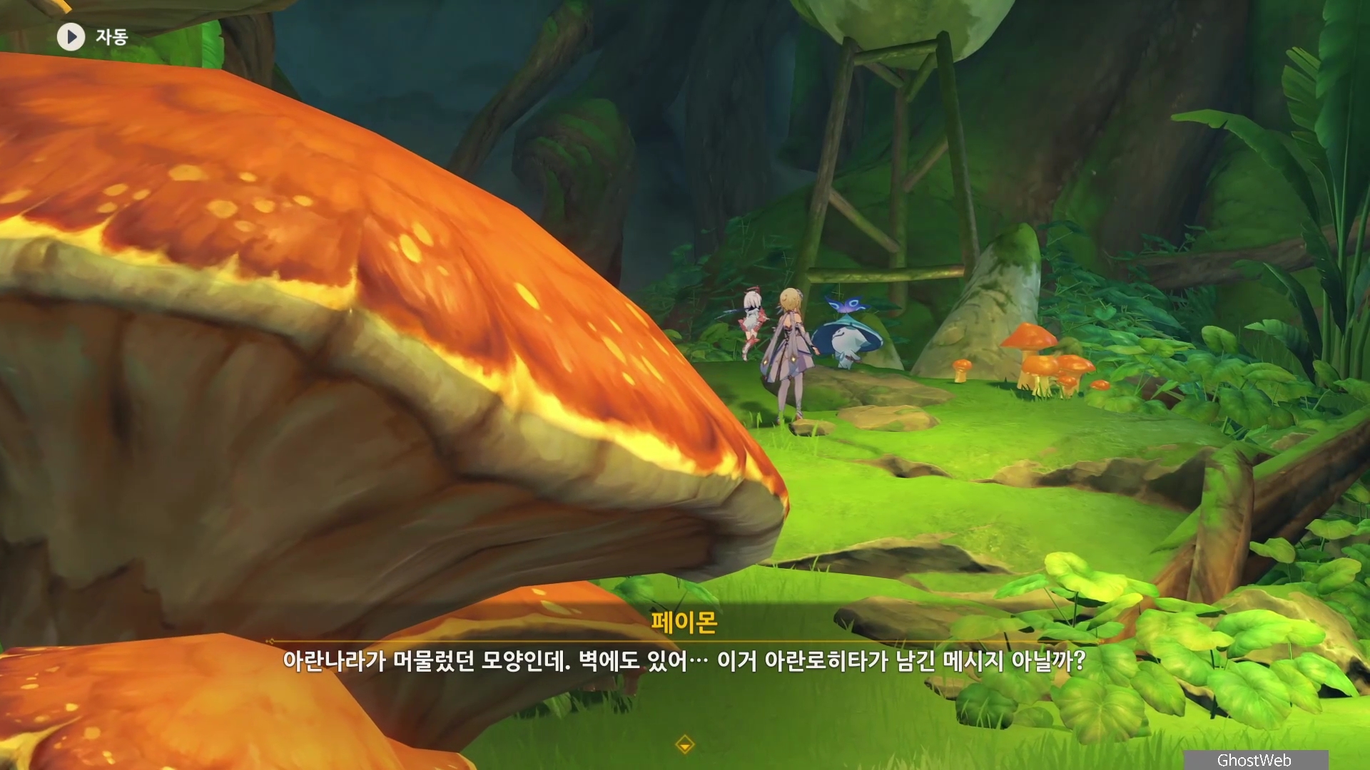 오른쪽부터 황혼새, 버섯돼지, 머리깃 호랑이라고 써 있는데, 이를 확인하고 다시 아란리캔하고 대화를 한 후 벽을 보면 풀 씨앗으로 쏘면 해결되는 과녘 기믹이 생긴걸 볼 수 있어요.