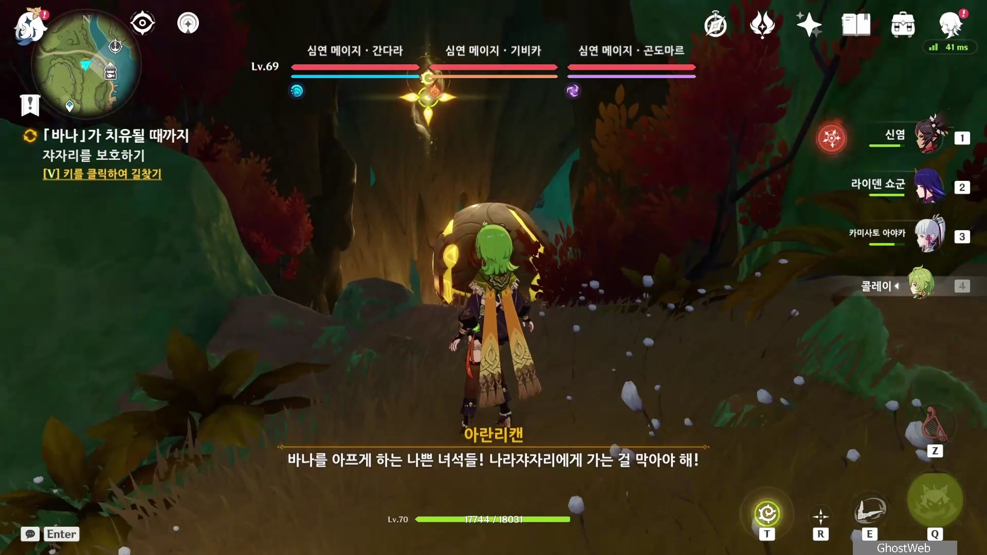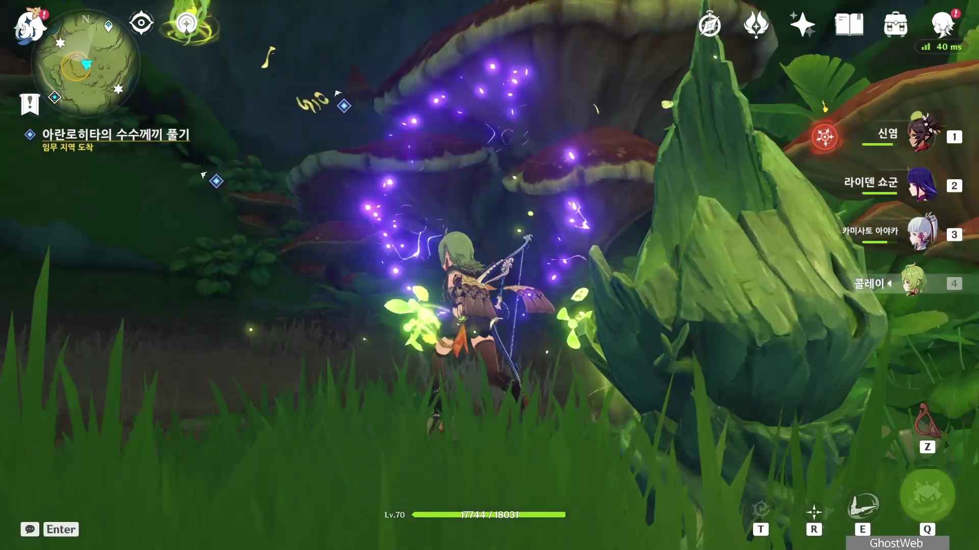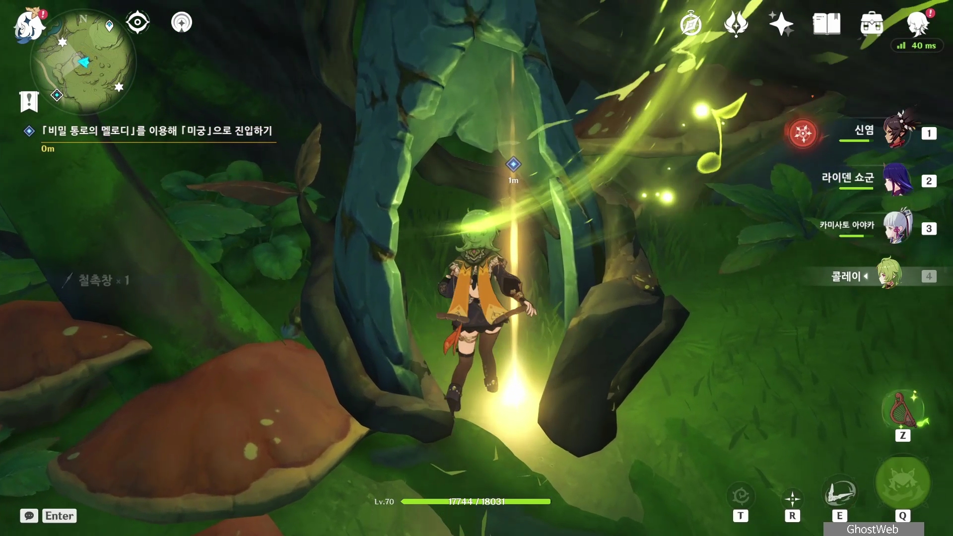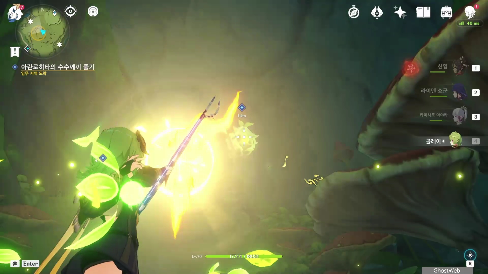 근처에 있는 풀의 씨앗을 얻은 후, 위의 과녘을 활 캐릭터로 조준 사격하면 되는데, 아란리캔의 말에서 플레이어가 마주친 순서라는데, 저는 오른쪽부터 문양을 봐서 황혼새, 버섯돼지, 머리깃 호랑이 순으로 과녘을 마쳐서 기믹을 해결하면 미궁 입구로 길이 안내돼요.