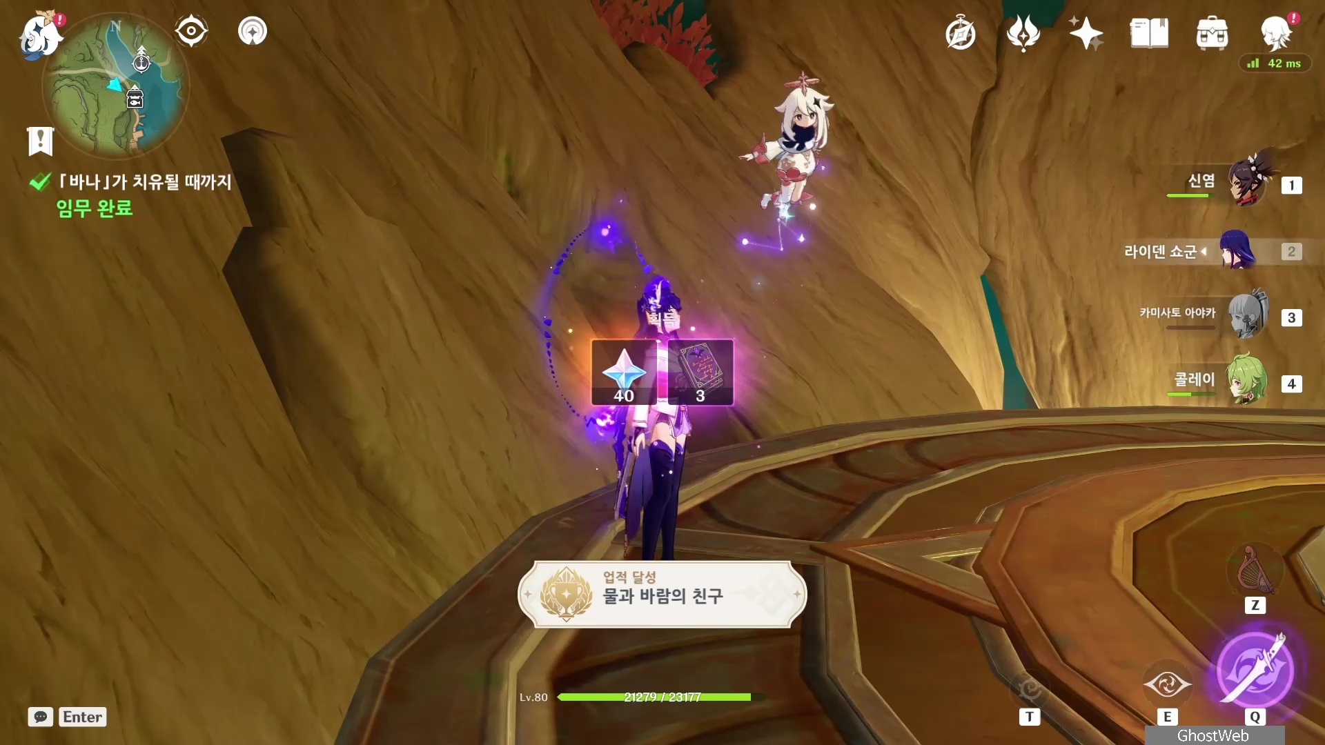 아란리캔에게 고맙다는 인사를 받고 아란리캔은 바나라나로 돌아가며 임무가 완료되며, 임무 보상으로 원석 40개, 물과 바람의 친구 업적을 달성할 수 있어요.