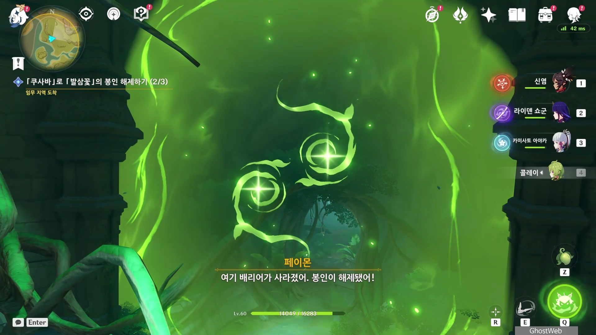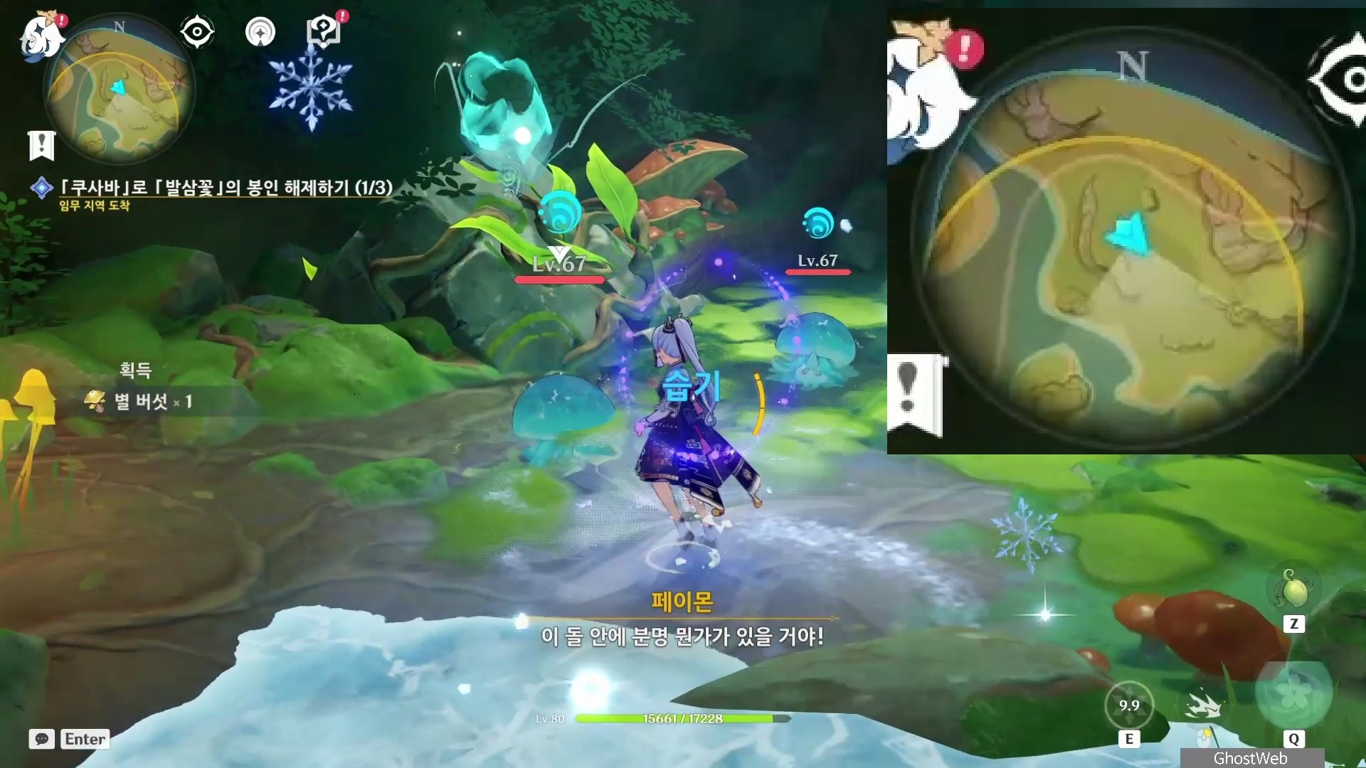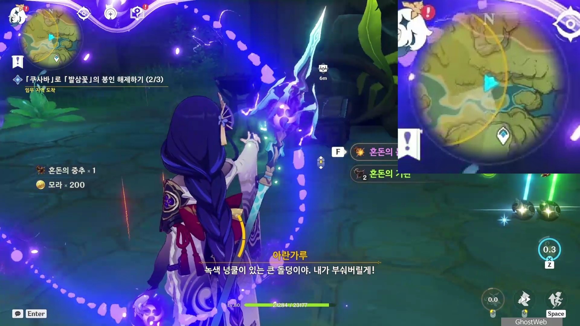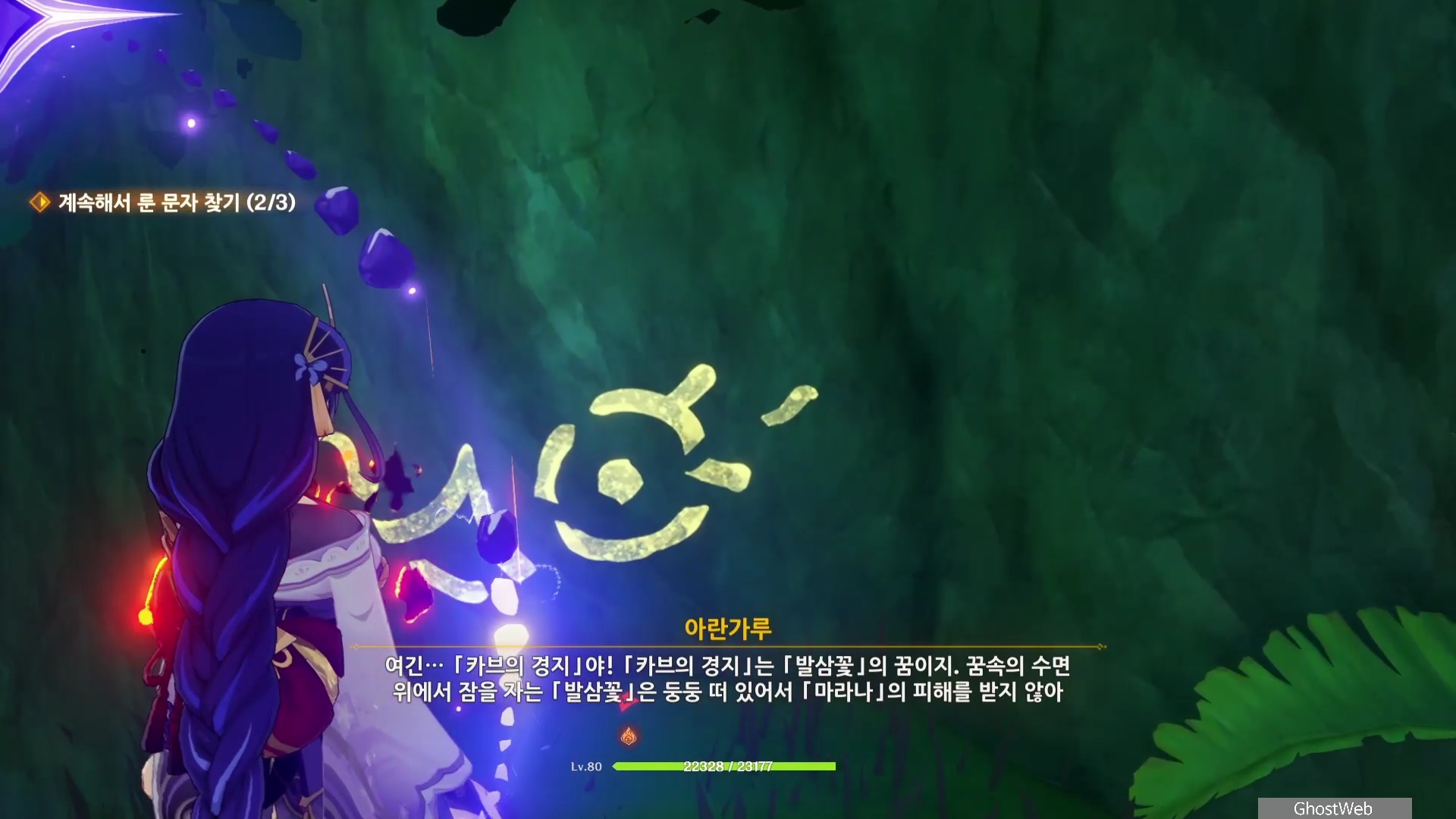 모든 룬 문자를 찾고 발삼꽃이 있는 동굴 중심으로 가면 카브의 경지를 발견할 수 있는데, <발삼꽃>이 봉인이 되어 있어 보인 해제를 위해 먼저 중앙 기준 왼쪽, 오른쪽에 있는 동굴로 선령을 따라 이동하여 동굴 내부에 있는돌덩이를 <쿠사바>로 파괴한 후 나오는 장치를 만지면 발삼꽃의 봉인이 1개 씩 풀려요.