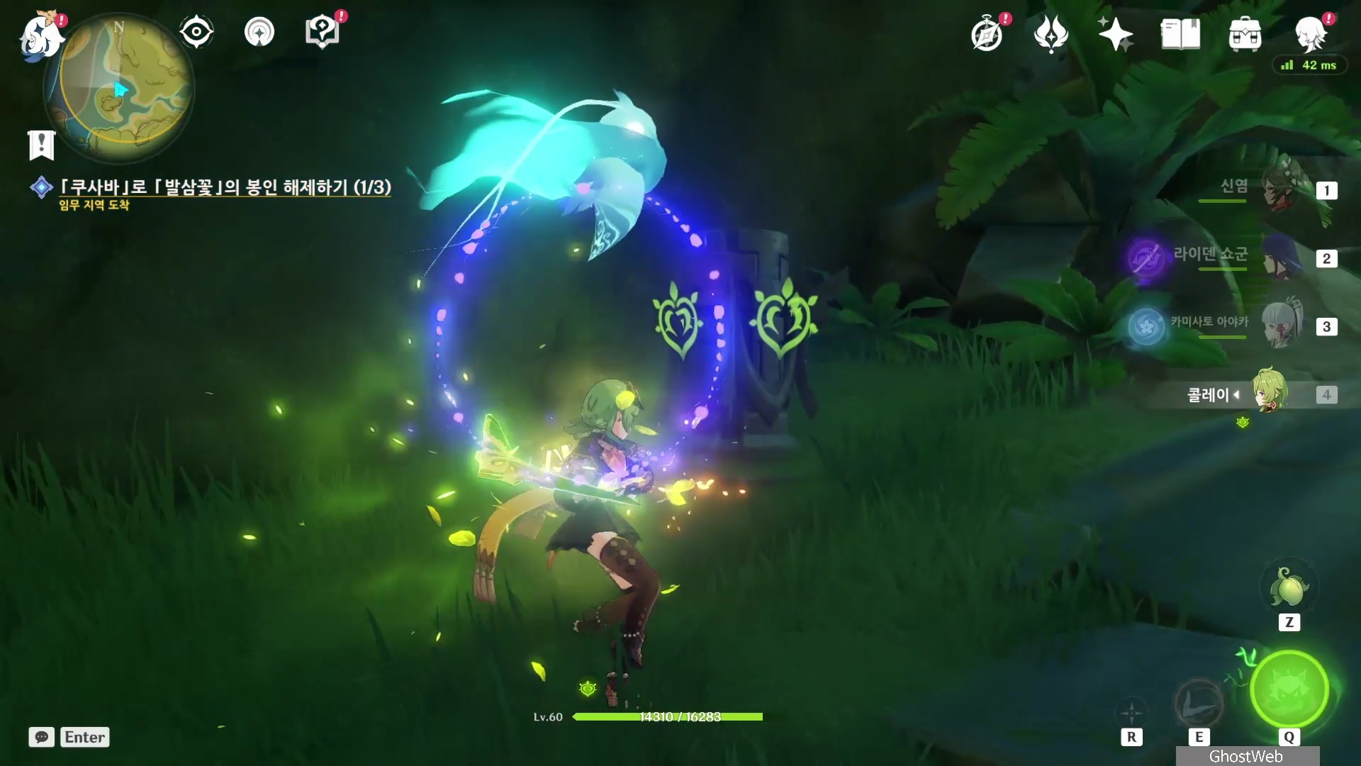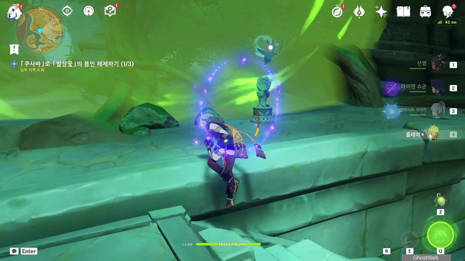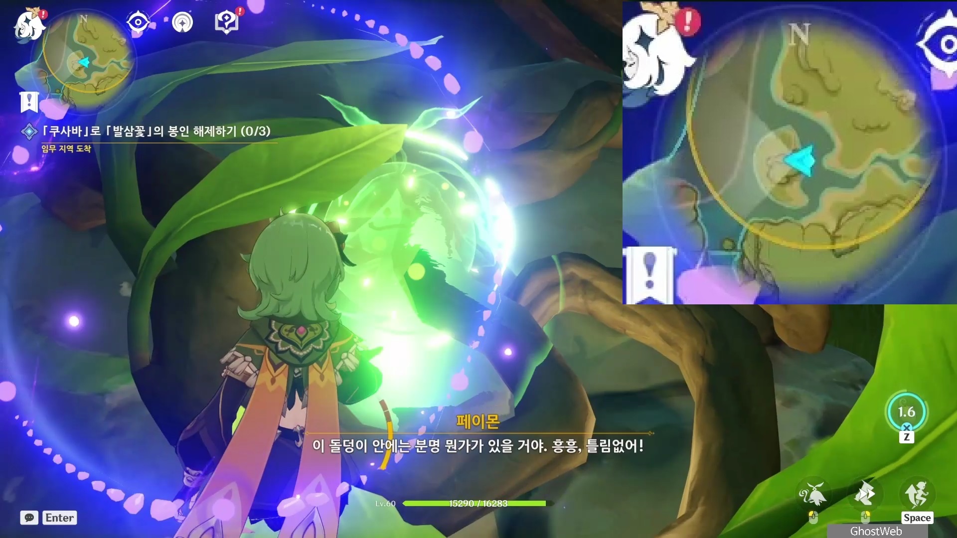 모든 룬 문자를 찾고 발삼꽃이 있는 동굴 중심으로 가면 카브의 경지를 발견할 수 있는데, <발삼꽃>이 봉인이 되어 있어 보인 해제를 위해 먼저 중앙 기준 왼쪽, 오른쪽에 있는 동굴로 선령을 따라 이동하여 동굴 내부에 있는돌덩이를 <쿠사바>로 파괴한 후 나오는 장치를 만지면 발삼꽃의 봉인이 1개 씩 풀려요.