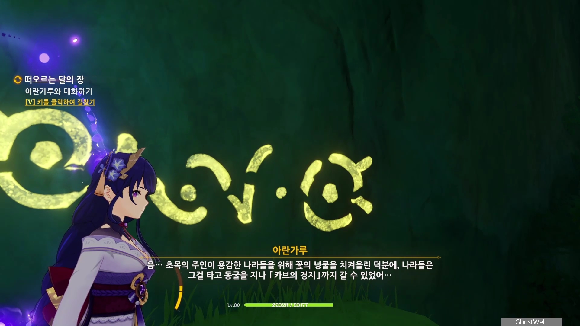 동굴 내부로 들어가 벽에 새겨진 룬 문자를 찾으면 되는데, 룬 문자는 예전의 이야기를 아란나라 들이 기억할 수 있게 벽에 새긴 것으로 일부 룬 문자는 <쿠사바>로 부실 수 있는 돌 덩이 뒤에 있어요.