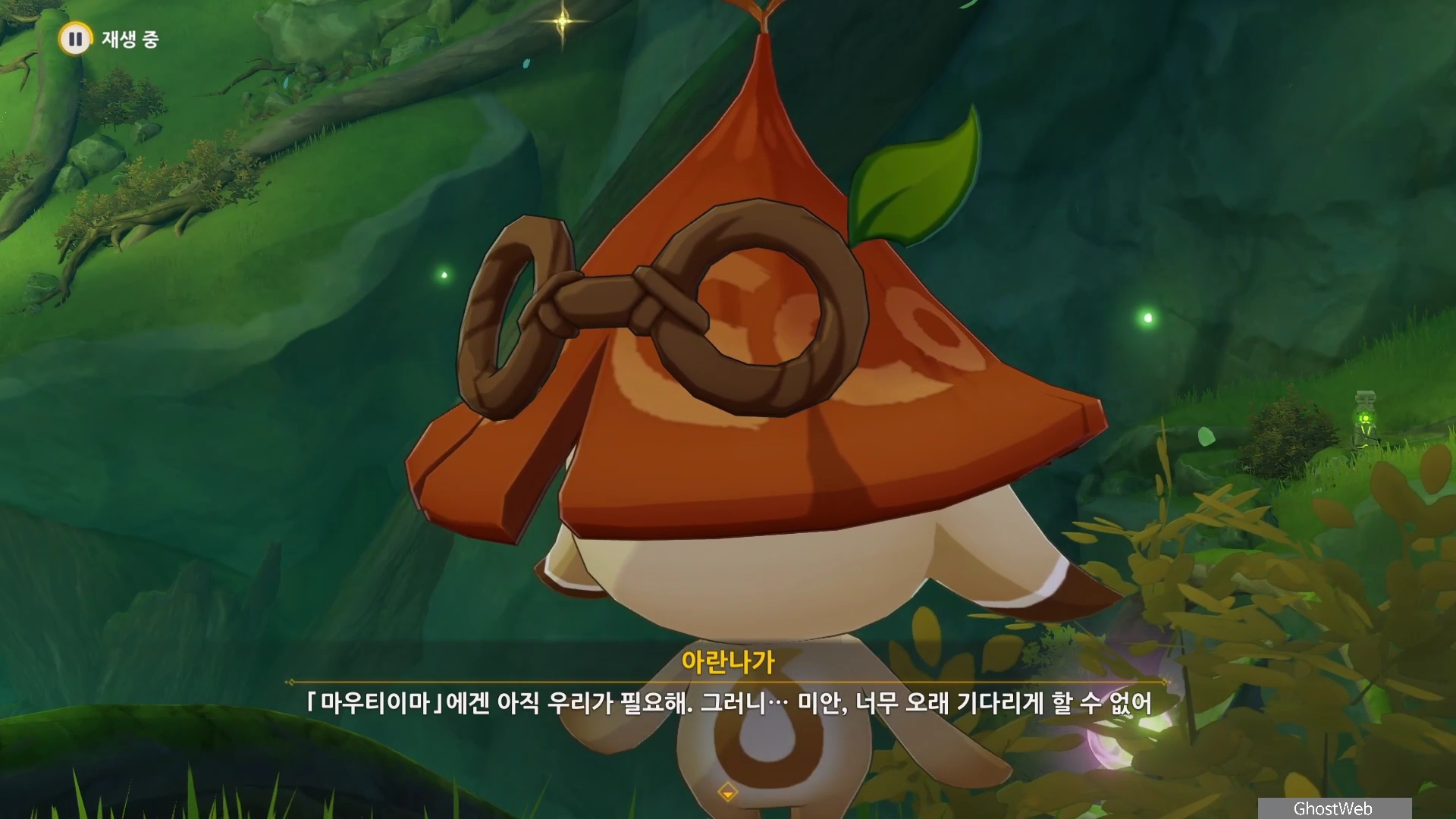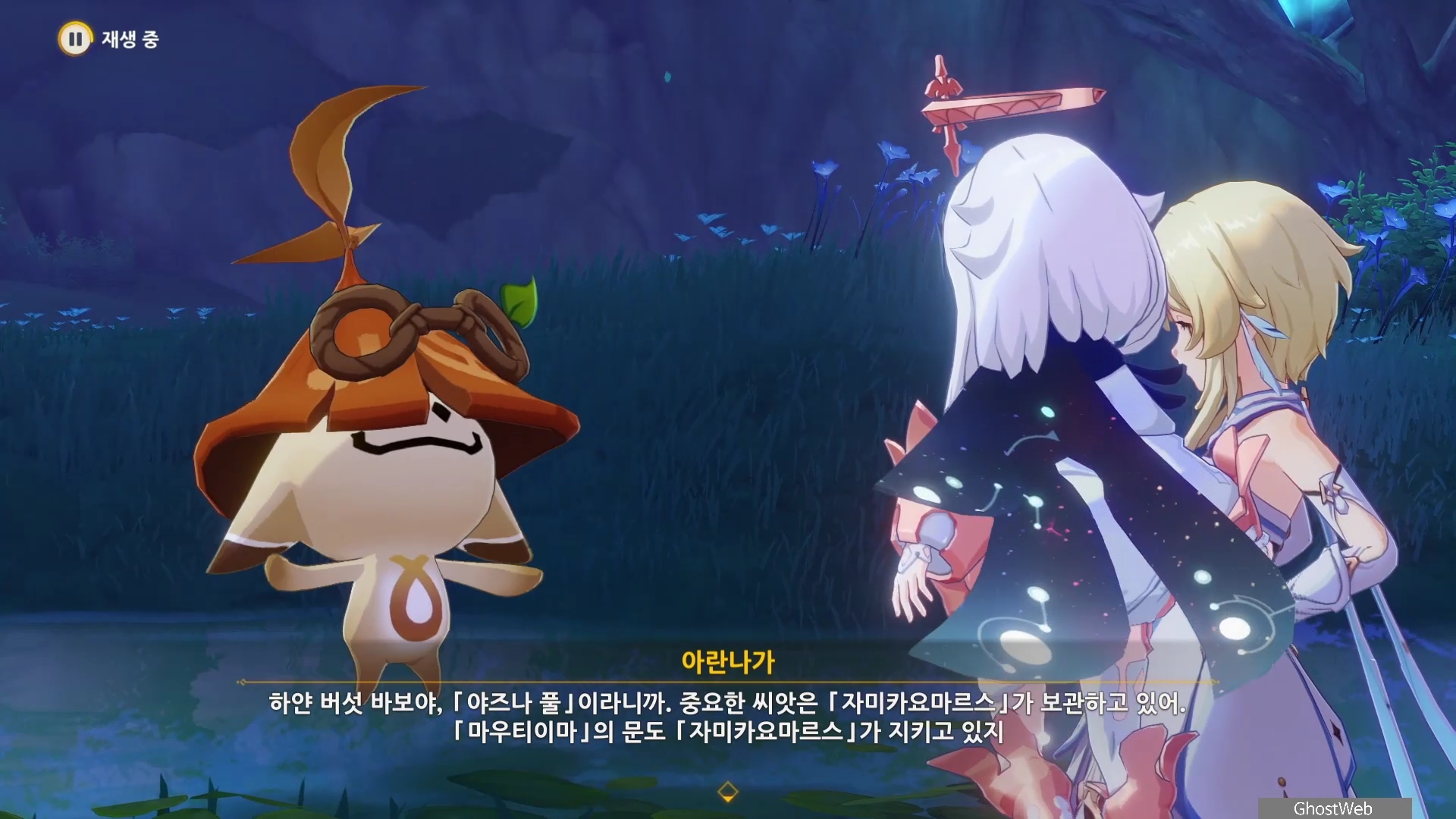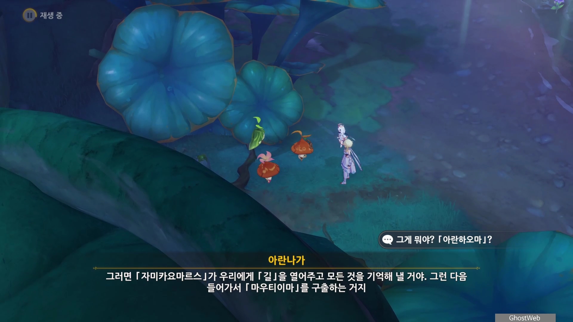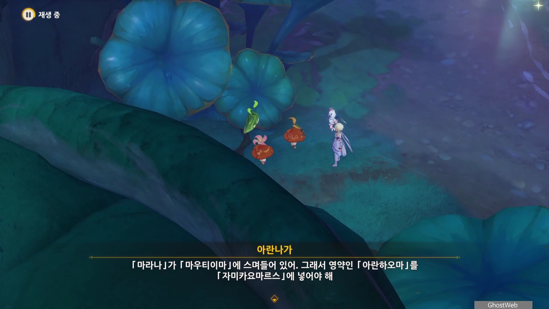 아란나가와 대화를 통해 마라나에게 집어삼켜진 마우티이마가 슬퍼하고 있다며, 여행자에게 야즈나 풀이 있는 곳으로 데려다 주겠다고 해요. (초목의 언어에서 야즈나 풀은 떨어짐을 의미)