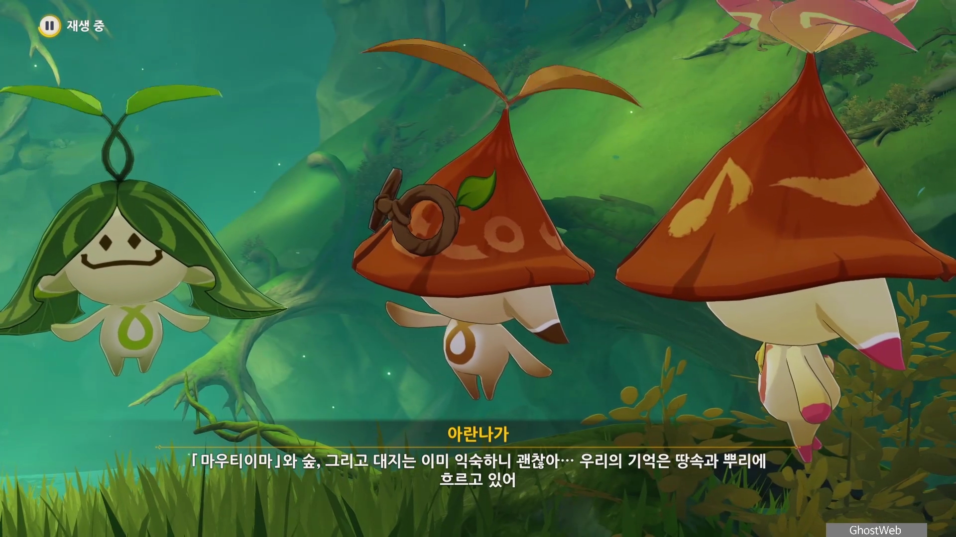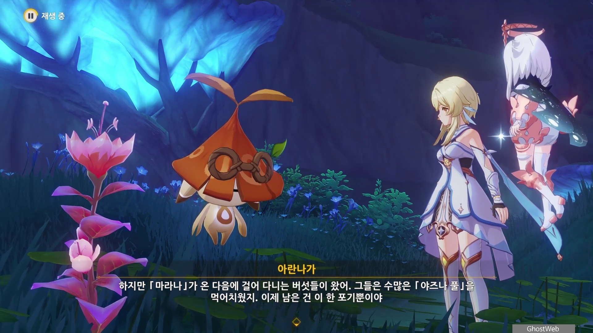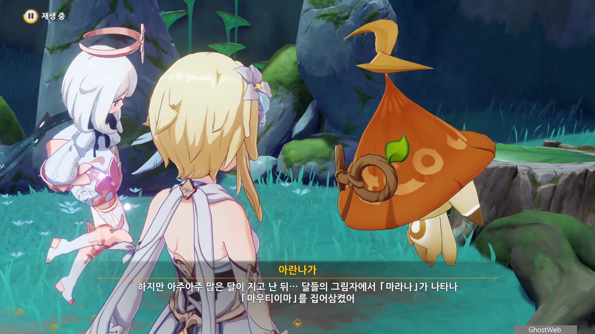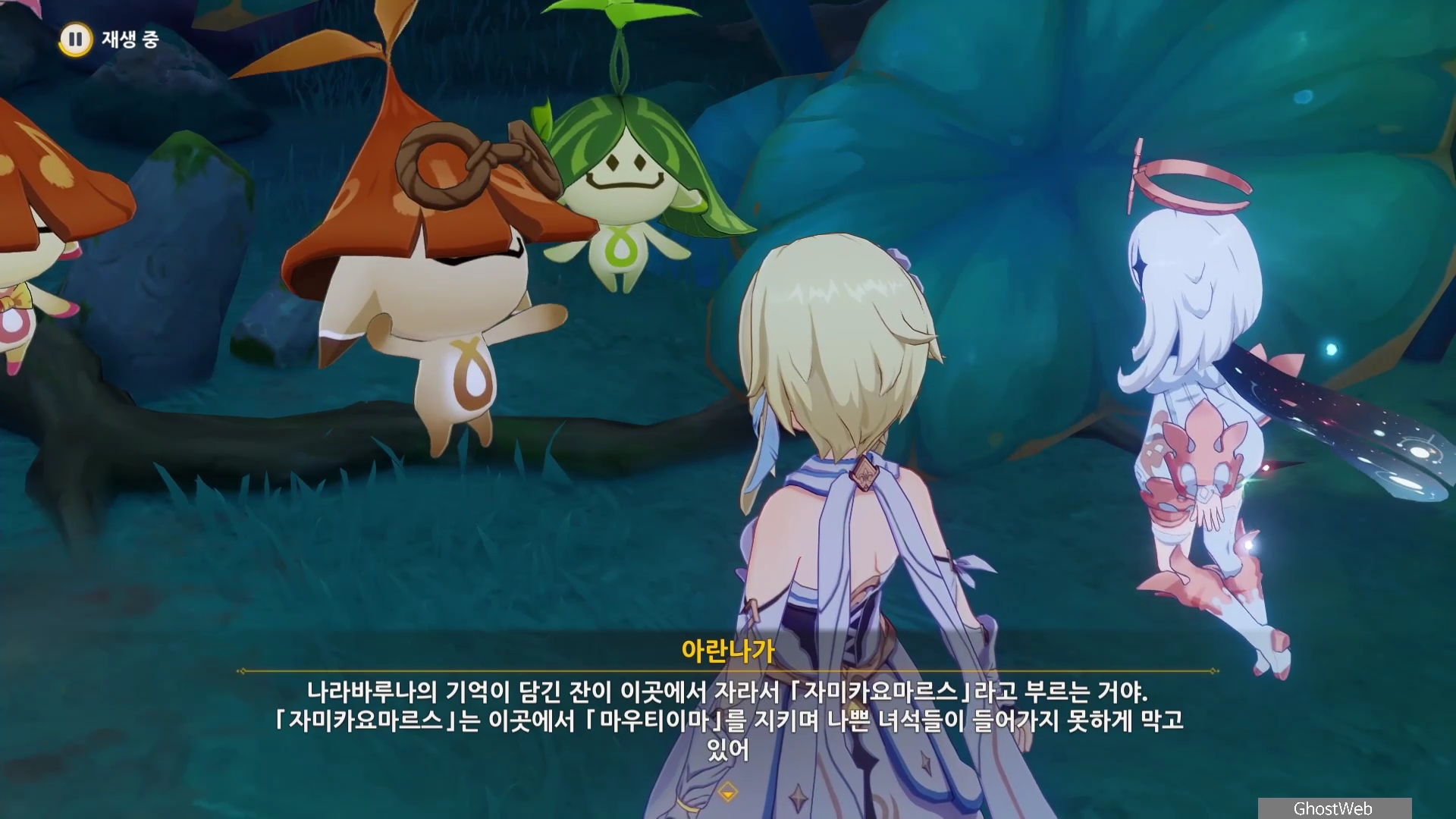 아란나가와 대화를 통해 마라나에게 집어삼켜진 마우티이마가 슬퍼하고 있다며, 여행자에게 야즈나 풀이 있는 곳으로 데려다 주겠다고 해요. (초목의 언어에서 야즈나 풀은 떨어짐을 의미)