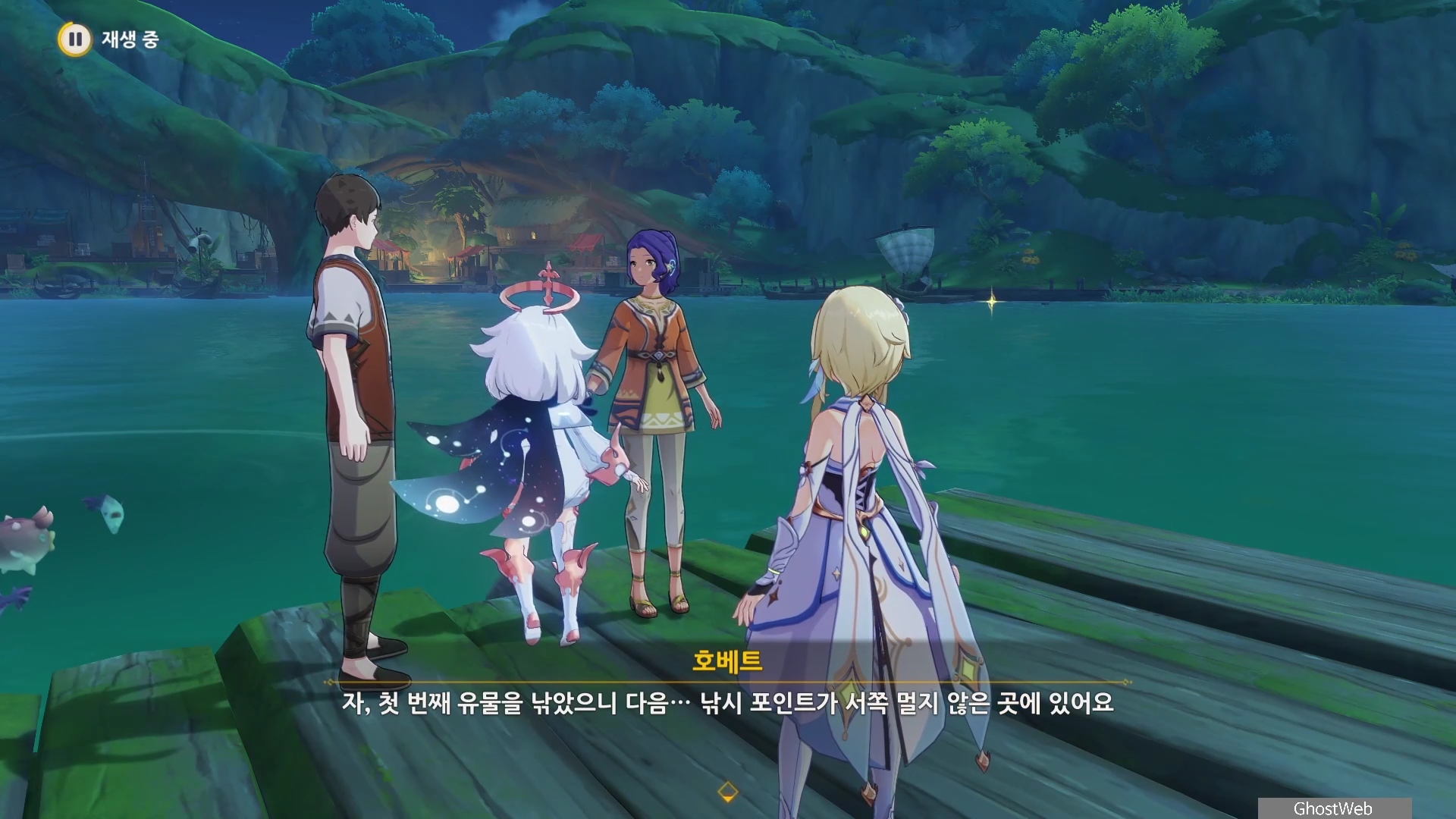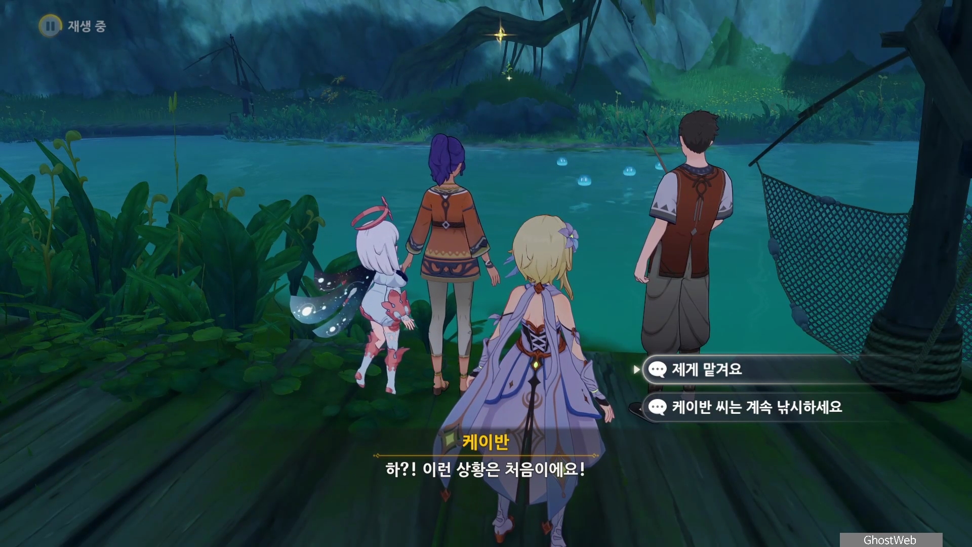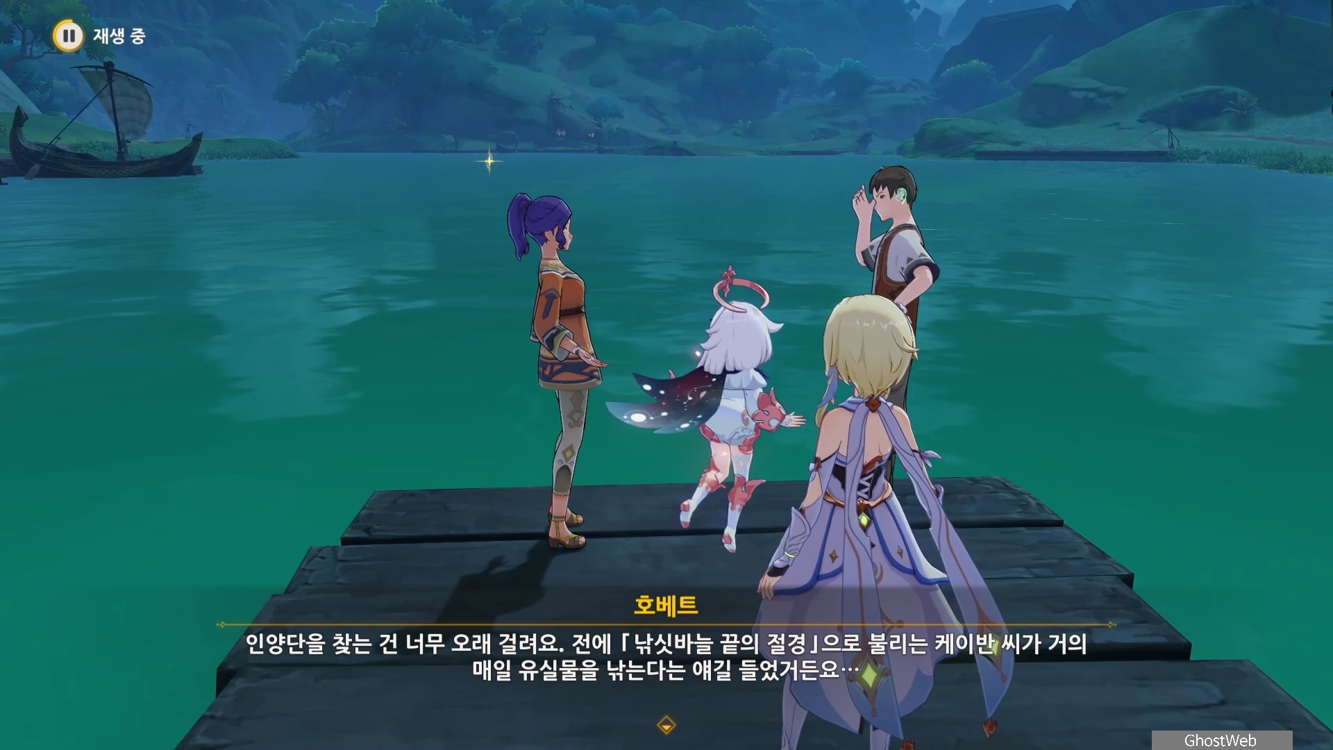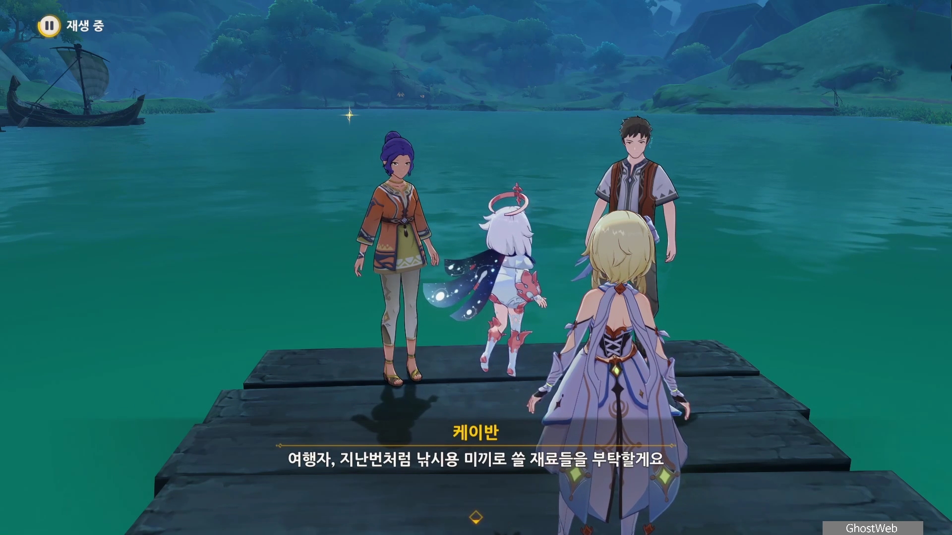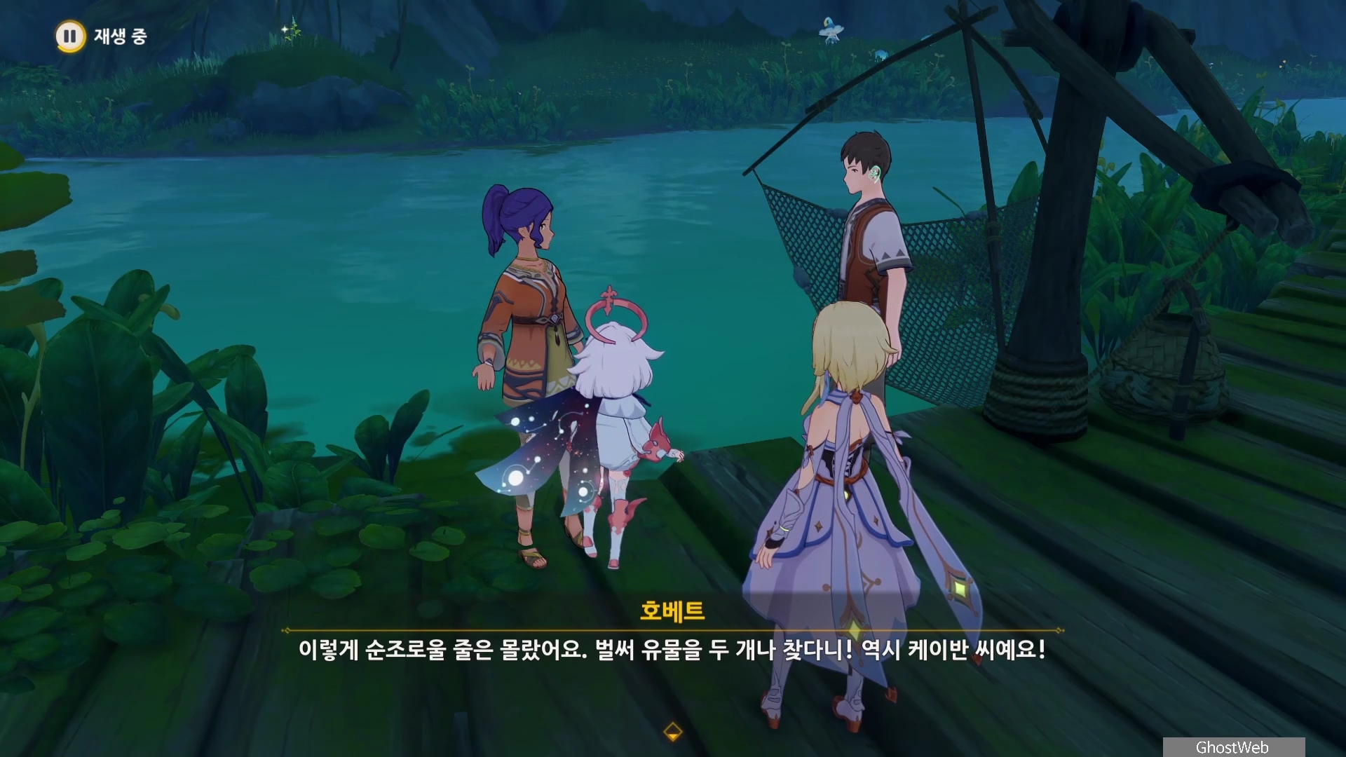 가져온 낚시 재료를 케이반에게 넘기고 그가 낚시를 시작하려는데, 갑자기 나타난 슬라임들이 낚시를 방해하려고 하니 여행자가 슬라임을 처치하면 케이반이 낚시를 시작하는데, 이번에도 역시나 유물을 낚아서 낙담하며 다음 낚시 포인트로 이동하며, 또 여행자에게 낚시 재료를 가져다 달라는 부탁을 해요.