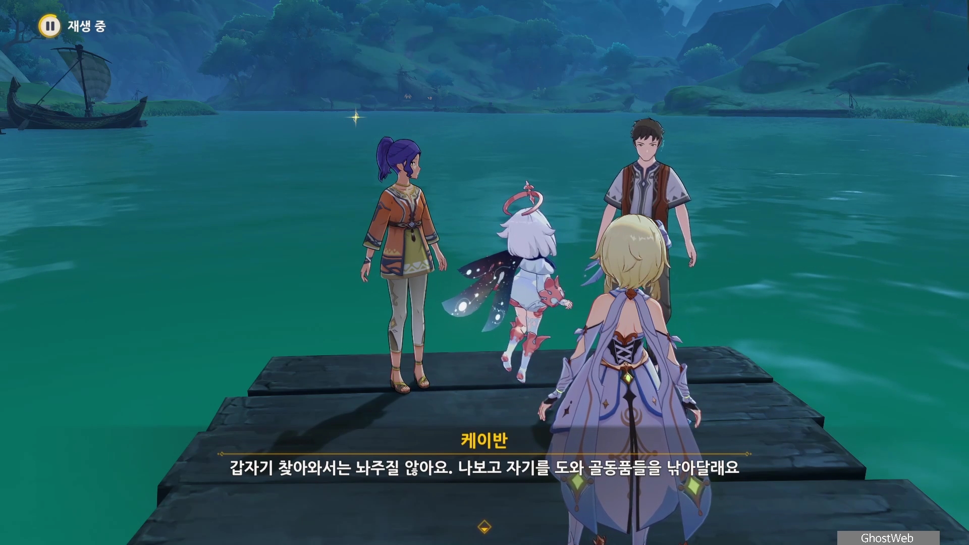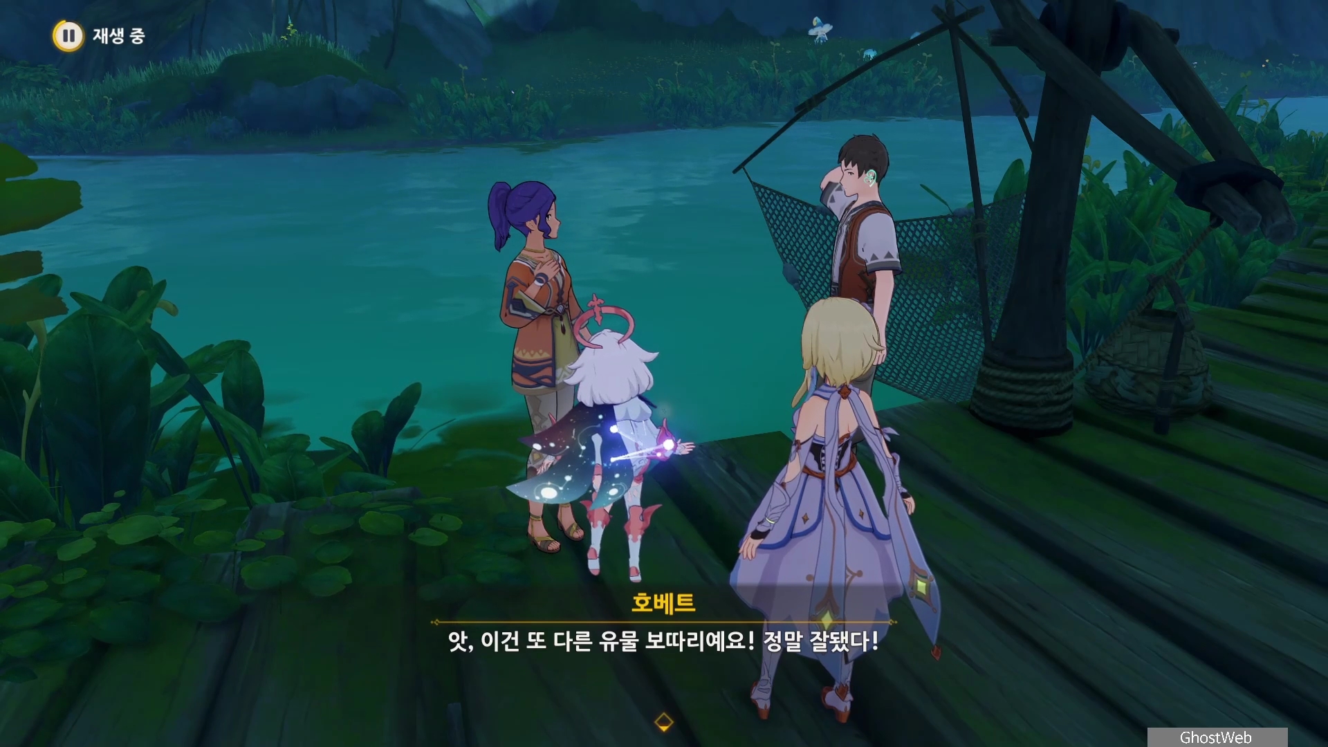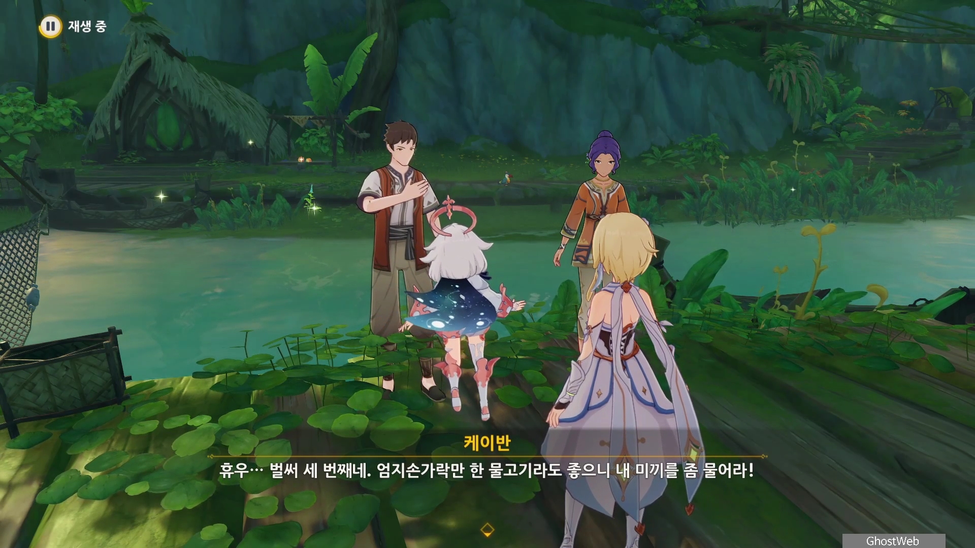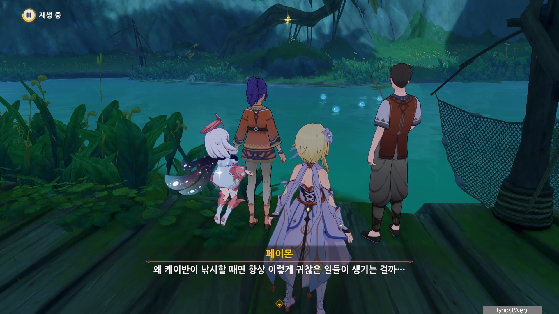 가져온 낚시 재료를 케이반에게 넘기고 그가 낚시를 시작하려는데, 갑자기 나타난 슬라임들이 낚시를 방해하려고 하니 여행자가 슬라임을 처치하면 케이반이 낚시를 시작하는데, 이번에도 역시나 유물을 낚아서 낙담하며 다음 낚시 포인트로 이동하며, 또 여행자에게 낚시 재료를 가져다 달라는 부탁을 해요.