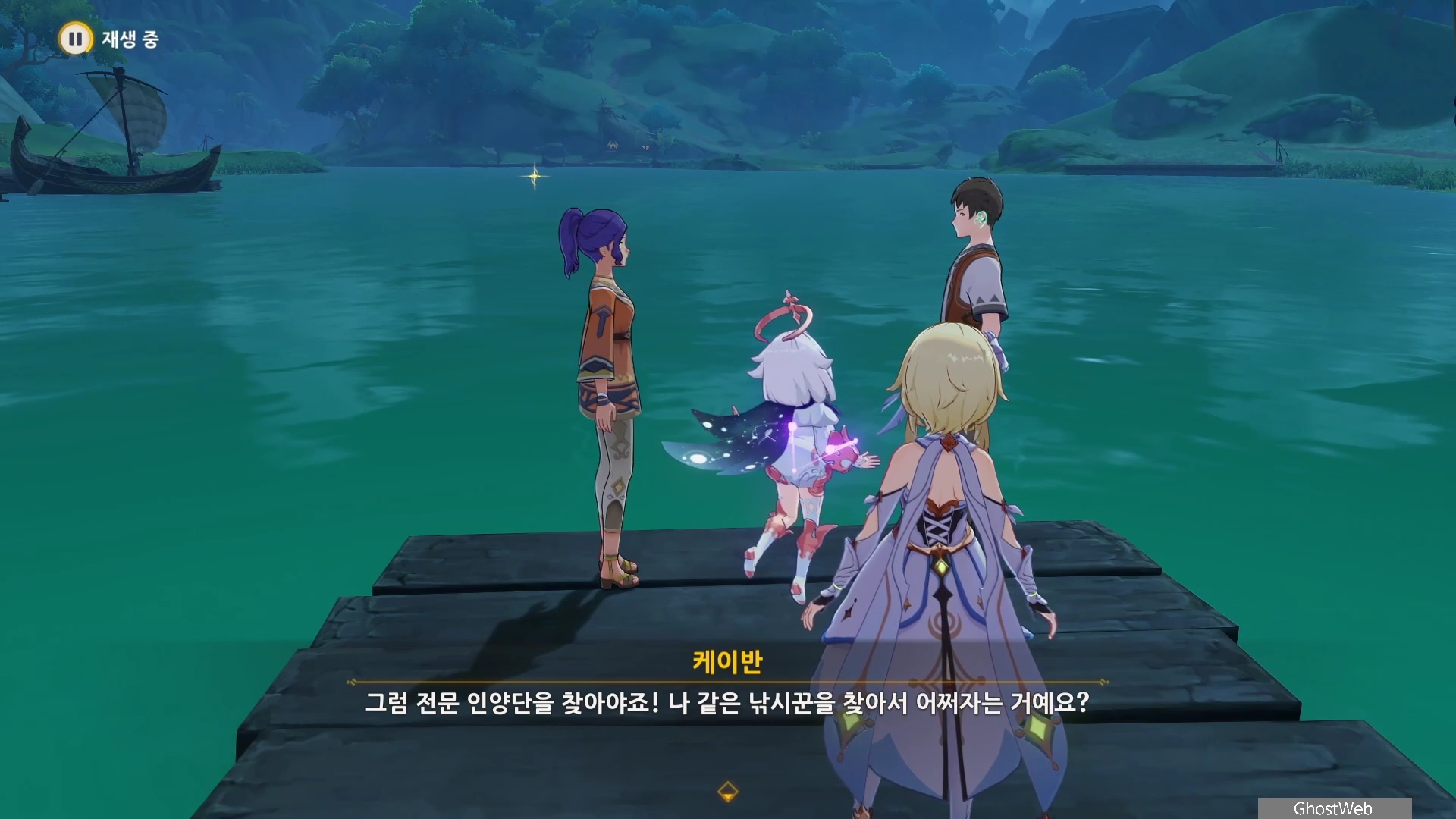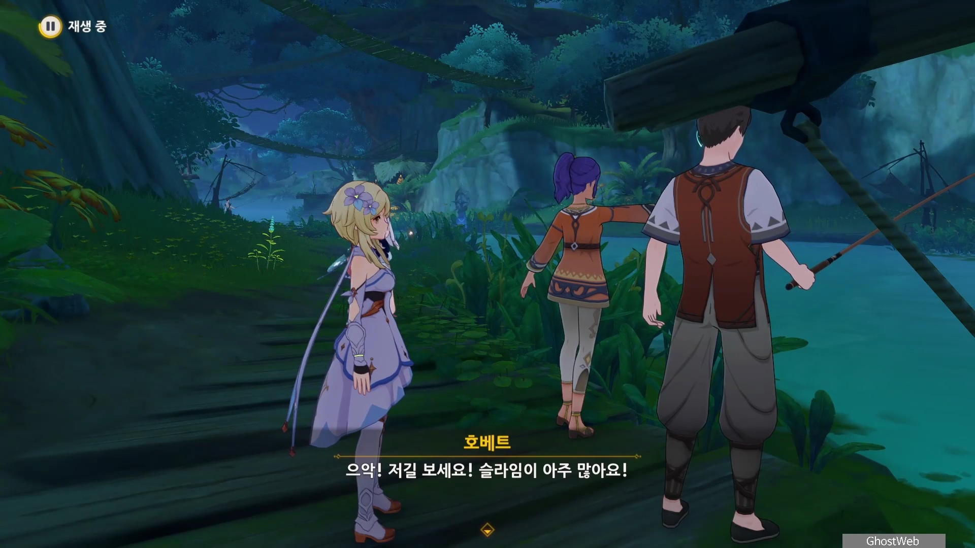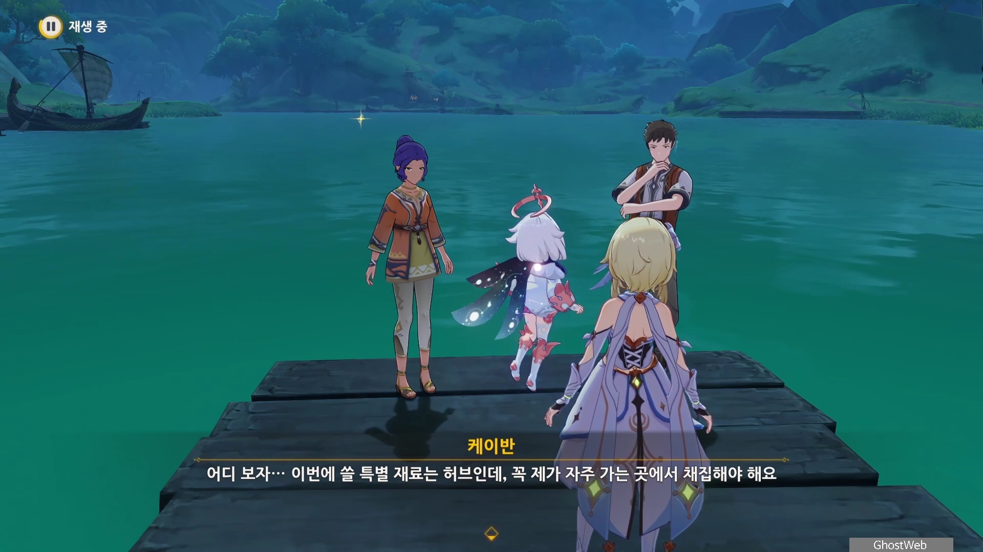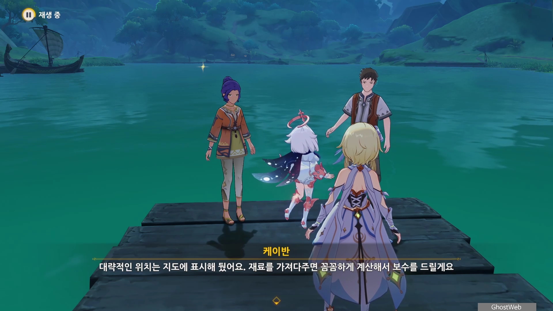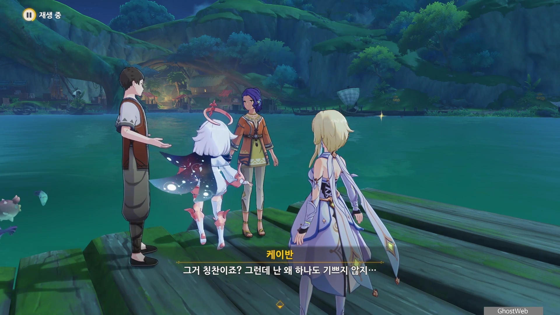 가져온 낚시 재료를 케이반에게 넘기고 그가 낚시를 시작하려는데, 갑자기 나타난 슬라임들이 낚시를 방해하려고 하니 여행자가 슬라임을 처치하면 케이반이 낚시를 시작하는데, 이번에도 역시나 유물을 낚아서 낙담하며 다음 낚시 포인트로 이동하며, 또 여행자에게 낚시 재료를 가져다 달라는 부탁을 해요.