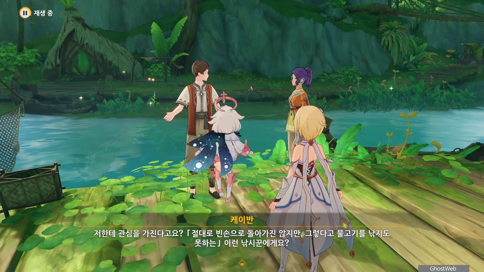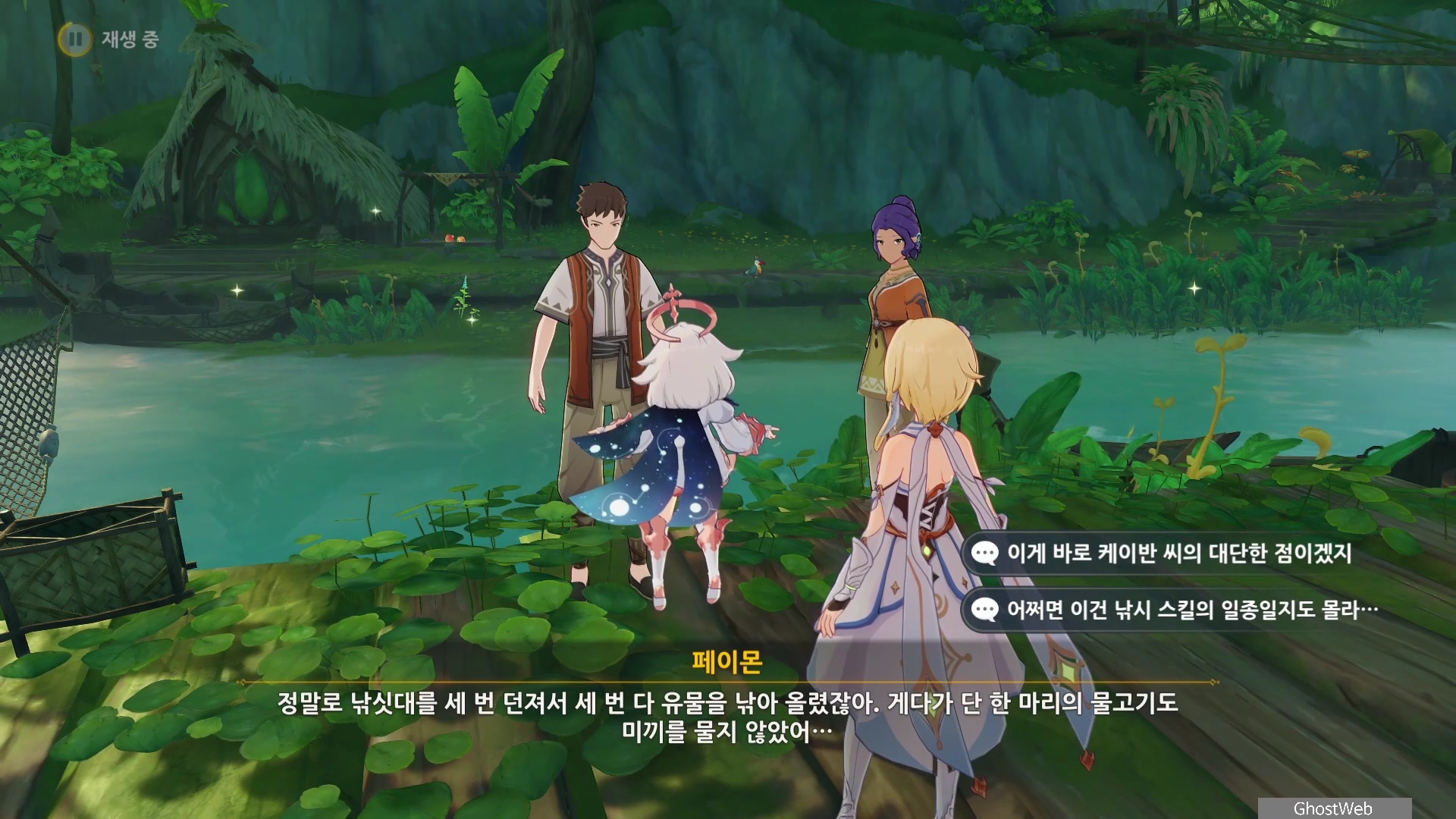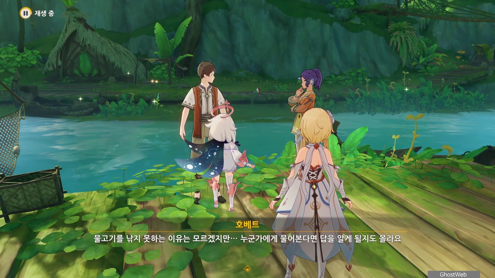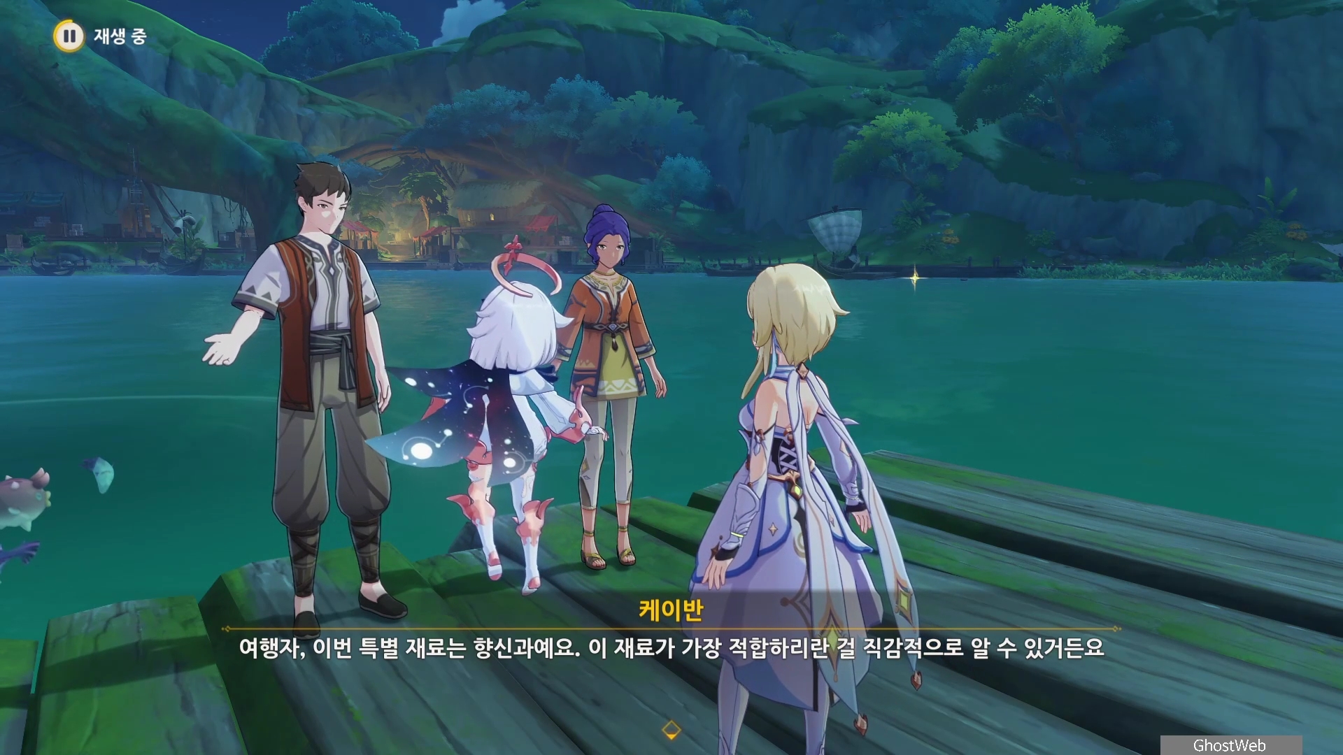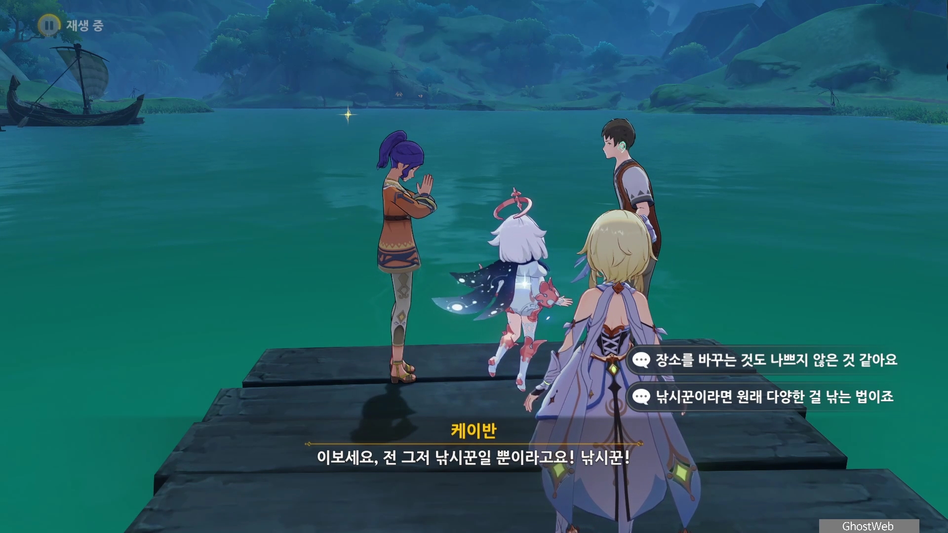 가져온 낚시 재료를 케이반에게 넘기고 그가 낚시를 시작하려는데, 갑자기 나타난 슬라임들이 낚시를 방해하려고 하니 여행자가 슬라임을 처치하면 케이반이 낚시를 시작하는데, 이번에도 역시나 유물을 낚아서 낙담하며 다음 낚시 포인트로 이동하며, 또 여행자에게 낚시 재료를 가져다 달라는 부탁을 해요.