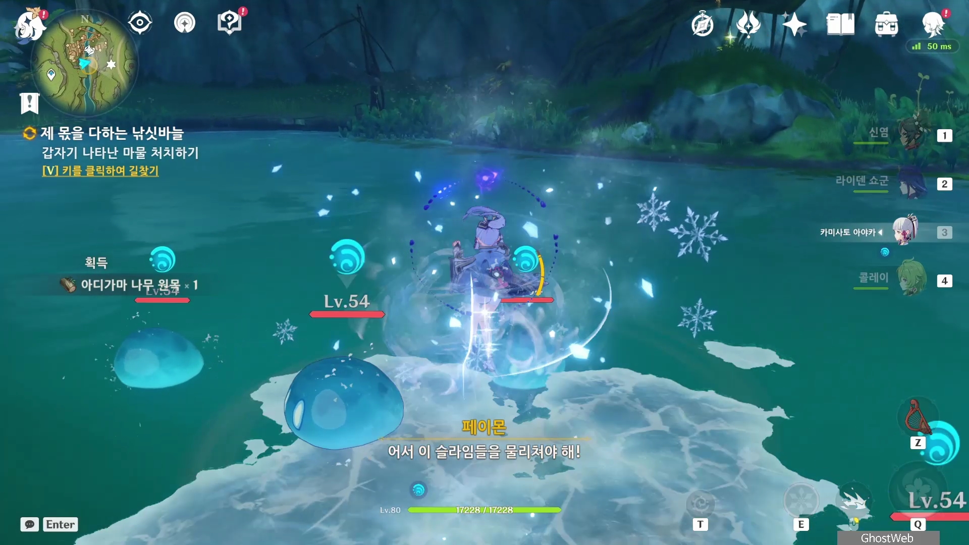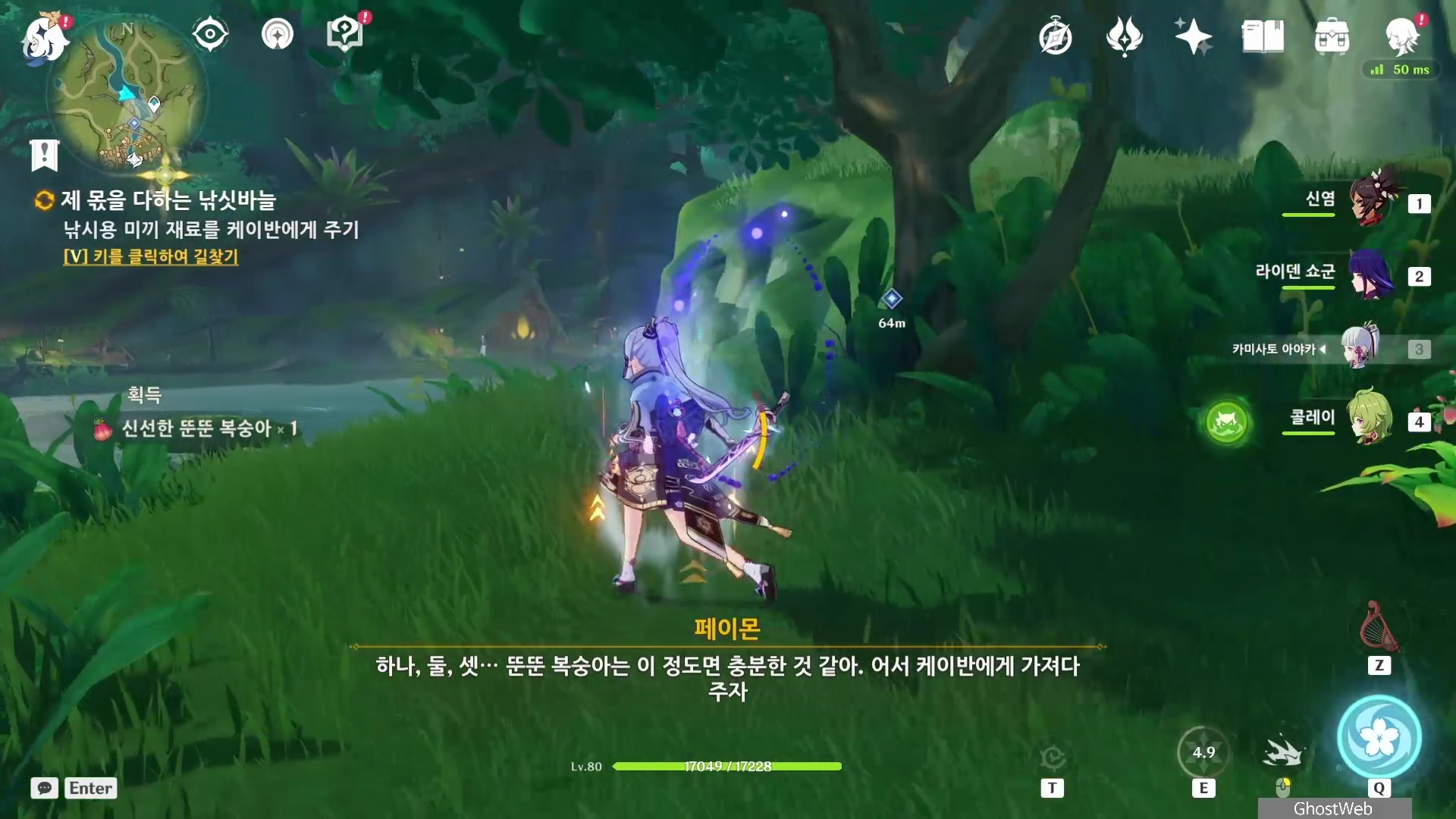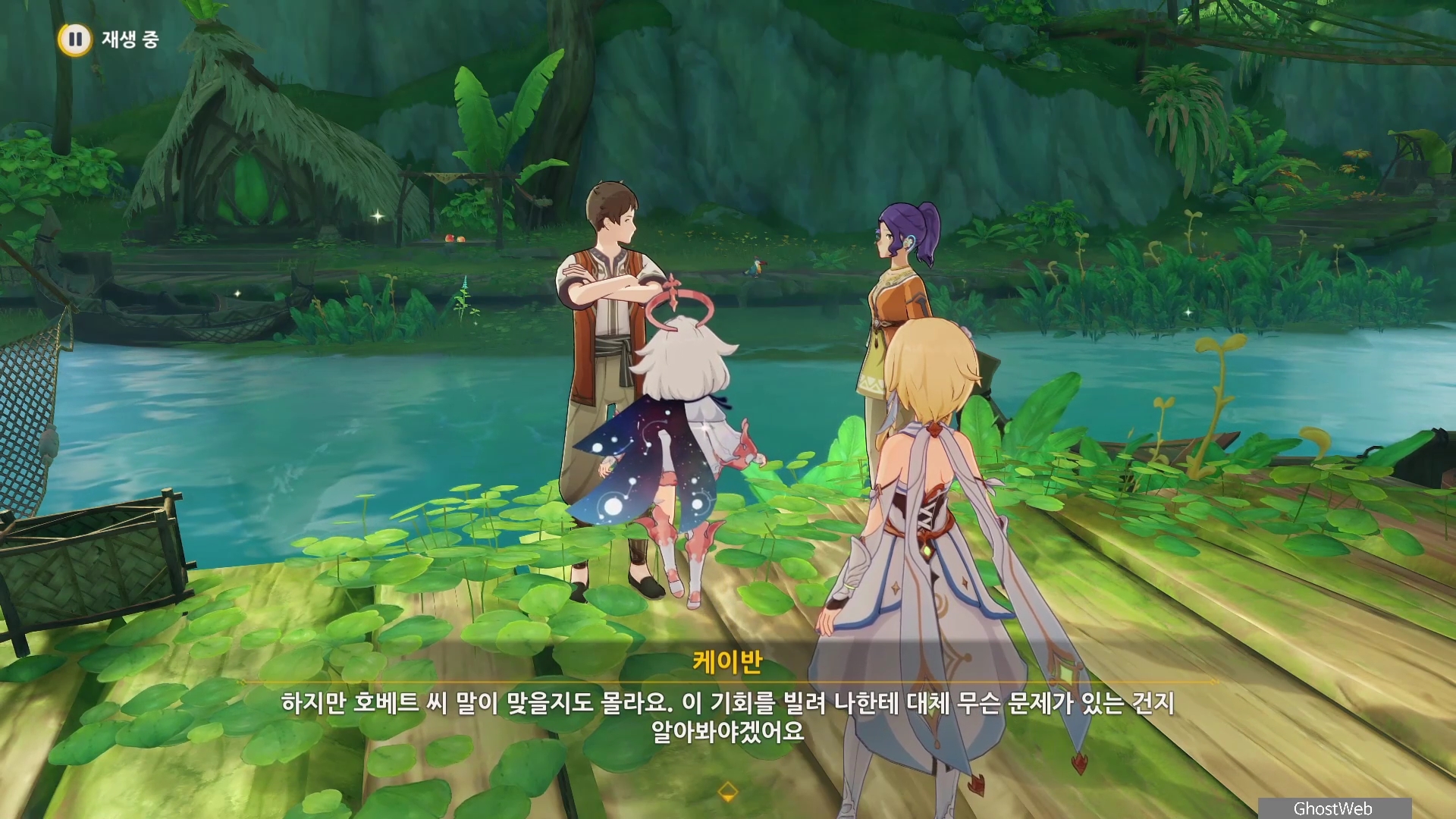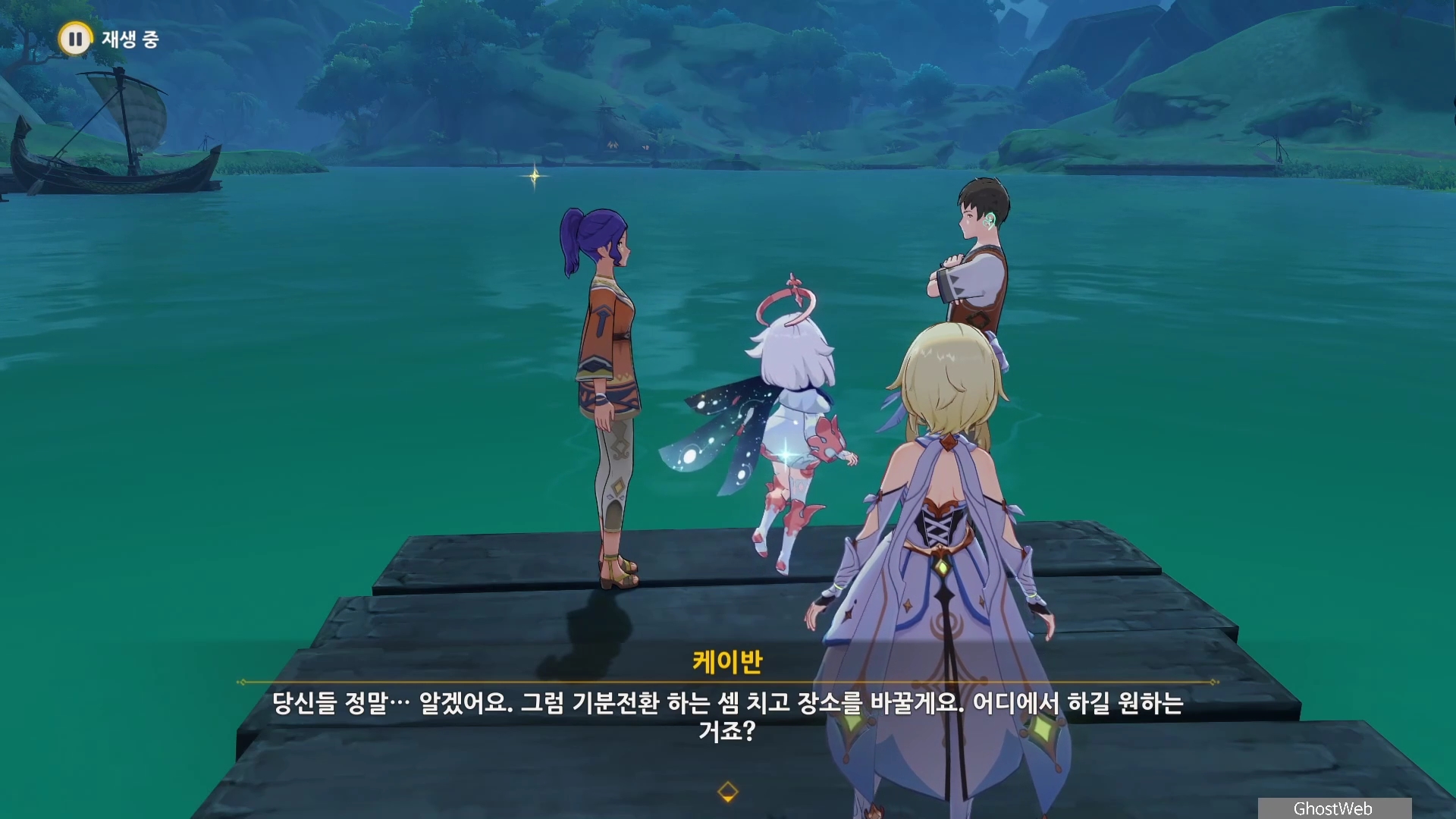 가져온 낚시 재료를 케이반에게 넘기고 그가 낚시를 시작하려는데, 갑자기 나타난 슬라임들이 낚시를 방해하려고 하니 여행자가 슬라임을 처치하면 케이반이 낚시를 시작하는데, 이번에도 역시나 유물을 낚아서 낙담하며 다음 낚시 포인트로 이동하며, 또 여행자에게 낚시 재료를 가져다 달라는 부탁을 해요.