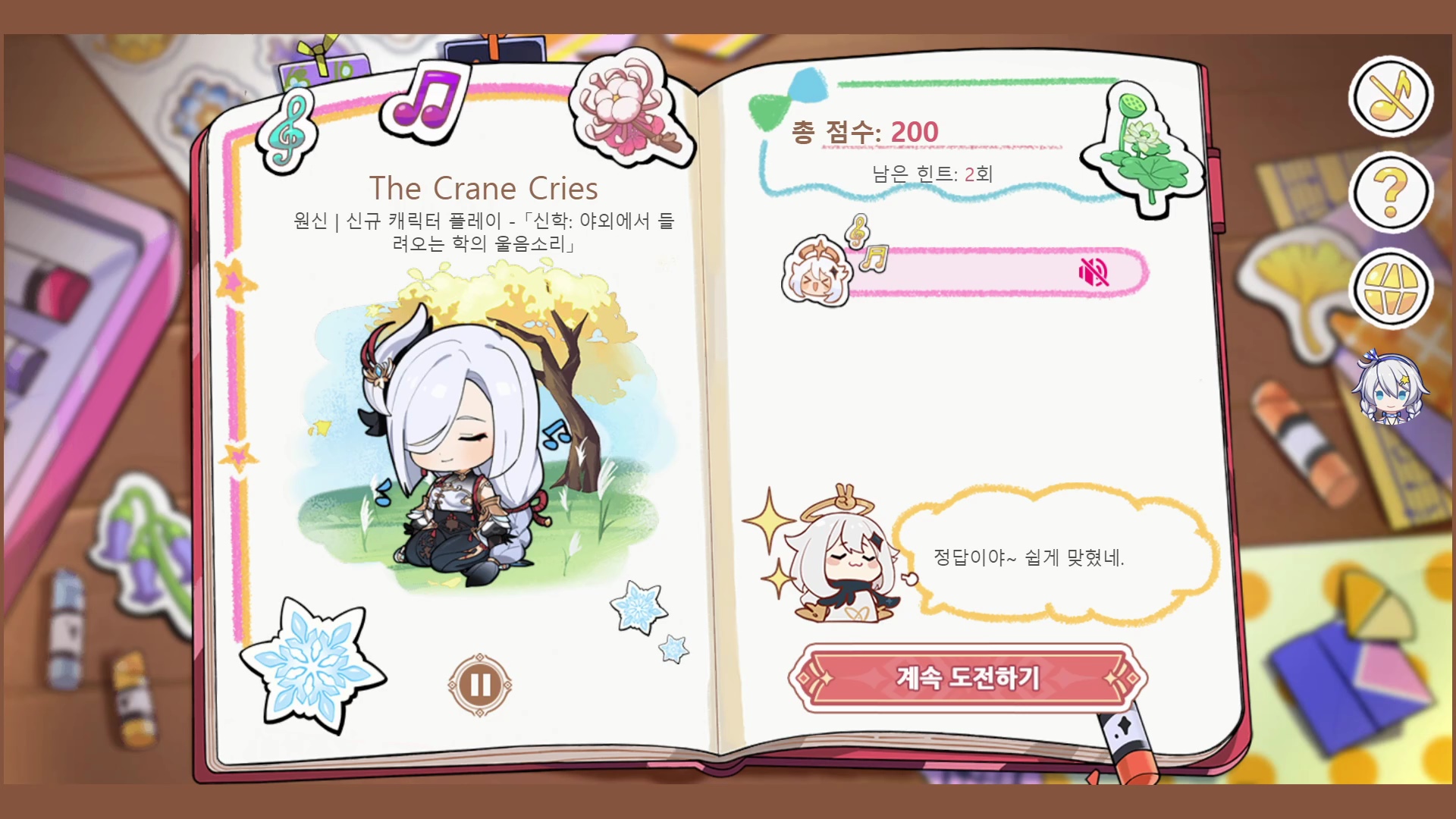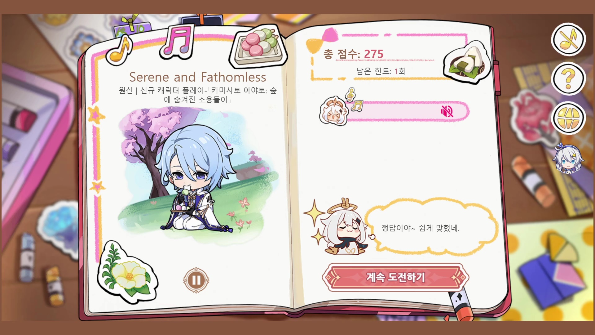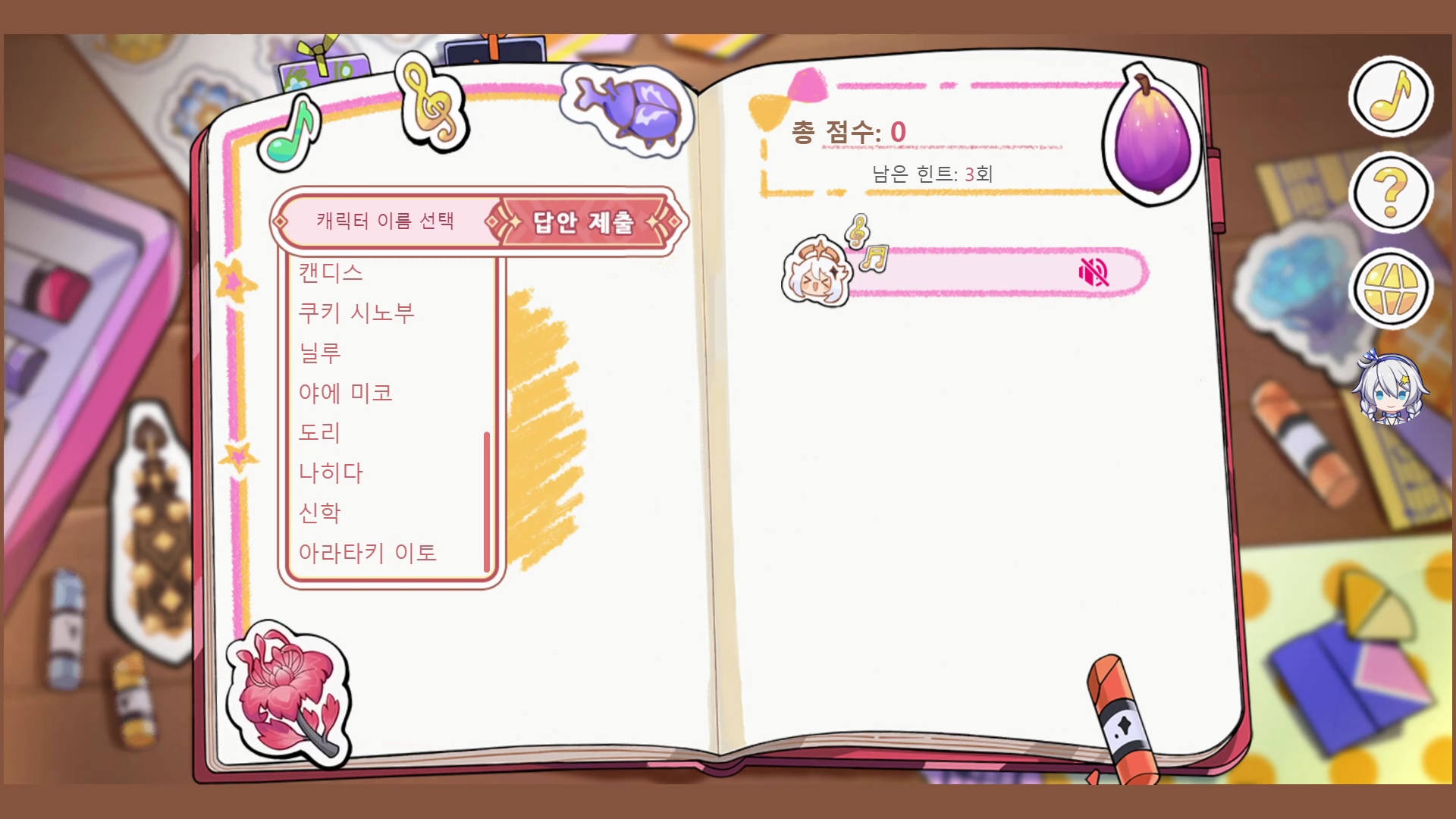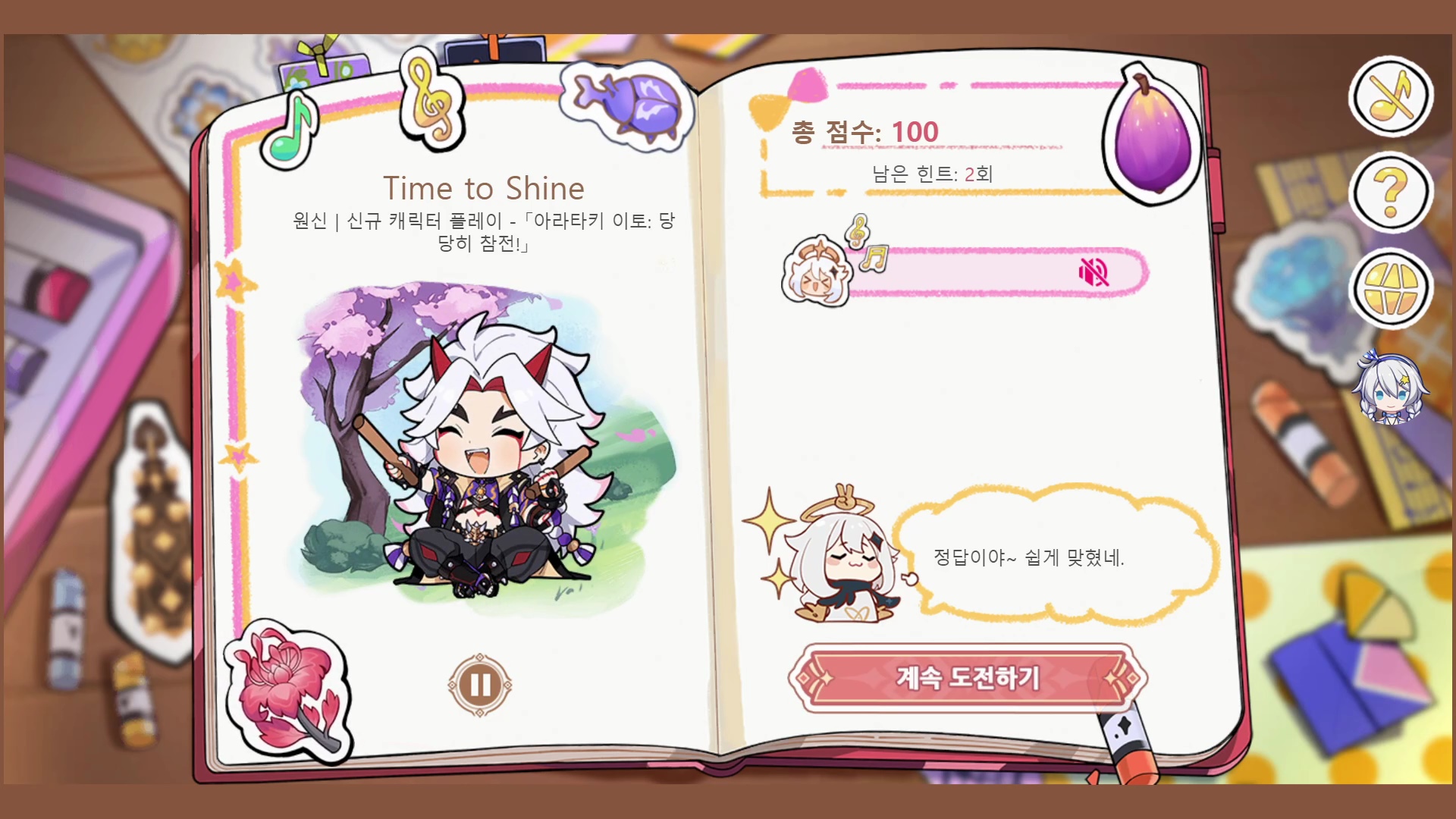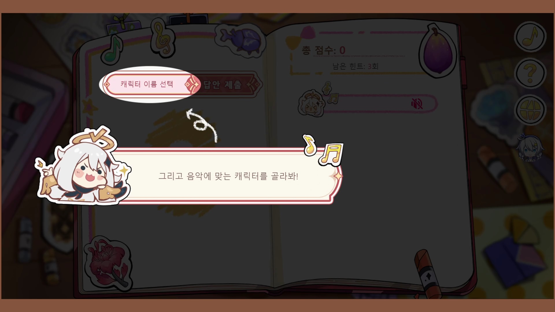 솔직히 얼마 시작한 플레이어에게는 약간의 난이도가 있는 이벤트지만, 어느 정도 스토리를 진행한 플레이어라면 음악과 각 페이지 별 캐릭터에 대한 힌트를 얻을 수 있는 이미지를 참고하여 느낌상으로 찍을 수 있어요.