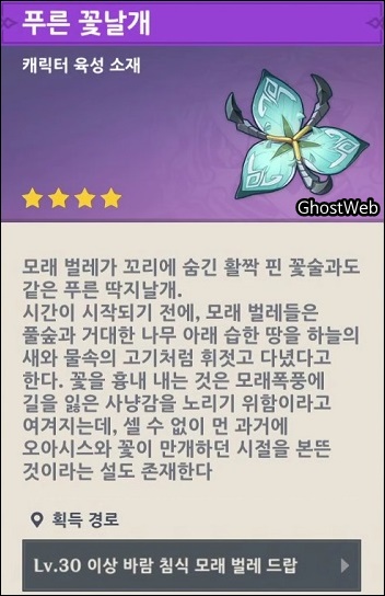 - 푸른 꽃날개 (바람 침식 모래 벌레 처치/위치)