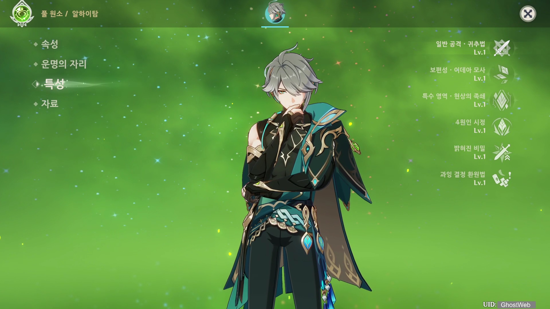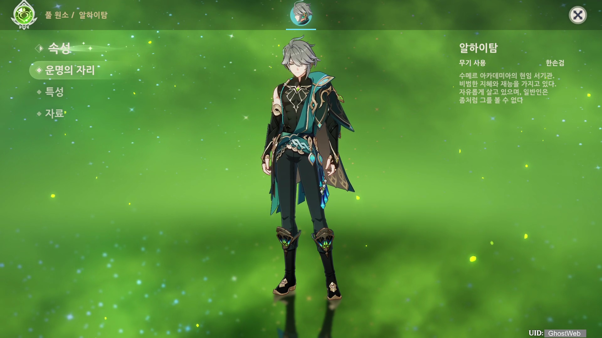 알하이탐은 풀 원소 한손검 캐릭터로 별명이 풀 원소 각청라고 불리며, 딜러 포지션에 위치한 캐릭터에요.