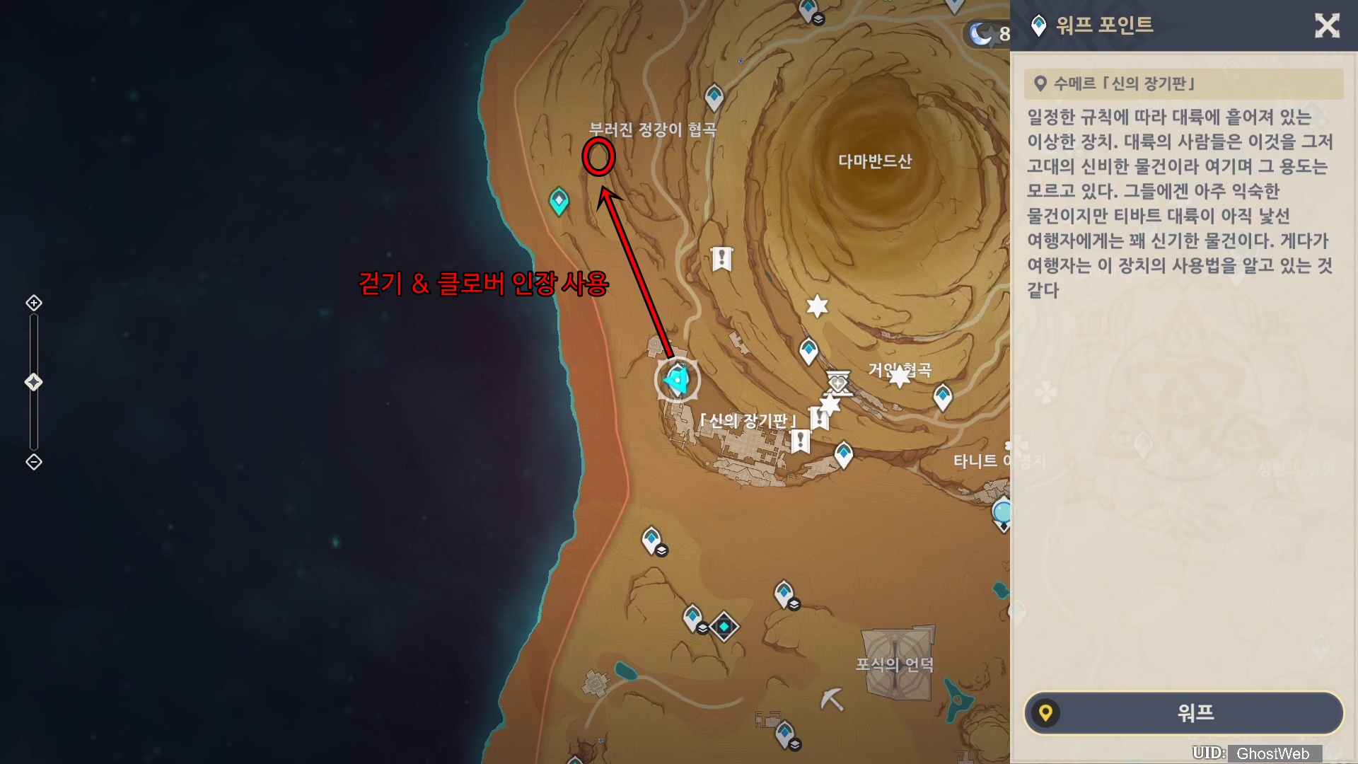 다마반드산 기준 9시 방향 언덕 위에 있는 지령 감실은 <신의 장기판> 왼쪽 위에 있는 워프 포인트에서 걸어서 근처에 있는 클로버 인장(T키)를 타고 빠르게 접근할 수 있어요.