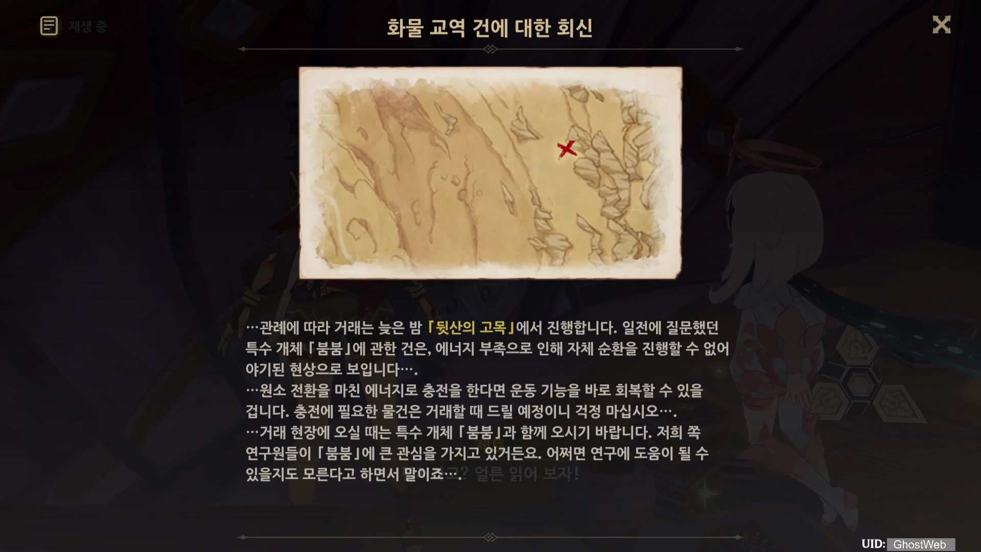 책상을 조사하다가 <뒷산의 고목>에서 붐붐을 충전할 수 있는 물건(충전 전환 용기)을 줄테니 붐붐을 데려오라는 우인단과 내통한 편지를 찾고 여행자는 붐붐을 지켜야되는 제트 대신 그 지역으로 가서 우인단에게 <충전 전환 용기>를 빼앗아 오기로 해요.