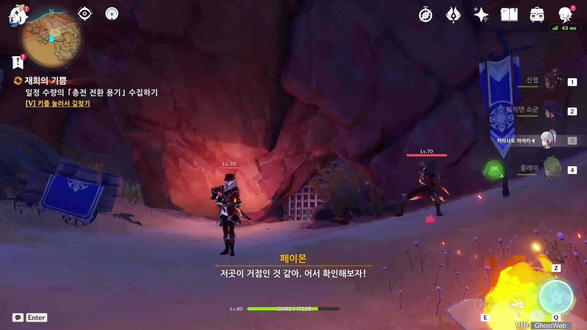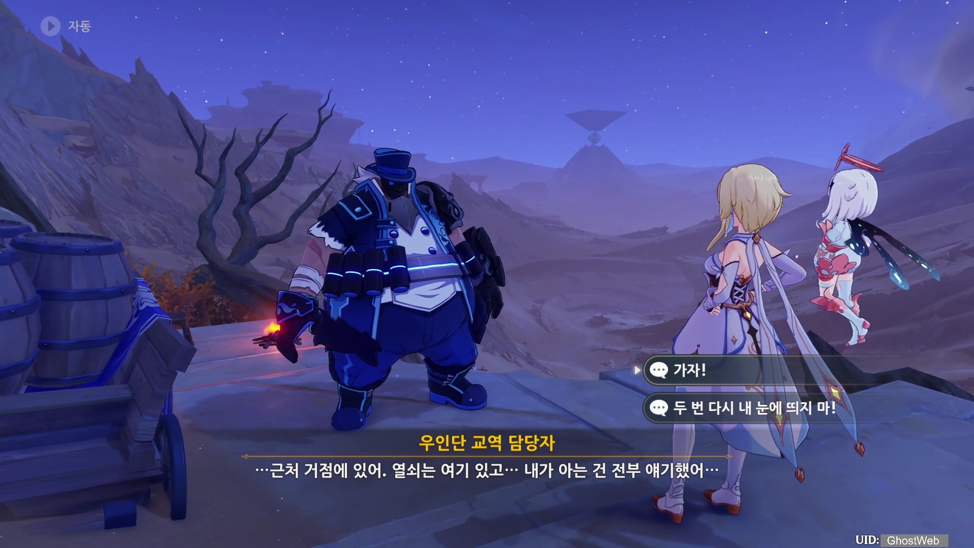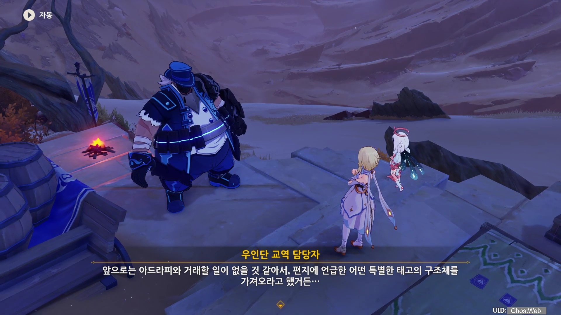 밤에 나타난 우인단 패거리를 처치하고우인단을 처치하고 <우인단 거점 열쇠>를 얻은 다음, 지도에 표시된 동굴로 가 앞에 있는 우이단을 처치하고 <우인단 거점 열쇠>를 이용하여 철문을 열고 안으로 들어가 <3개의 충전 전환 용기>를 얻은 후 다시 <타니트 야영지>로 돌아가 제트에게 충전 전환 용기를 전달하세요.