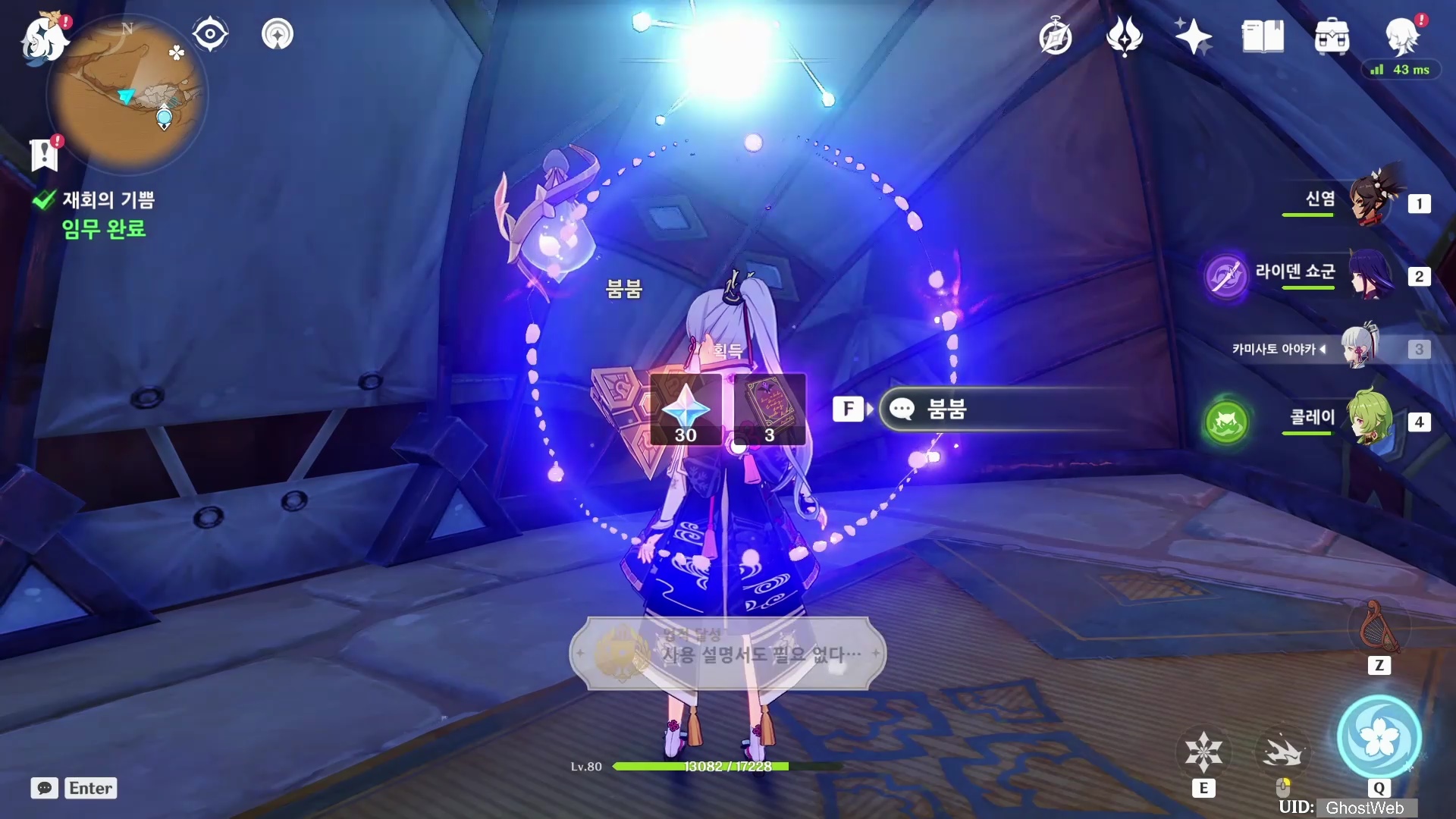 충전 전황 용기에 연결된 붐붐은 에너지를 흡수하여 다시 깨어나, 여행자에게 고맙다고 하지만 좀 더 회복해야할 거 같다는 제트의 말을 끝으로 임무가 종료되며 임무 보상으로 원석 30개와 <사용 설명서도 필요 없다.> 업적을 달성할 수 있어요.