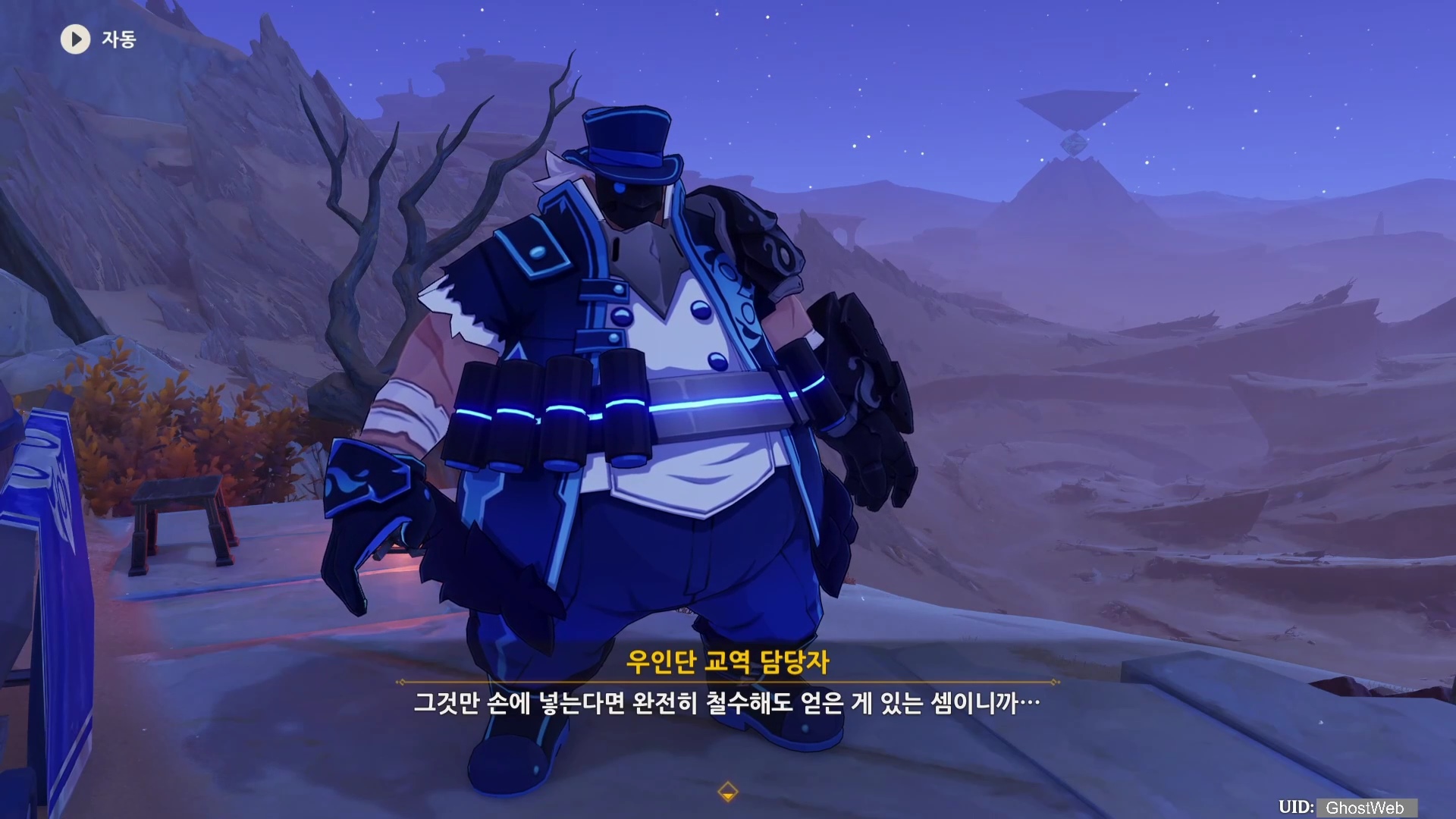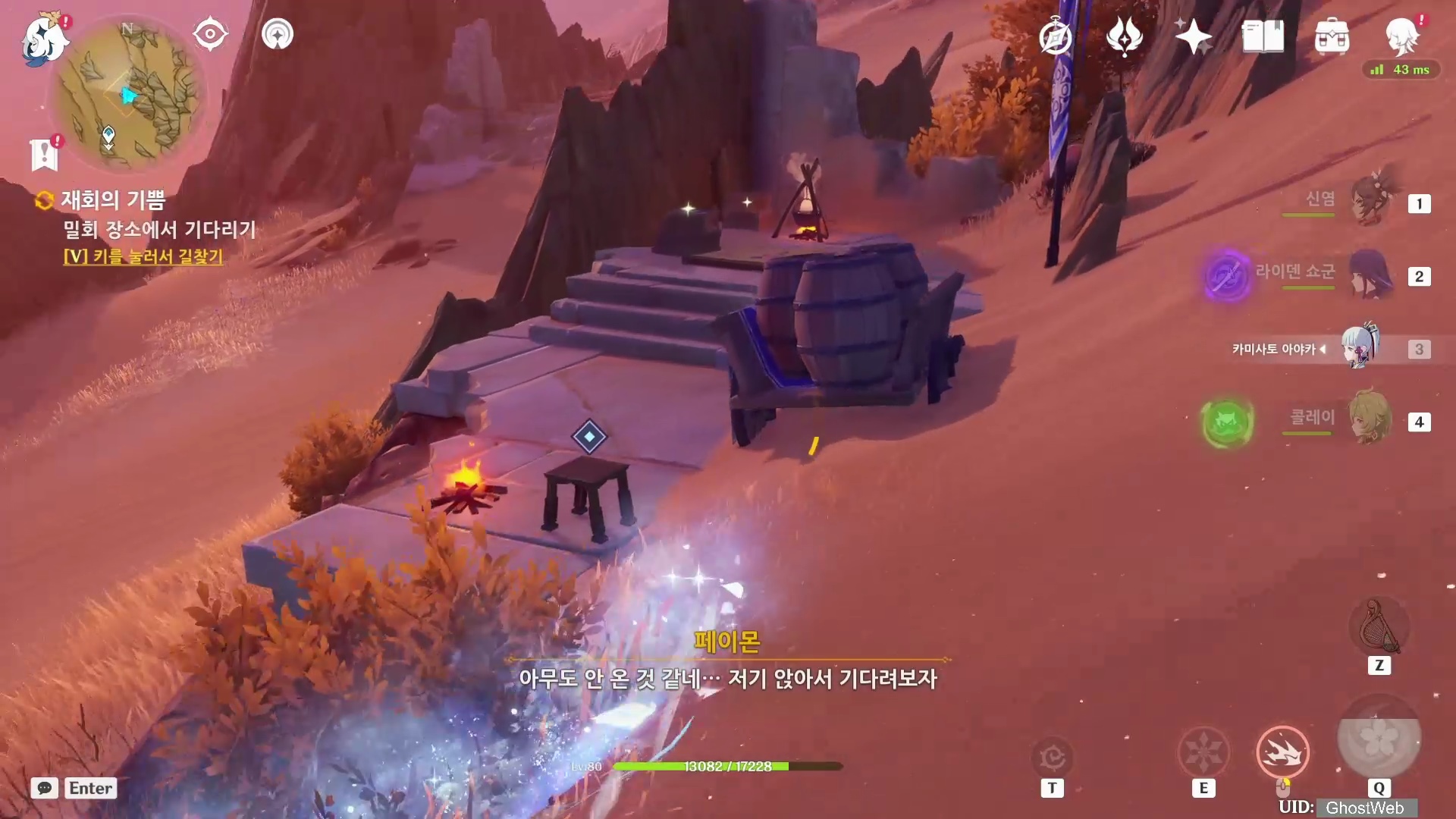수메르 - 하드라마베스 사막 지역 중앙 기준 3시 방향에 있는 <무쇠 모래 언덕> 워프 포인트로 이동하여 12~1시 방향으로가다 보면 있는 야영지의 의자에 앉아 우인단을 기다리기로 해요.