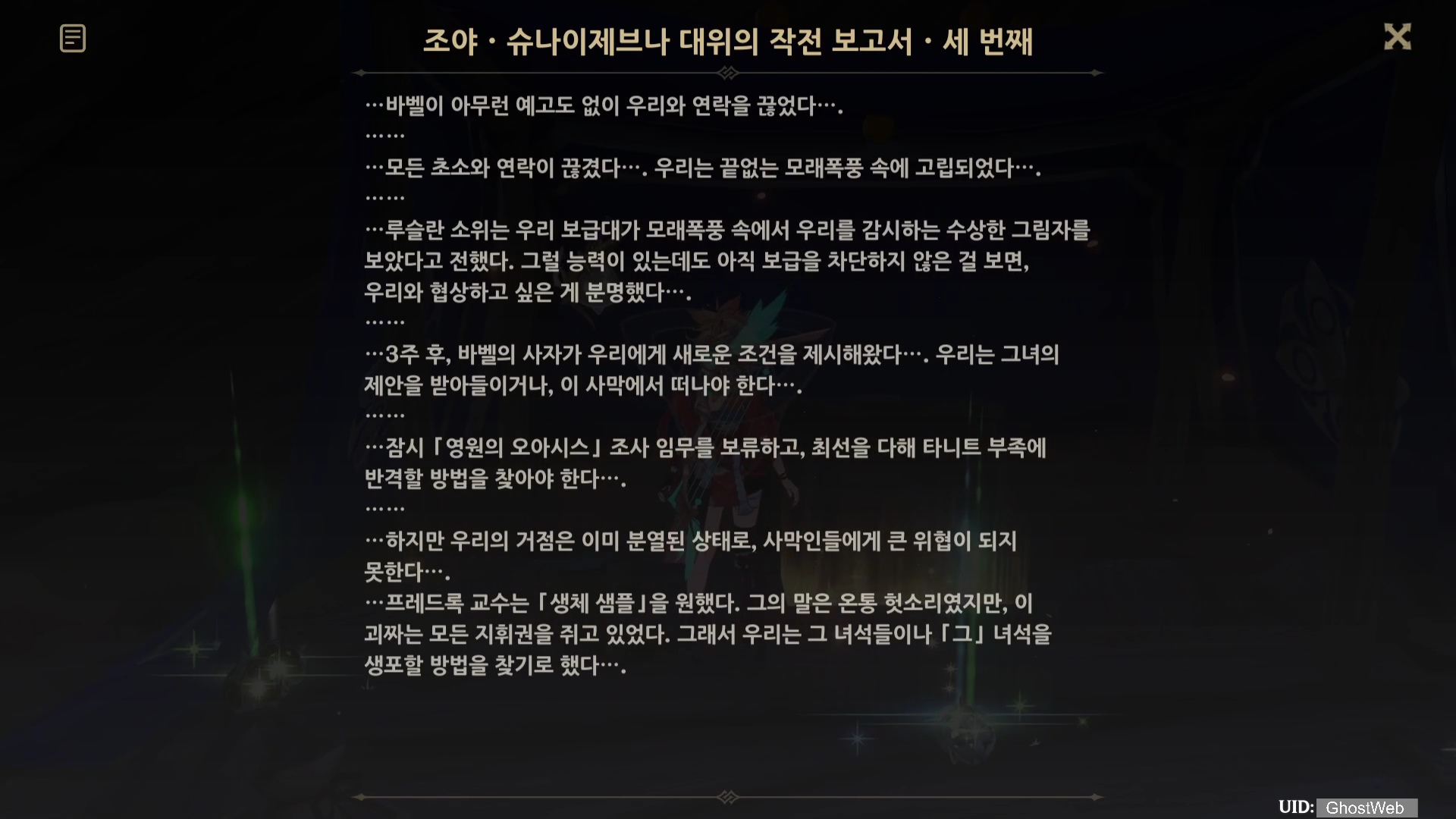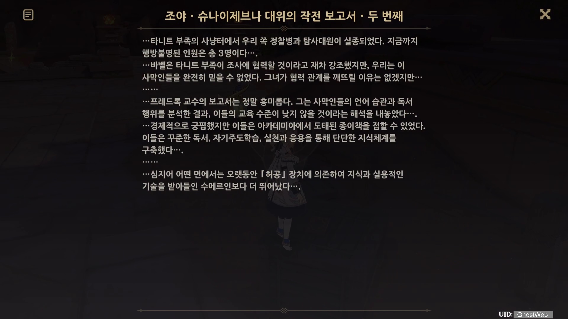 이번에는 수메르 - 하드라마베스 사막 지역에서 발견할 수 있는 <조야 - 슈나이제브나 대위의 작전 보고서>의 위치와 내용을 정리해보도록 할게요.