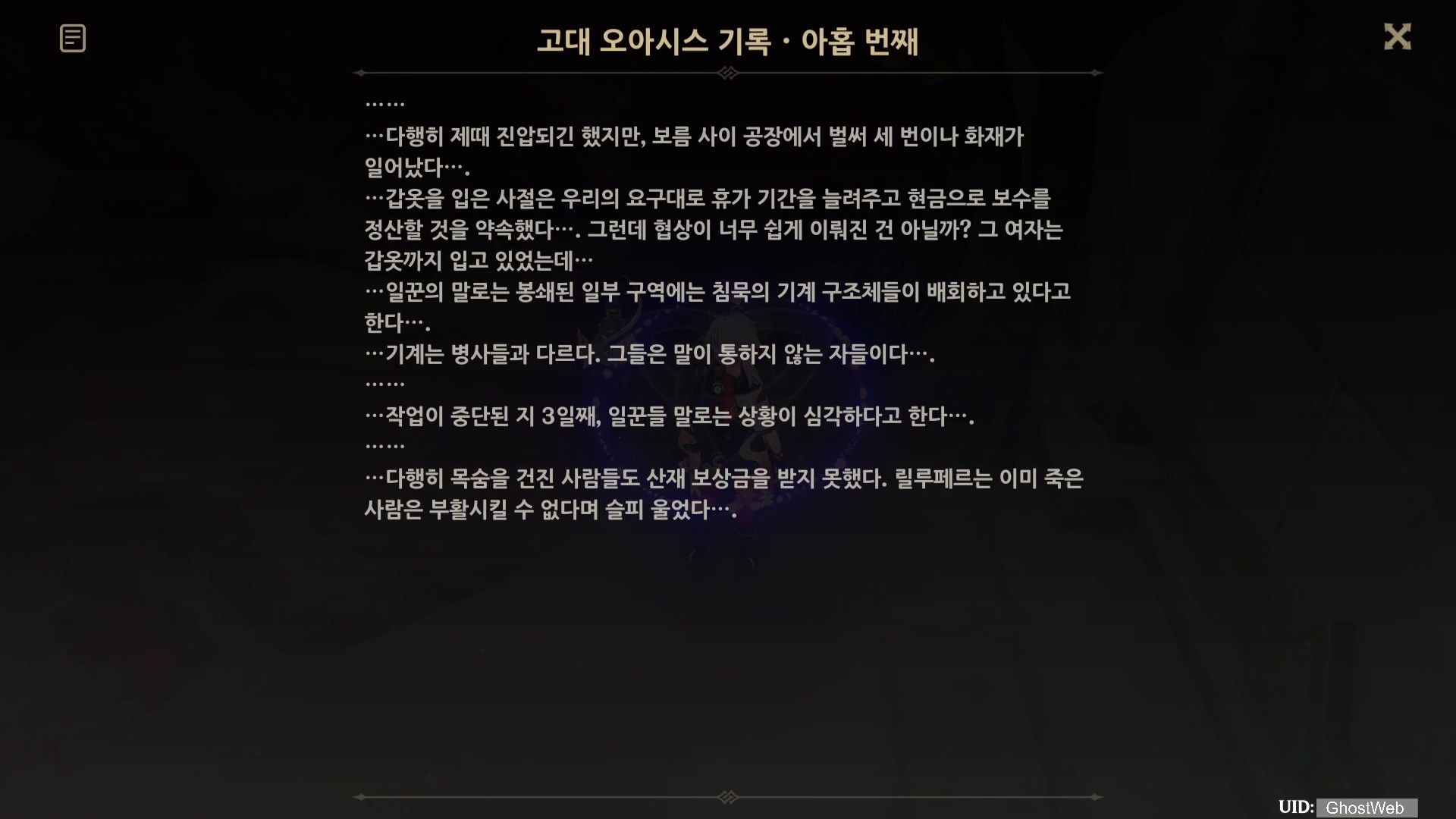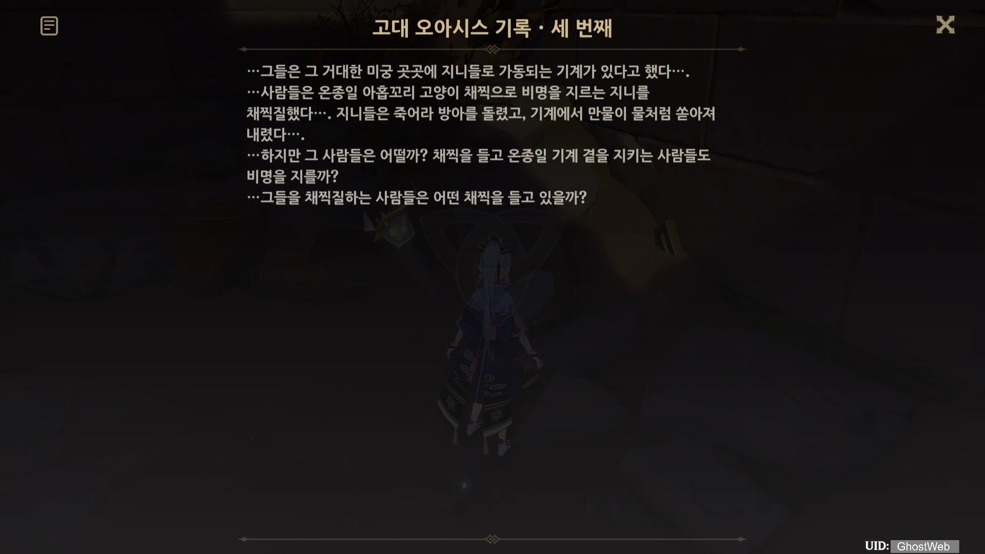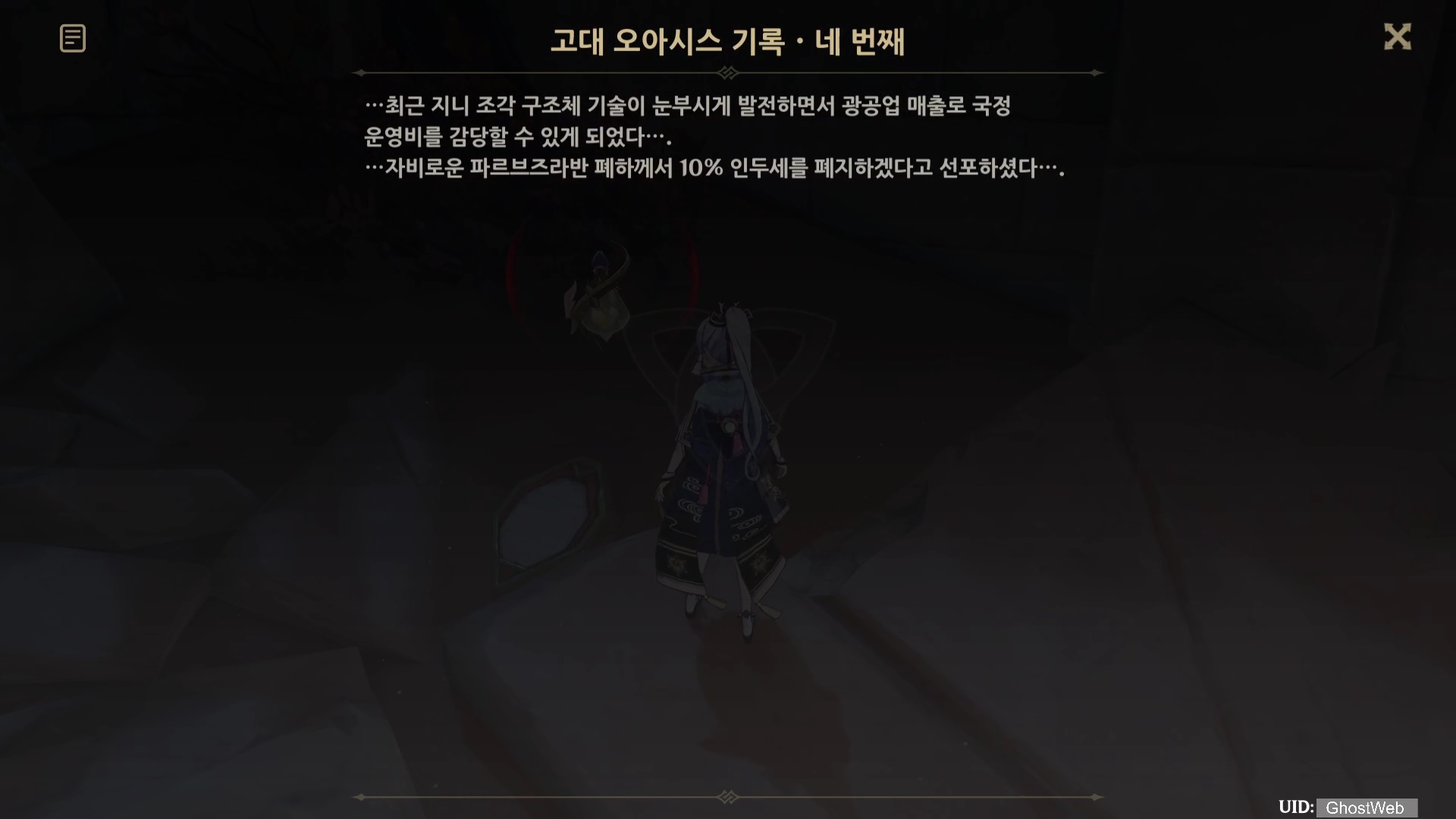 고대 오아시스 기록은 지상, 지니감실(건물 아래), 태고의 오벨리스크 근처에서 발견할 수 있어요.