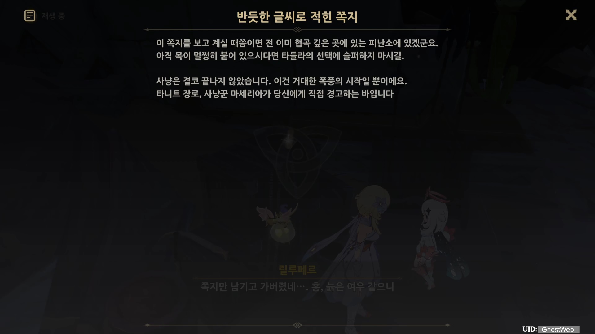 마세리아에게 이게 어떻게 된 것인지 추궁하기 위해 다시 타니트 야영지로 돌아보지만 마세리아는 어디에도 없고 쪽지가 남겨져 있는데 여행자에게 경고하는 내용으로 앞으로 진행될 월드 임무인 <극악무도한 죄의 대가>에서 어떠한 이야기인지 알 수 있어요.