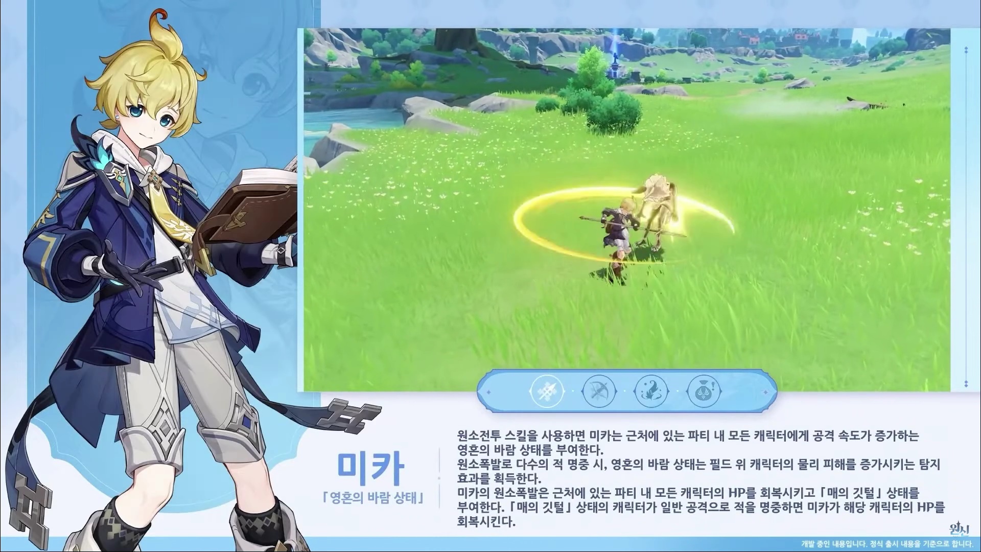 - 원소 전투 스킬을 사용하면 미카는 근처에 있는 파티 내 모든 캐릭터에게 공격 속도가 증가하는 영혼의 바람 상태를 부여한다.