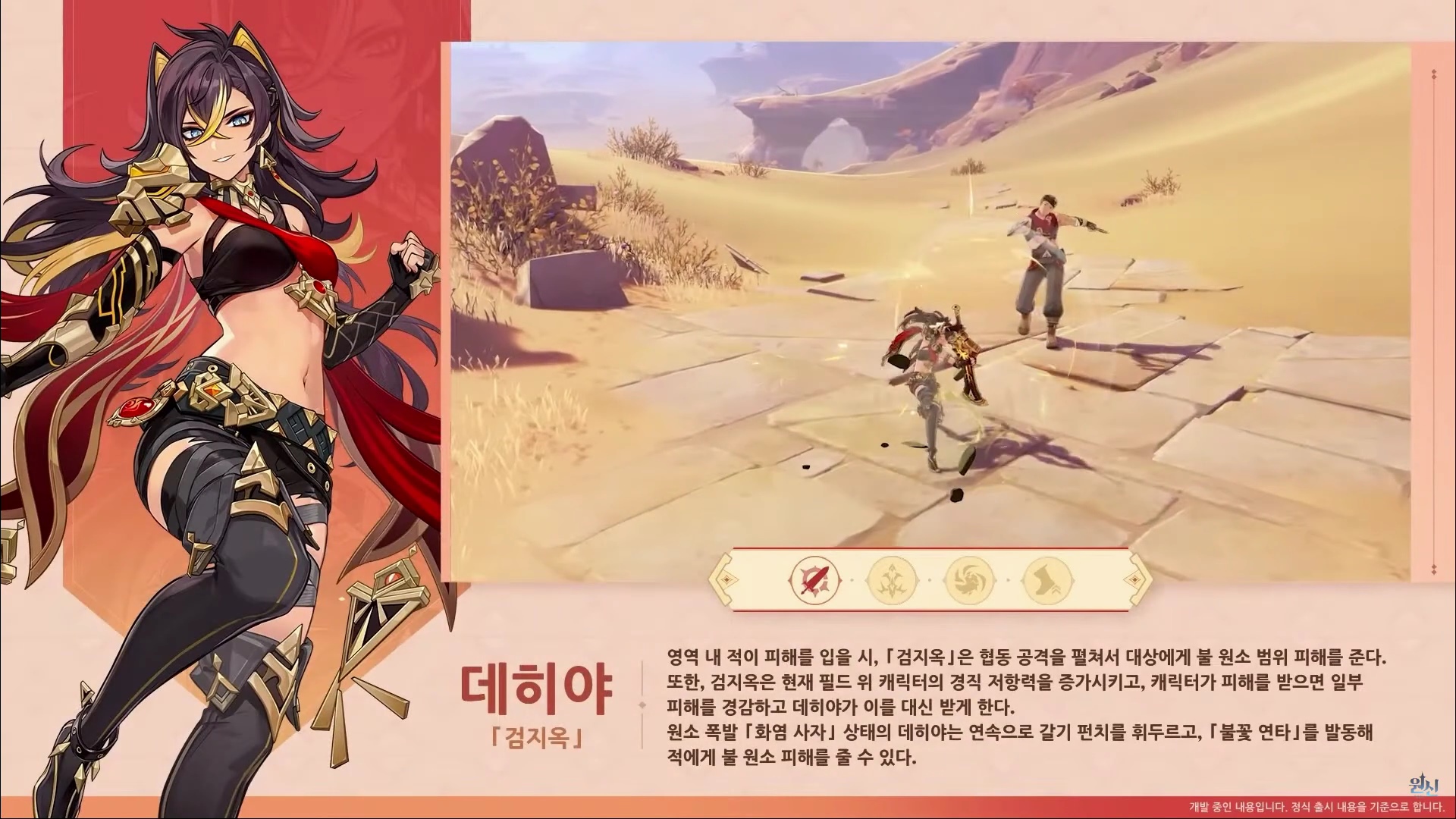 - 원소 폭발 화염 사자 상태의 데히야는 연속으로 갈기 펀치를 휘두르고, 불꽃 연타를 발동해 적에게 불 원소 피해를 줄 수 있다.