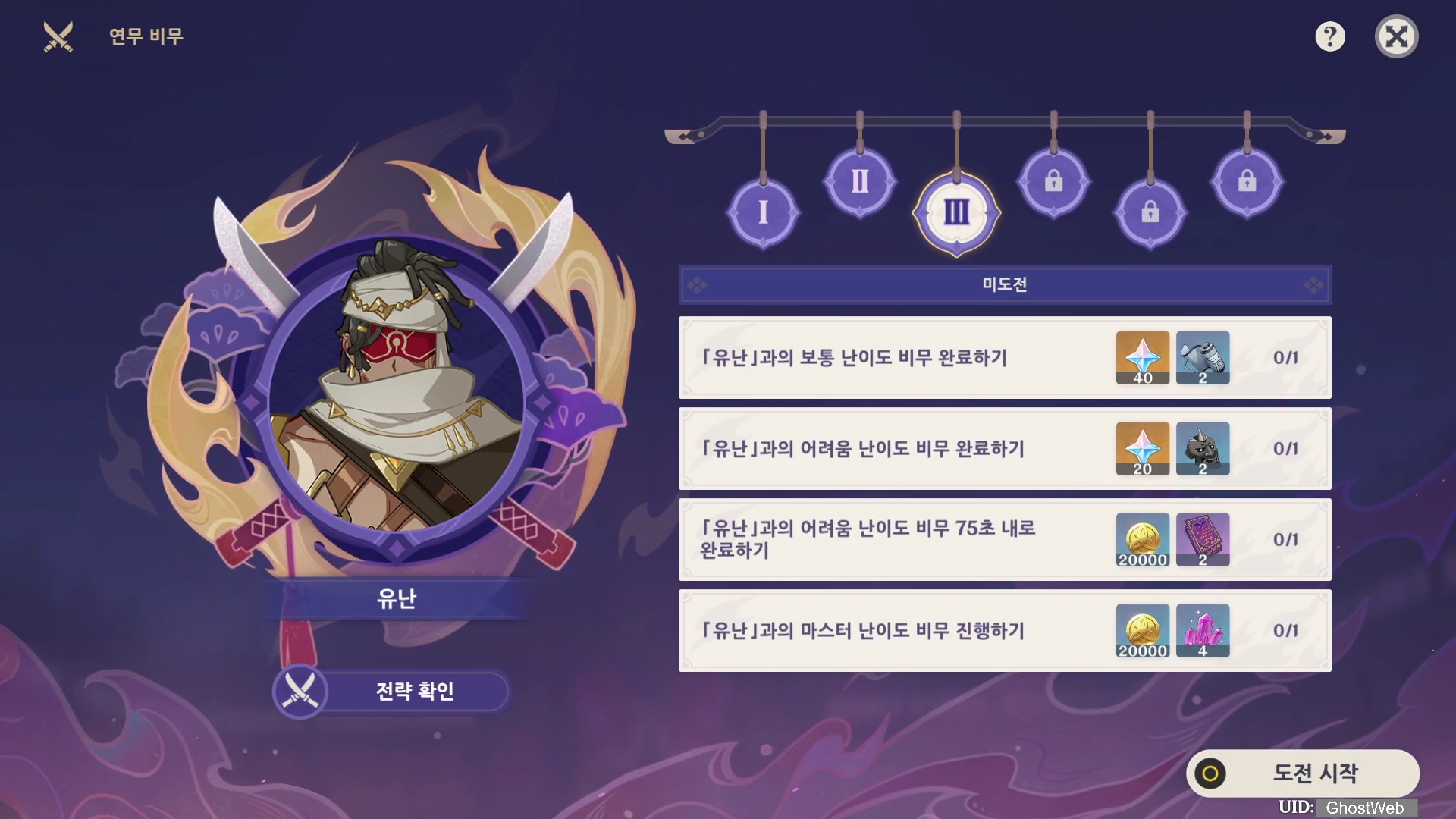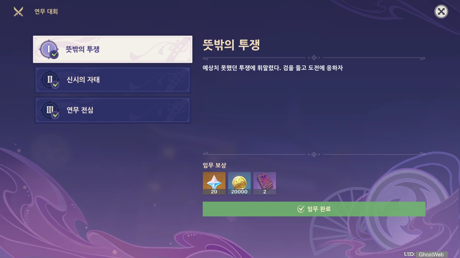 스토리는 총 3편으로 뜻밖의 투쟁, 신시의 자태, 연무 전심로 진행되고, 연무 전심에서 무사들과 대결을 통해 원석과 다양한 보상을 얻을 수 있어요.