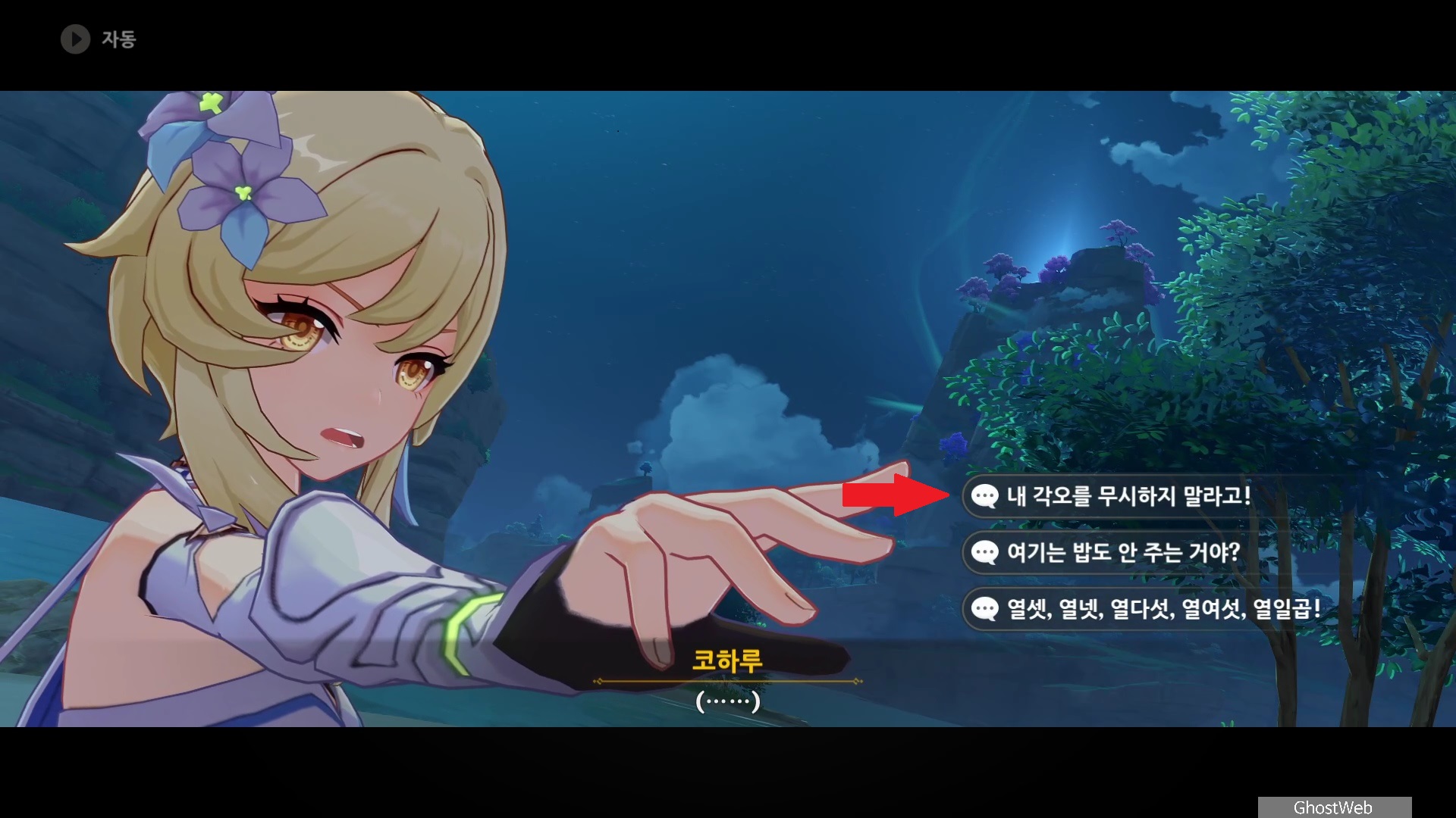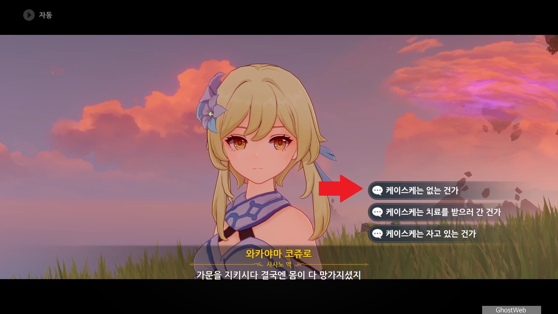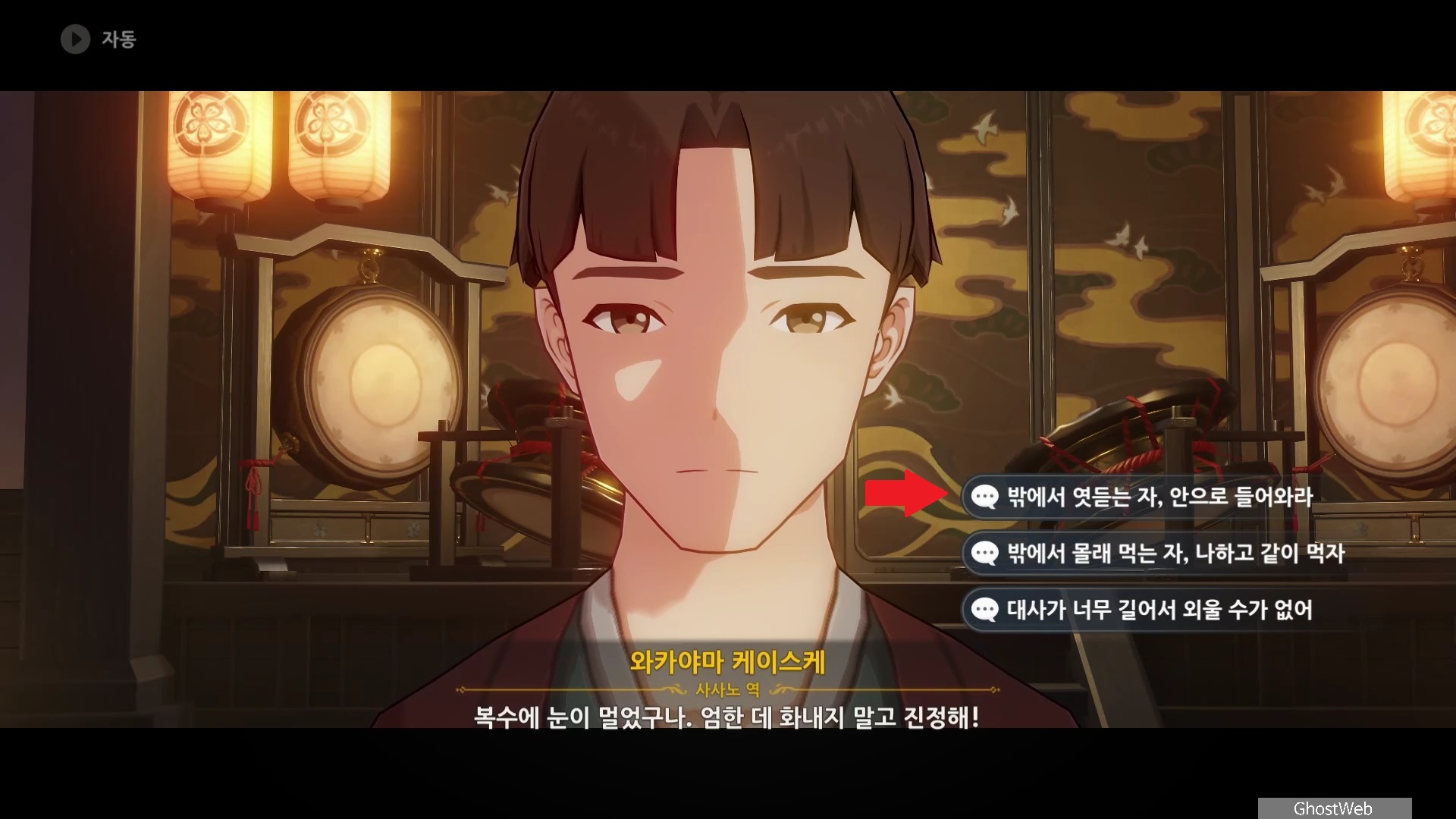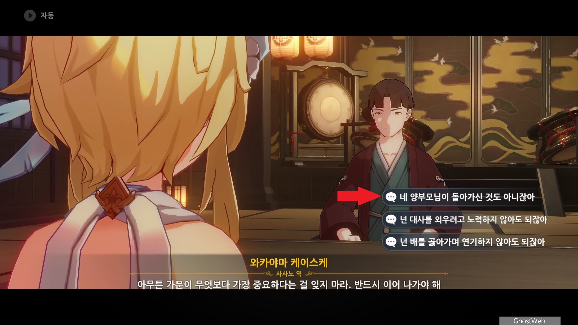 대본을 맡은 여행자는 자비에서 <파란색으로 표시한> 대로 극중 선택지를 선택하면 돼요.