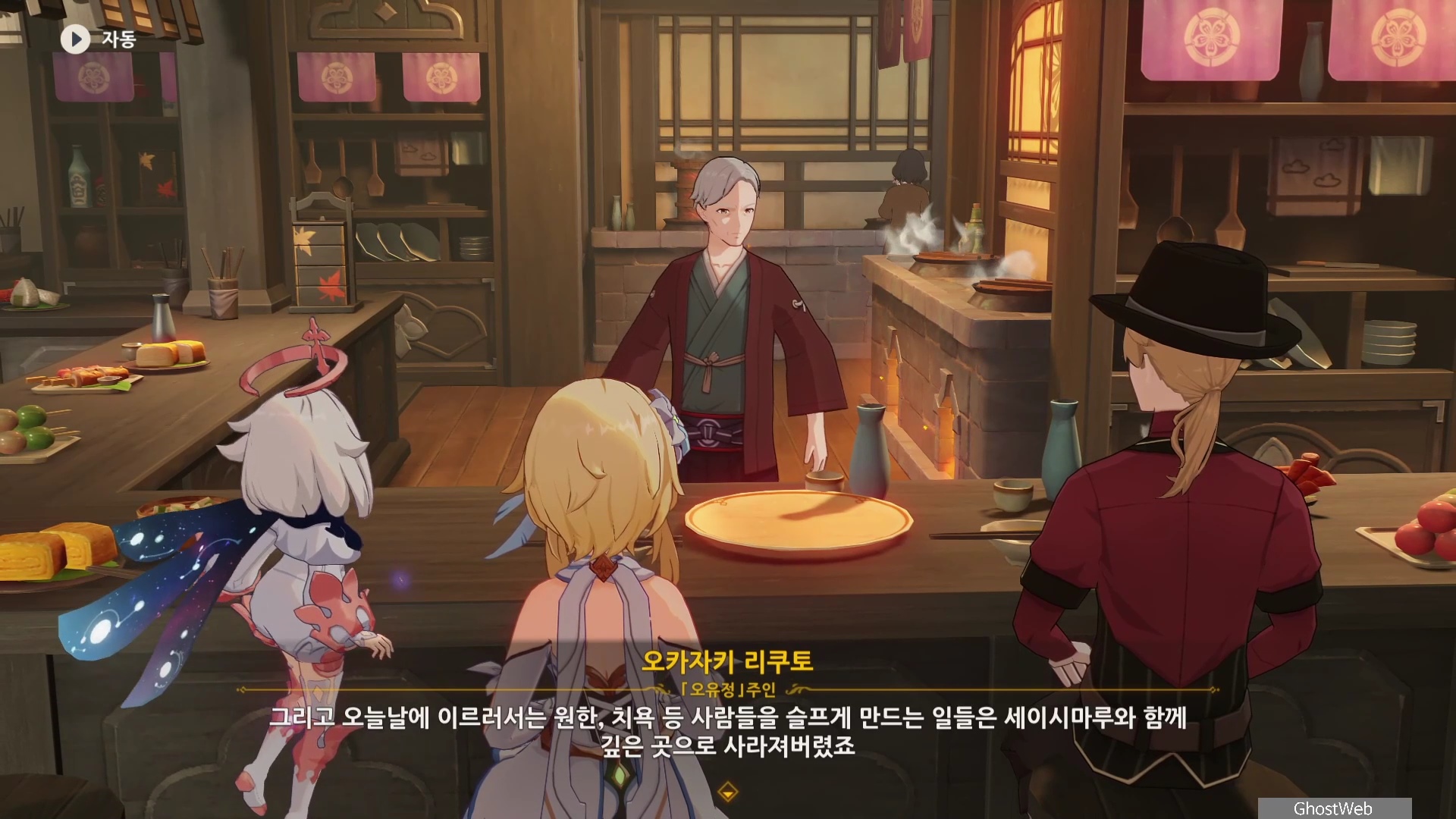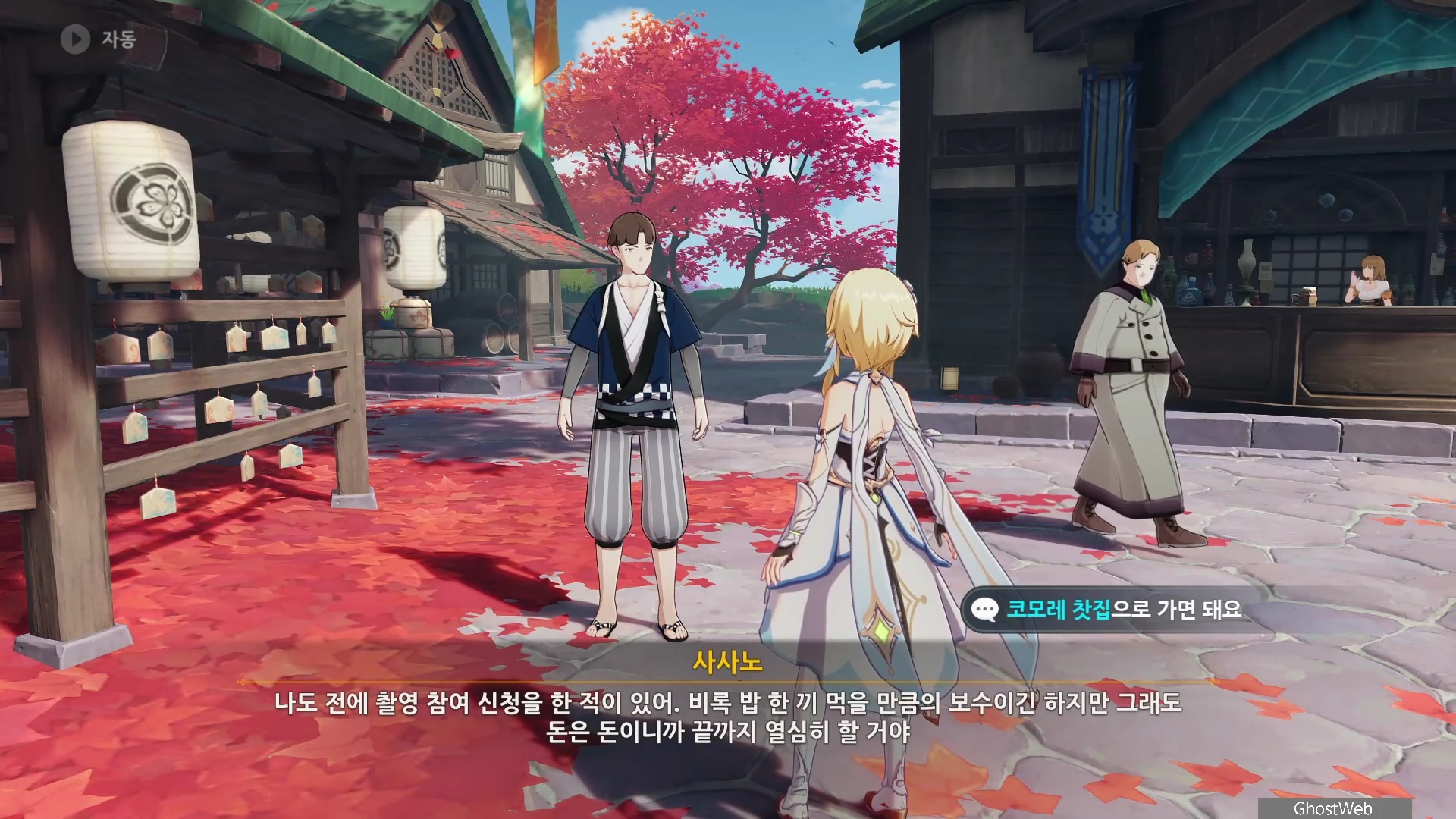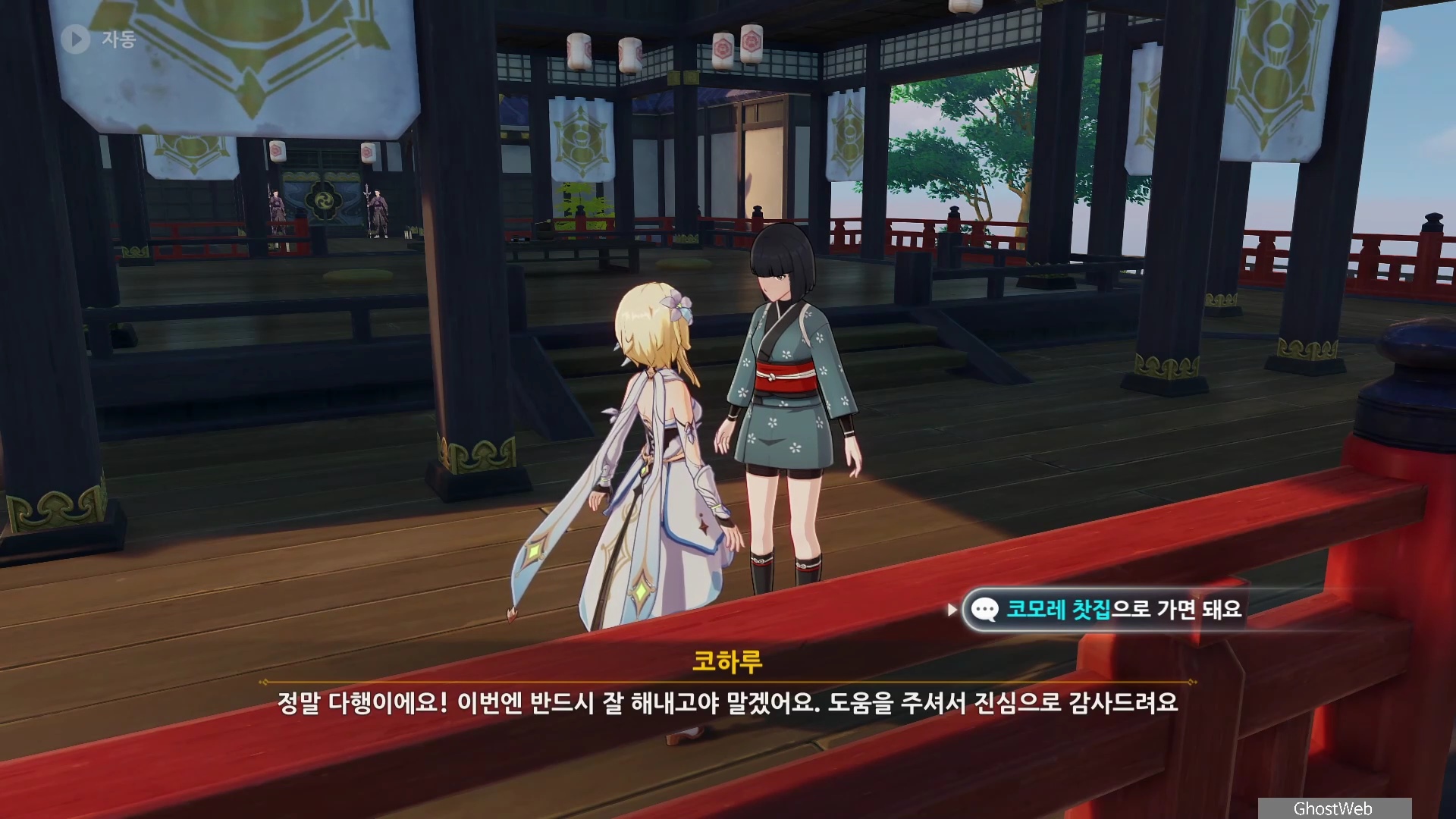 오유정에서 주인인 오카자키 리쿠토에게 영감을 얻고 자비에는 다시 새 시나리오를 쓰러 가고 내일 코모레 찻집에서 보자고 하며 떠나며 여행자와 페이몬은 이런 자비에를 돕기 위해 이도에 있는 사사노와 카미사토 저택에 있는 코하루에게 찾아가 다음날 코모렛 찾집으로 모이기로 해요.