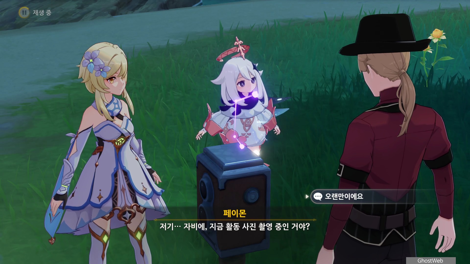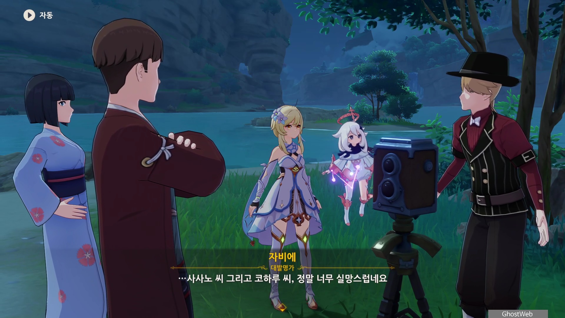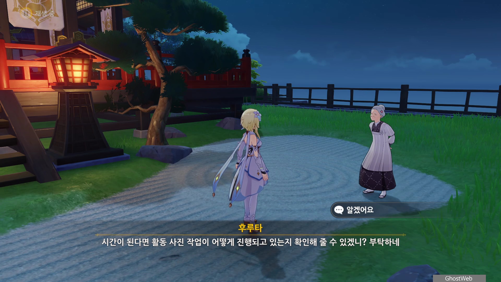 후루타와 대화를 통해 폰타인에서 자비에가 활동 사진을 만들겠다며 카미사토 가주에게 허락받고 저택에서 일하는 하루코에게 자비에를 도와주라는 부탁을 했는데, 후루타는 하루카가 자비에가 마음에 안드는 눈치여서 걱정된다며 여행자에게 활동 사진 작업이 어떻게 진행되고 있나 확인을 부탁해요.