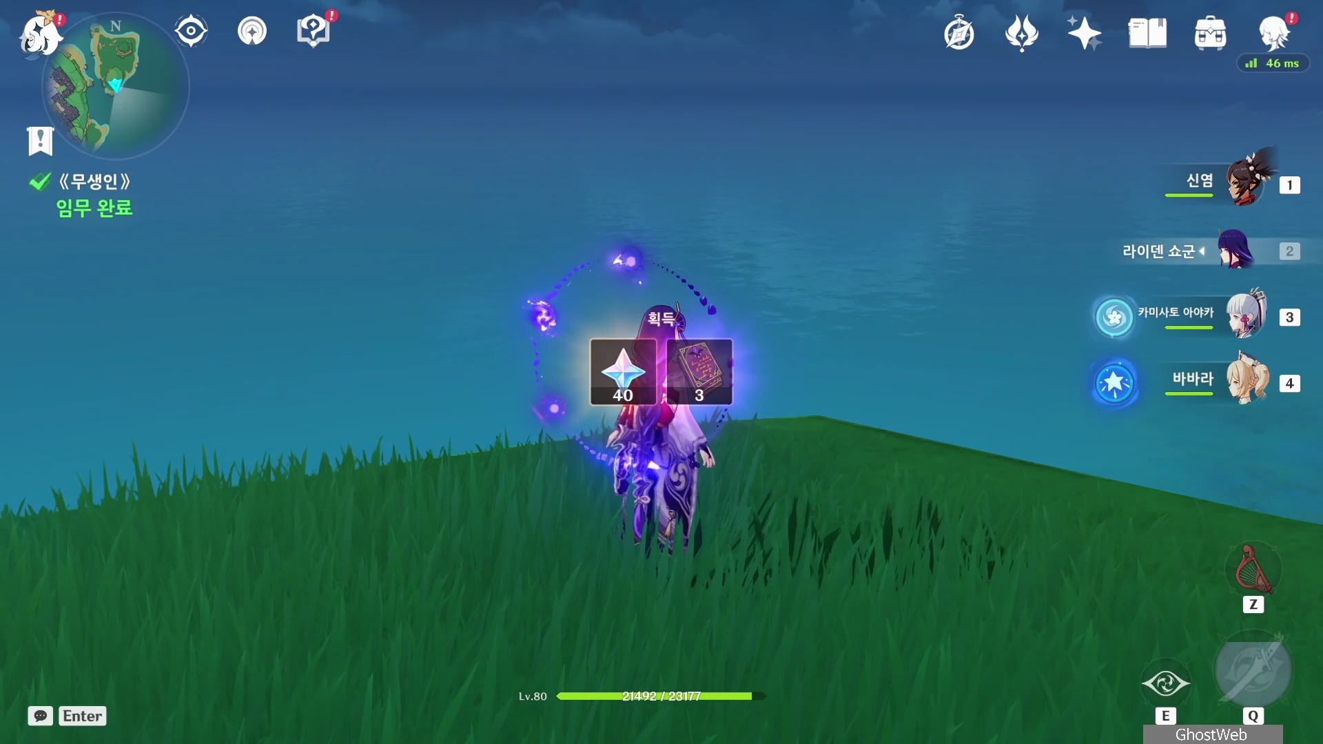 여행자의 점프를 마지막으로 촬영이 종료되며 다시 자비에와 대화를 하면 임무 완료 보상으로 원석 40개 등을 얻을 수 있어요. (번개 씨앗 얻어서 위로 이동하기)