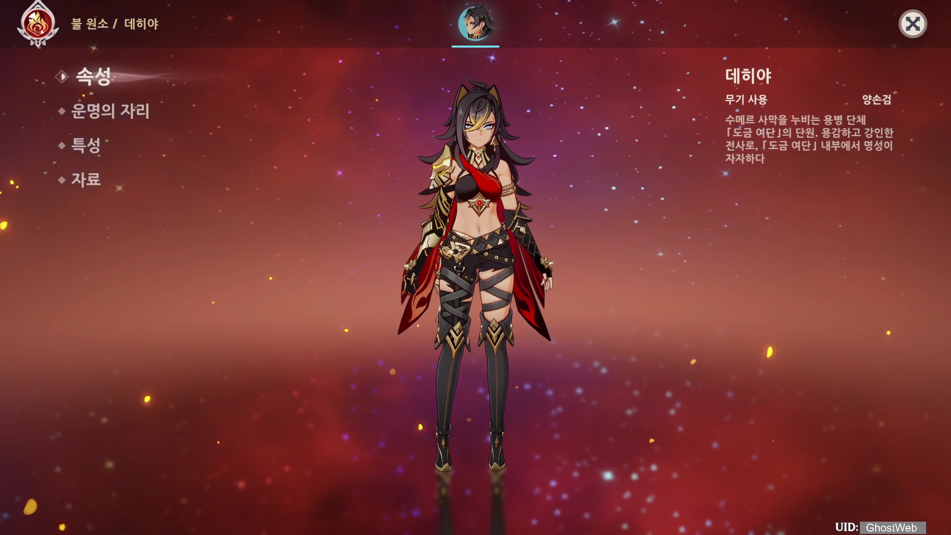 데히야는 불 원소 양손검 캐릭터로 딜러 포지션을 가지고 있으며 데히야의 HP 최대치가 공격력에 역할을 줘요.